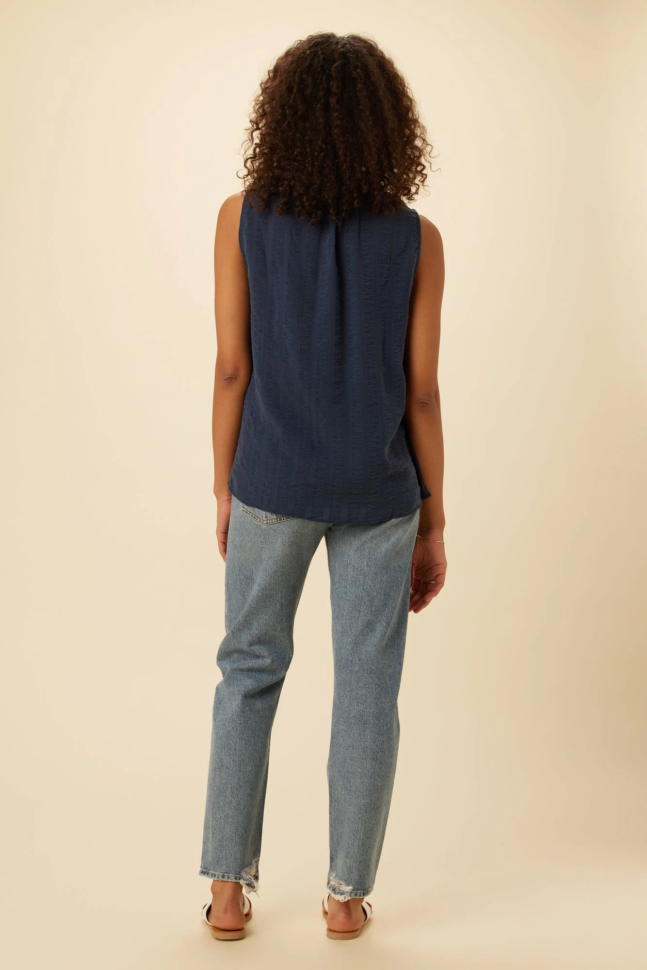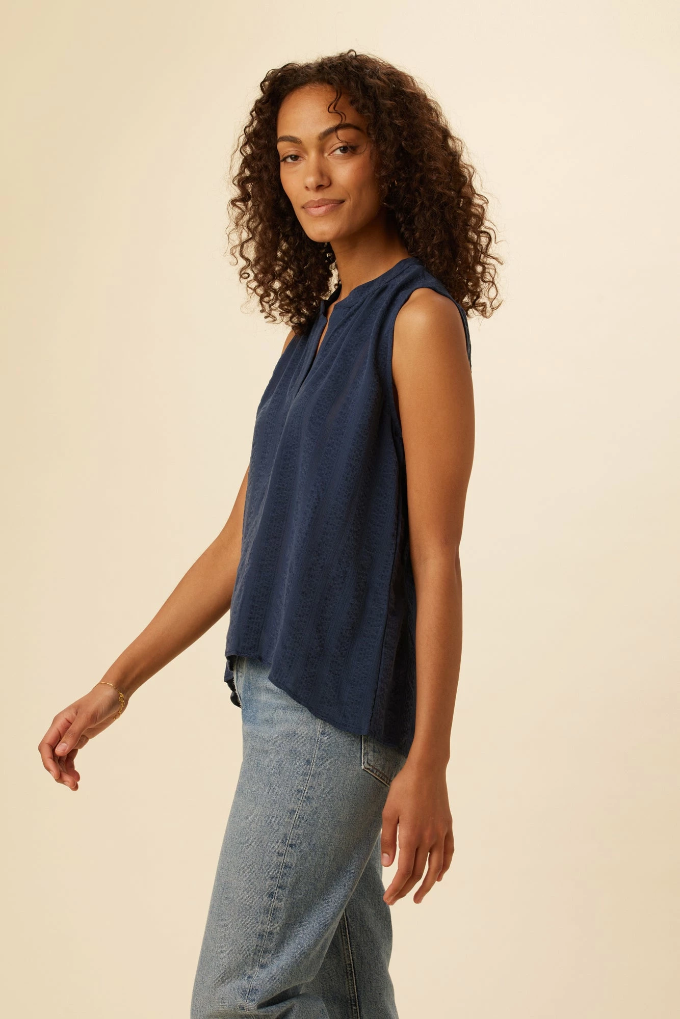 Relaxed fit, sleeveless high-low blouse with faux placket in the front. This versatile top is perfect paired with your favorite high-rise or mid-rise bottoms.