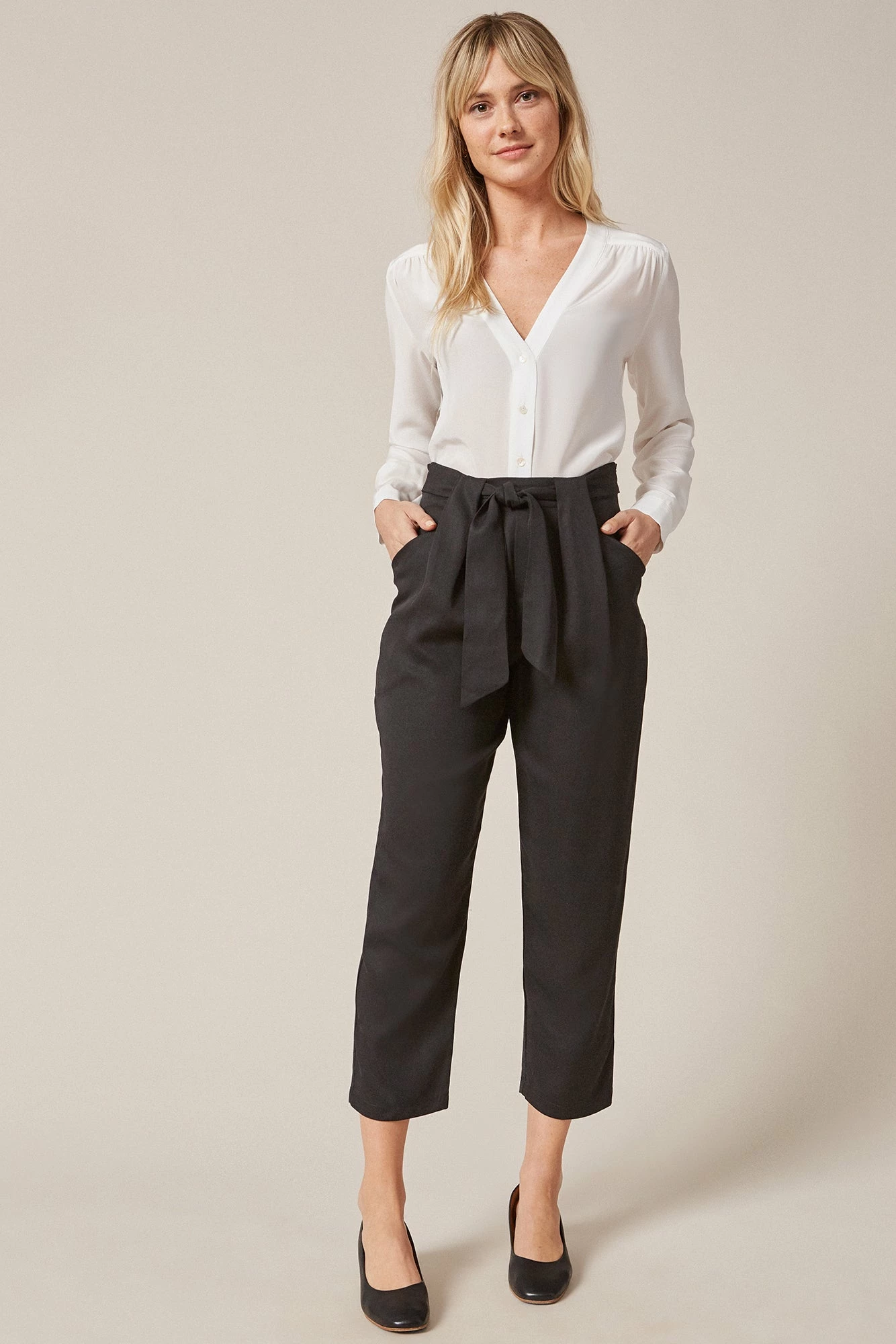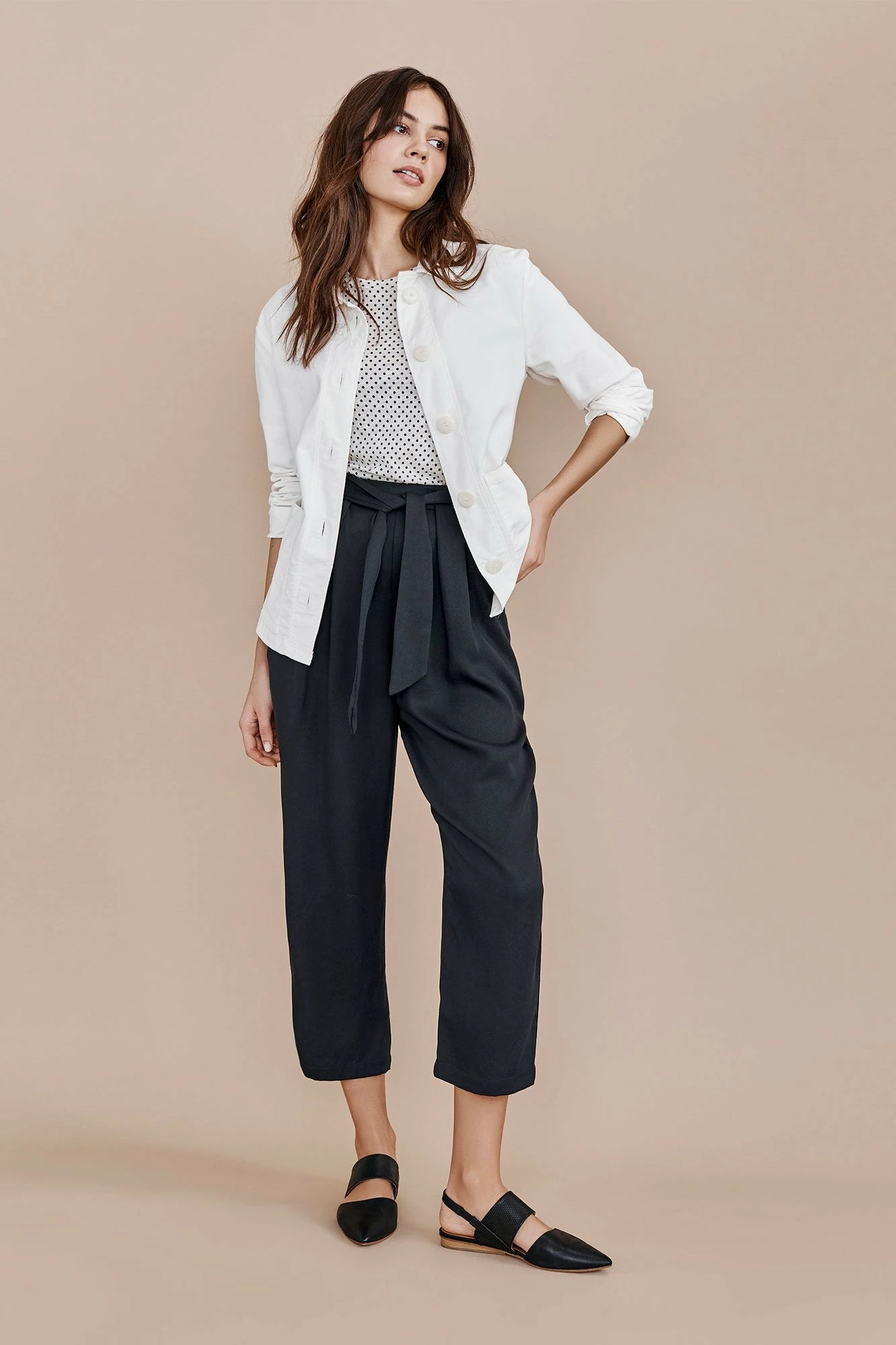 We brought back Anissa in a new TENCEL™ twill fabric. Our best selling pant features a cropped silhouette, tie waist, and pleated front. Our TENCEL™ is made from eucalyptus and is more absorbent than cotton, softer than silk and cooler than linen.