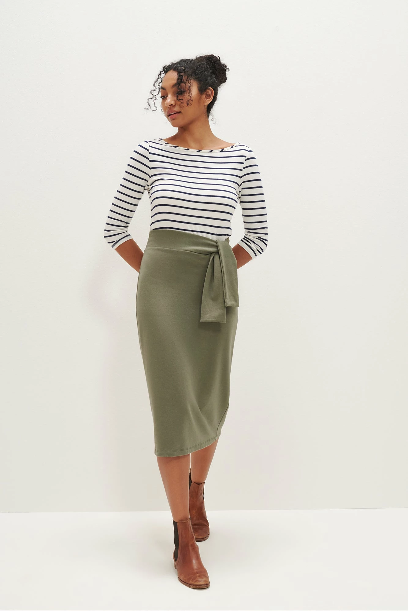 High waisted midi skirt with an adjustable waist tie. Made in Reverie Terry, our softest blend of Organic Cotton and Modal.