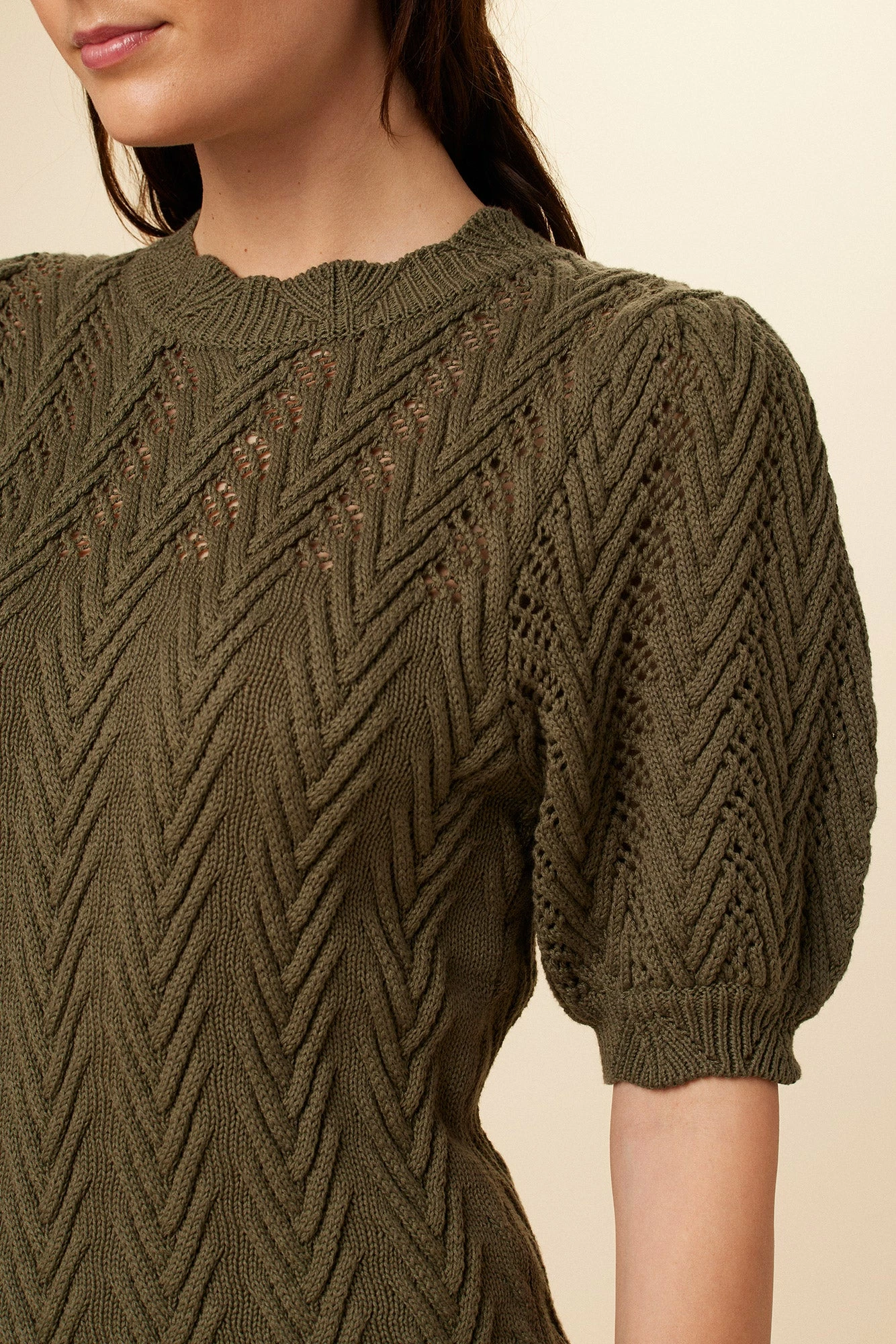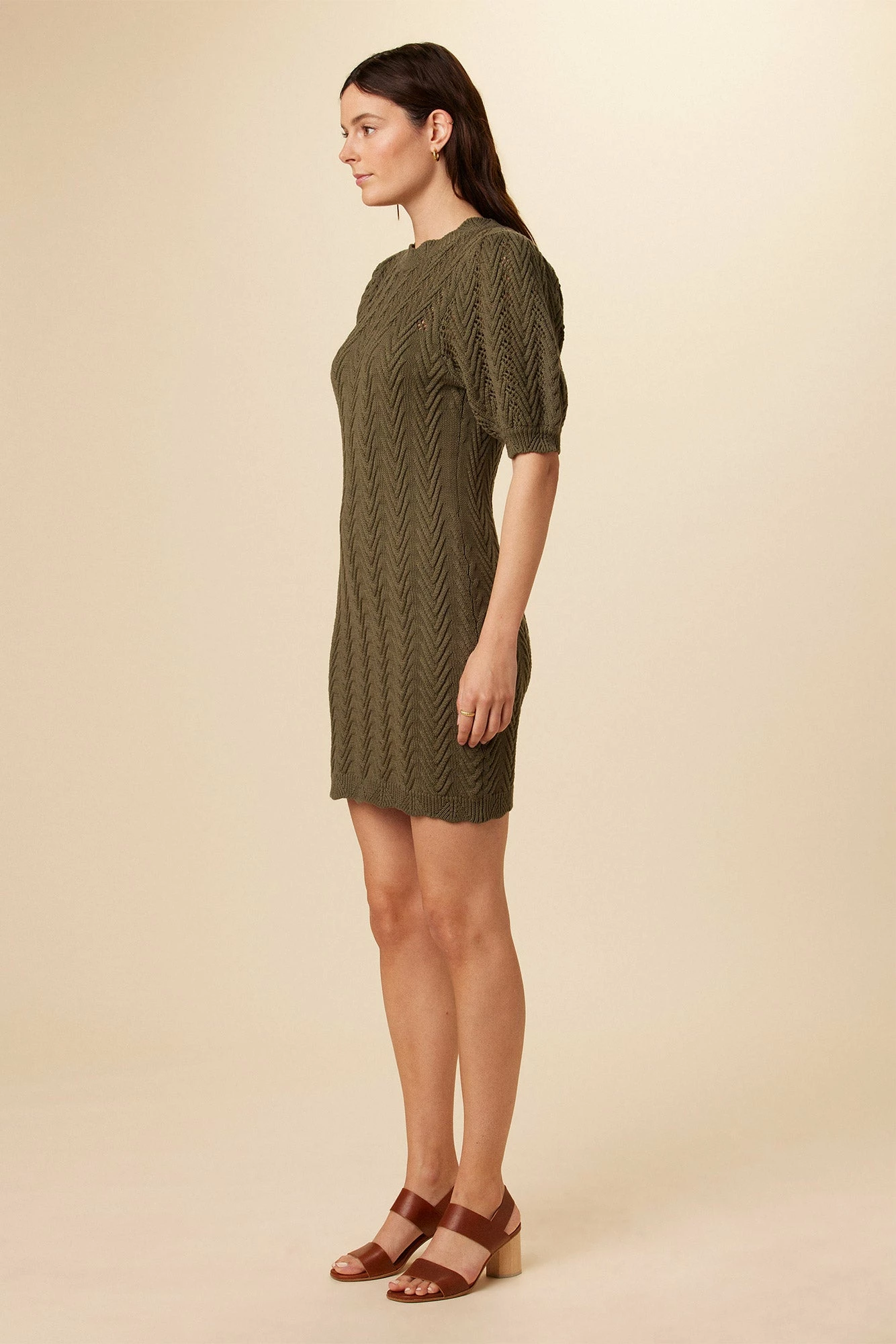 Slim fit dress featuring puff sleeves, scallop detailing on neck, sleeves and hem and closed v-stitch detailing from yoke to hem, made from our sustainably sourced organic cotton.