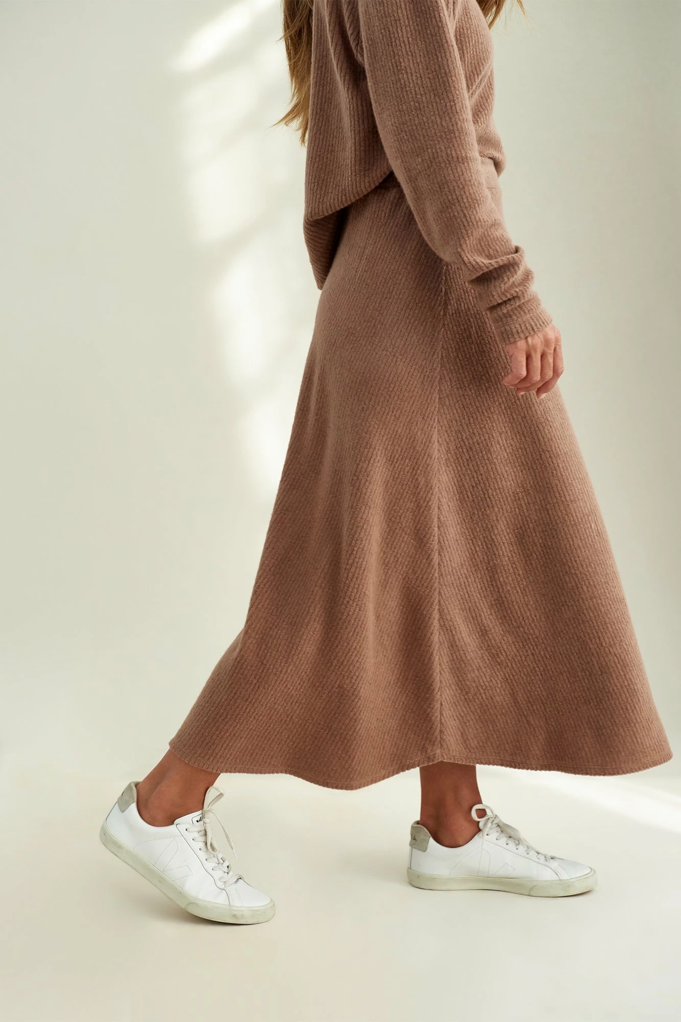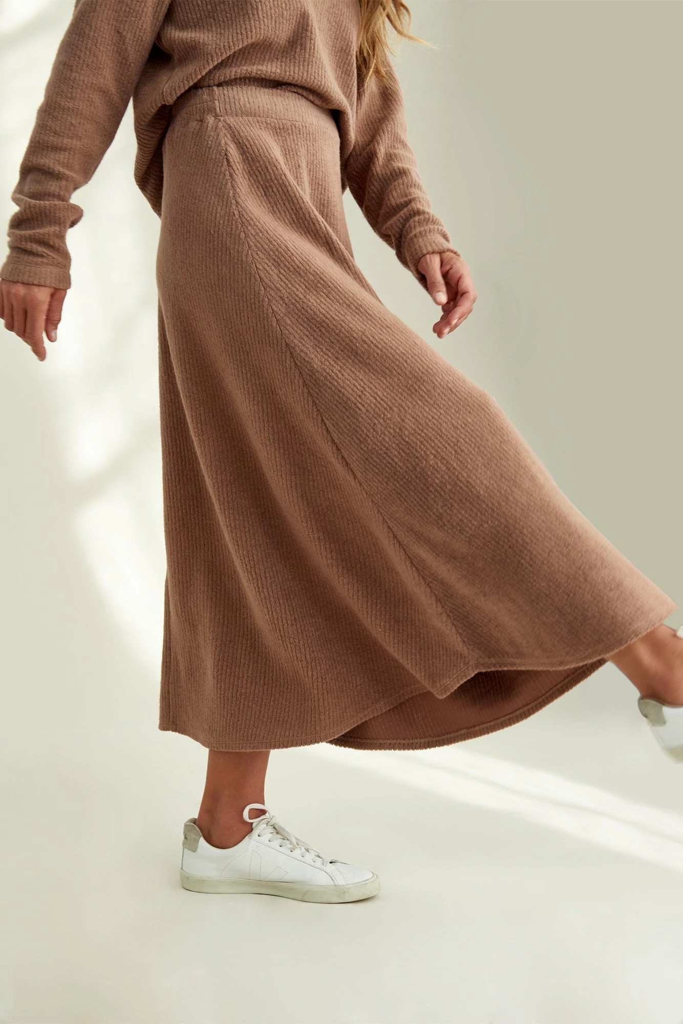 Voluminous midi skirt with a flat front and elastic waist in back. Stay soft in our dreamy Cloud Rib, a luxe blend of Organic Cotton and Modal.