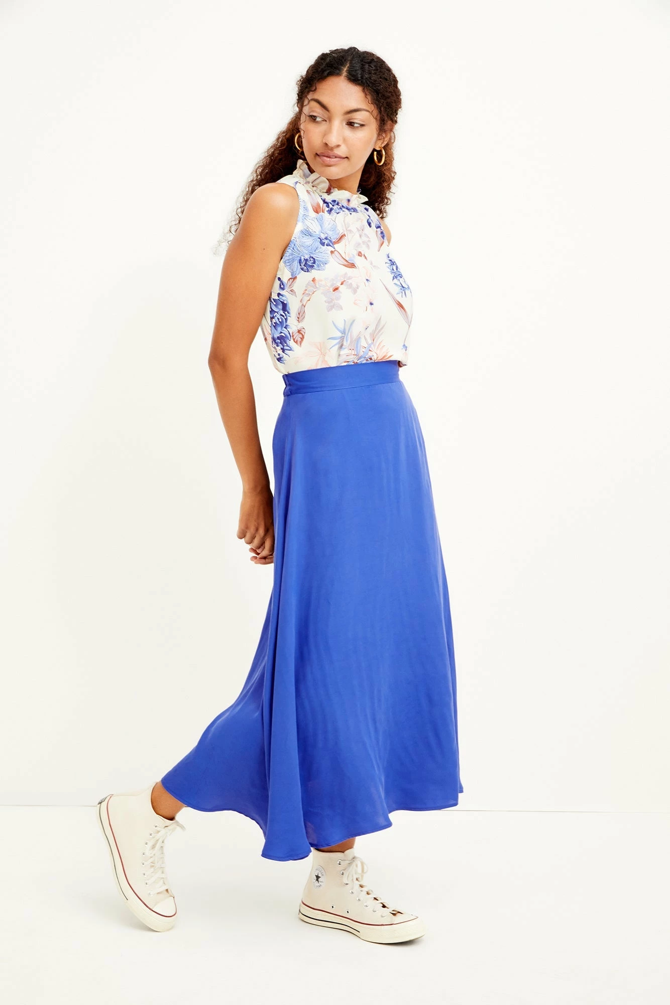 Voluminous midi skirt with a flat front and elastic waist in back, made in our softest plant-based silk alternative, Cottonseed Cupro.