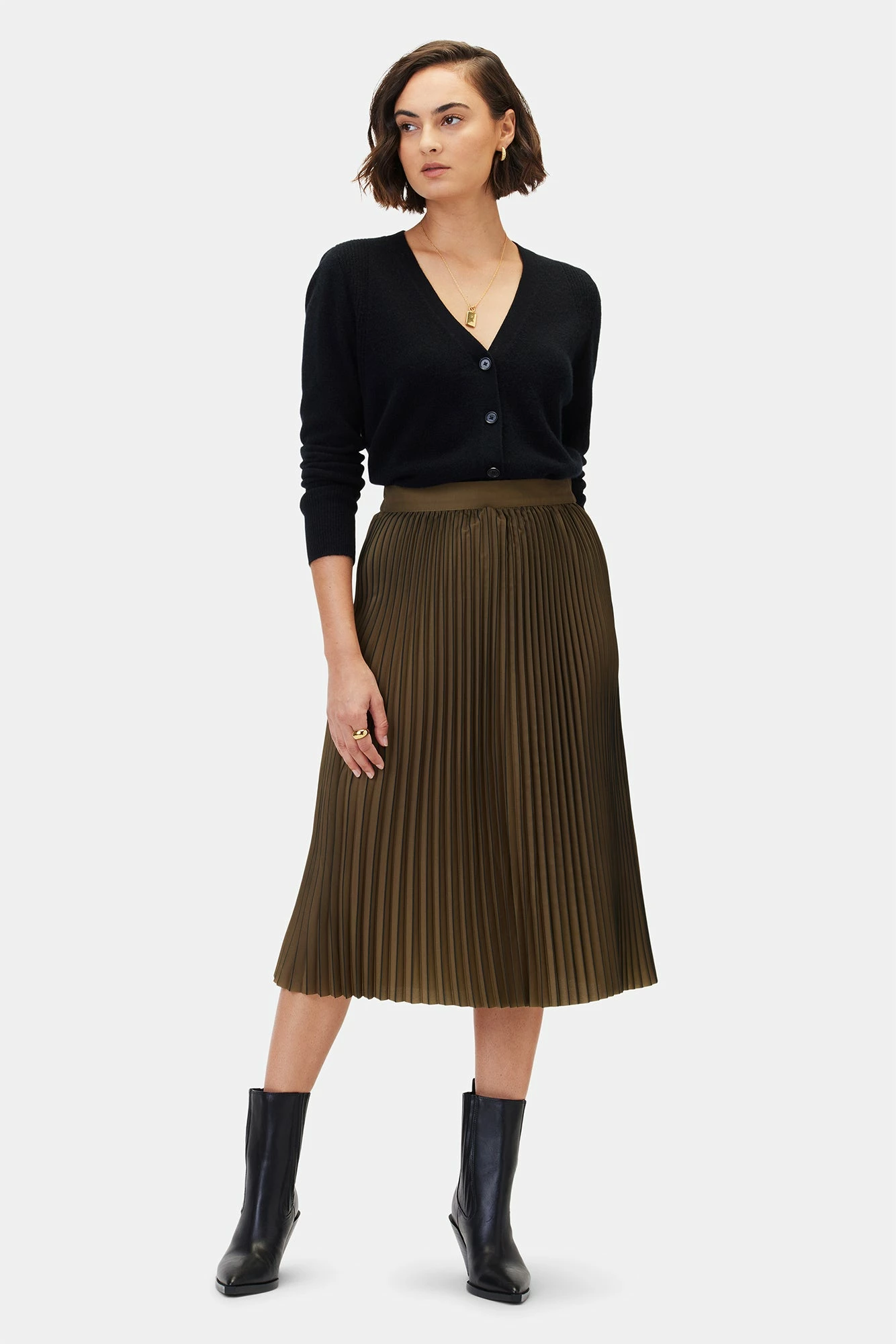 - Midi length A-line skirt with pleated detail.