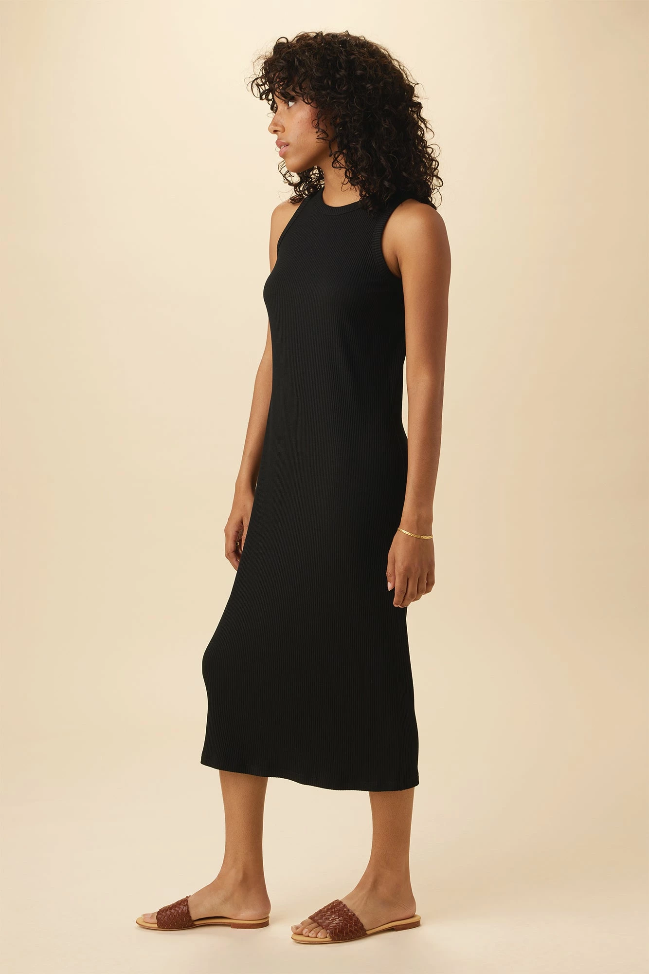 - Sleeveless racerback midi dress featuring thick strap bands, high crewneck and midi length.