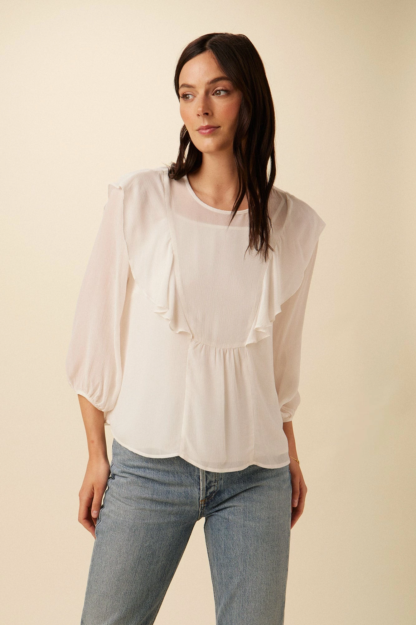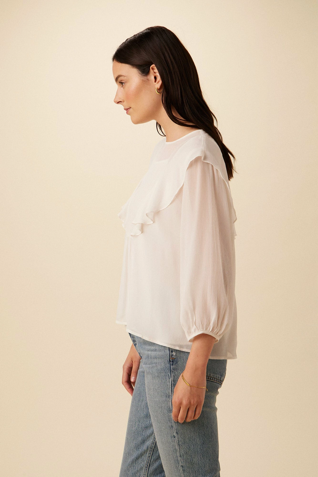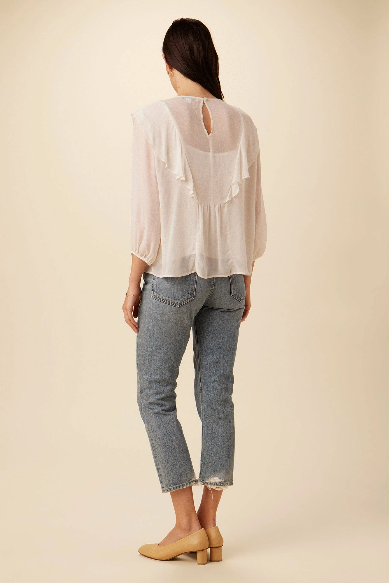 3/4 sleeve, relaxed fit blouse with ruffle detailing and a recycled polyester cami lining. We suggest pairing with your favorite mid-rise or high-rise bottom. Made in our silky-soft Cottonseed Cupro.