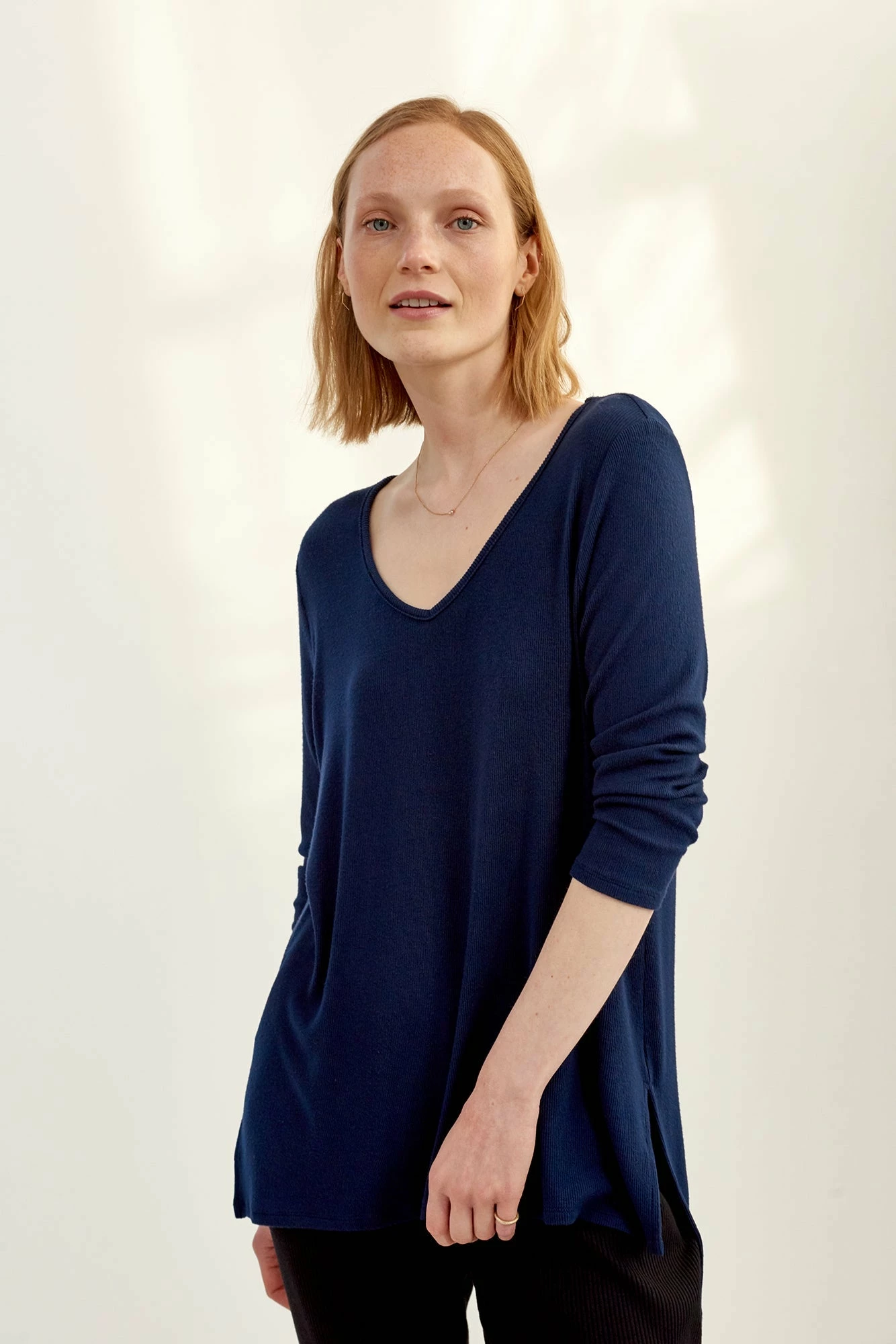 Flowy t-shirt with 3/4 length sleeves, a v-neckline, and side slits. Made in our silky smooth Dream Rib, this is the ultimate lounge piece.