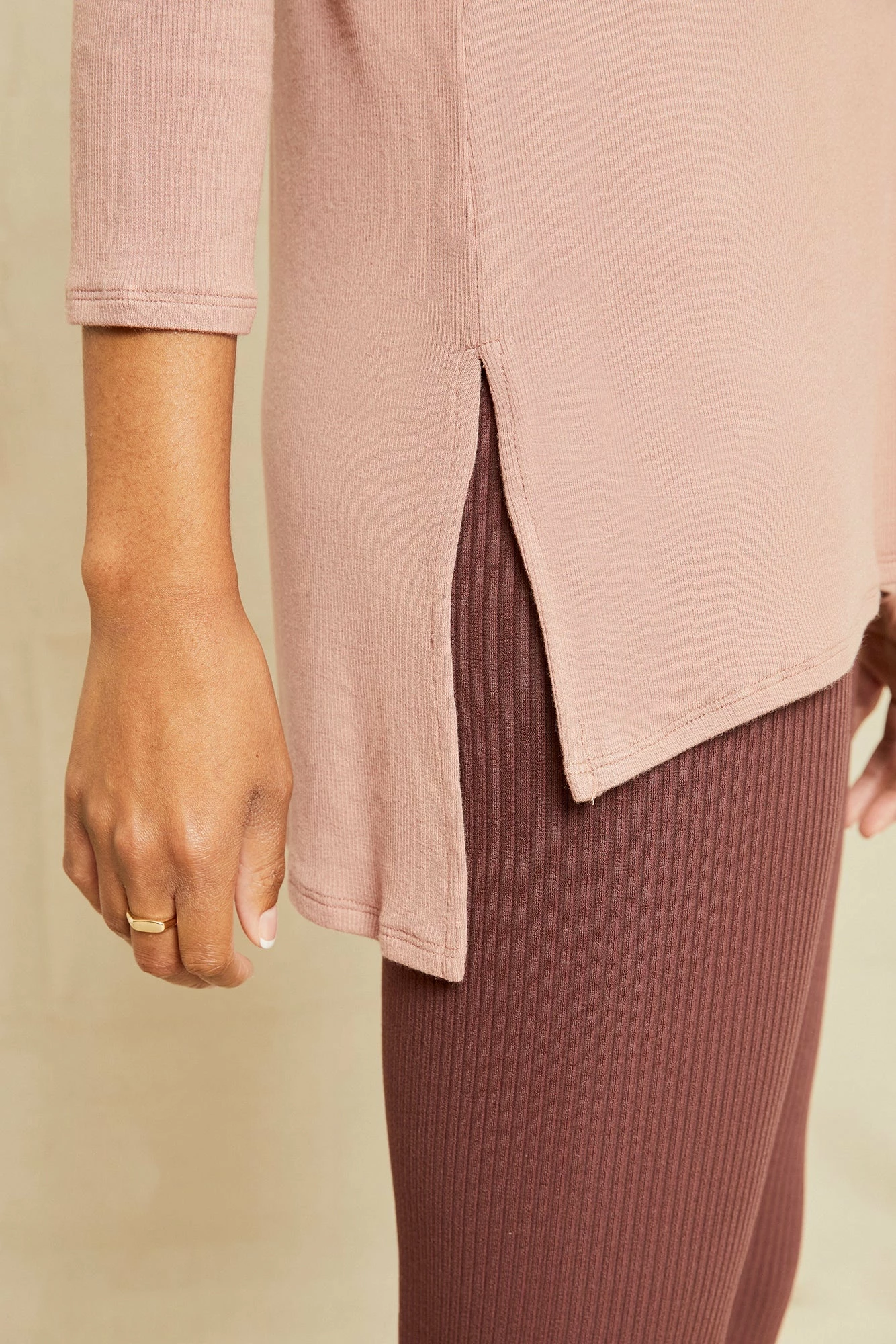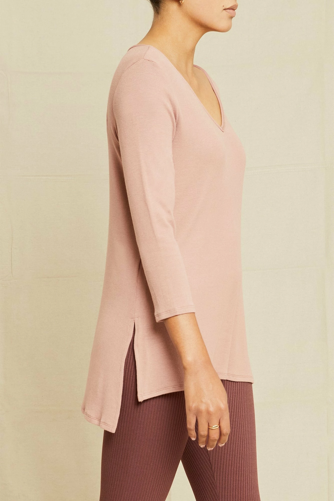 Flowy t-shirt with 3/4 length sleeves, a v-neckline, and side slits. Made in our silky smooth Dream Rib, this is the ultimate lounge piece.