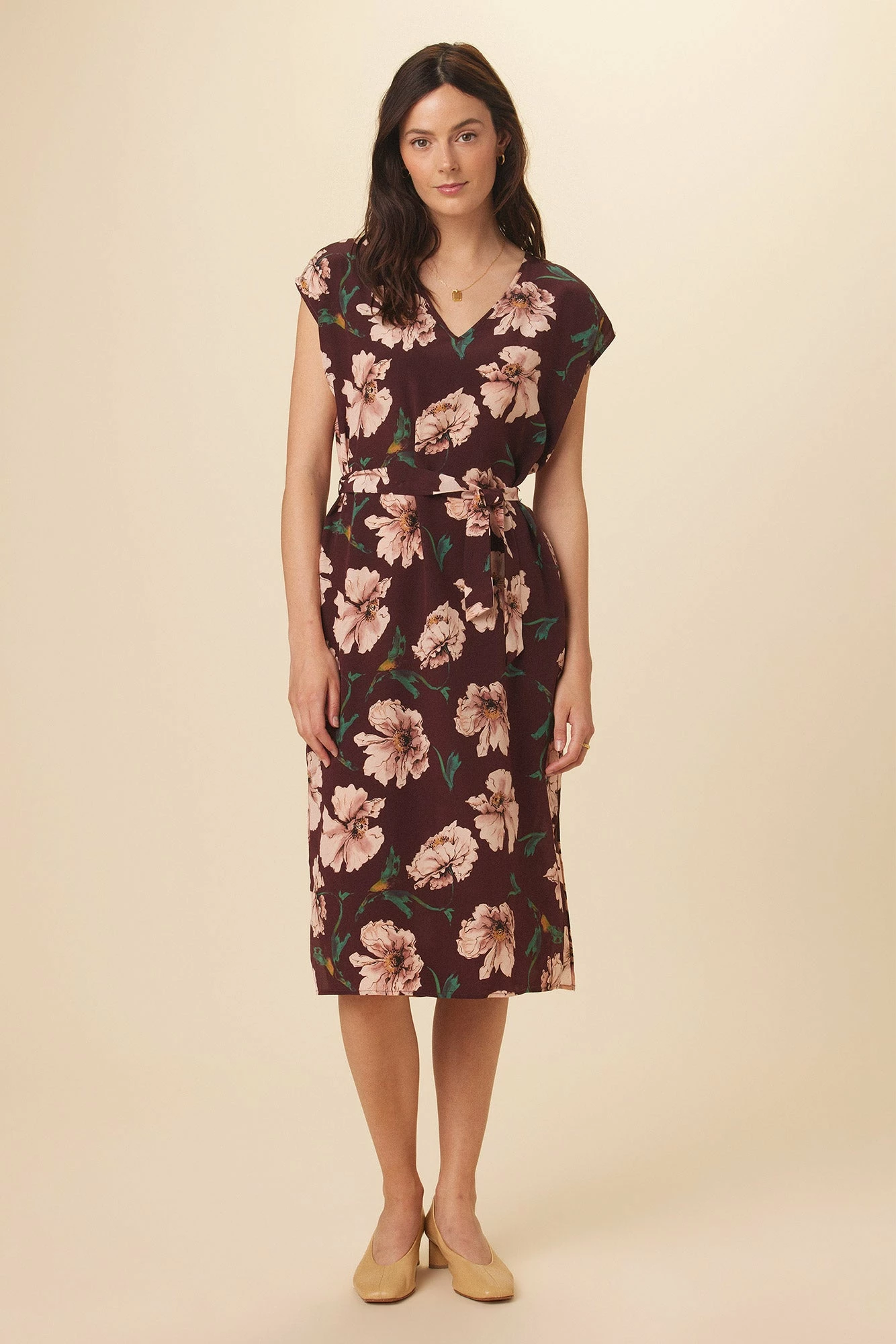 Short sleeve midi dress with side pockets, side slits, and an adjustable tie at the waist. Made from our luxurious Washable Silk, this piece will have you dreaming of your next tropical getaway.