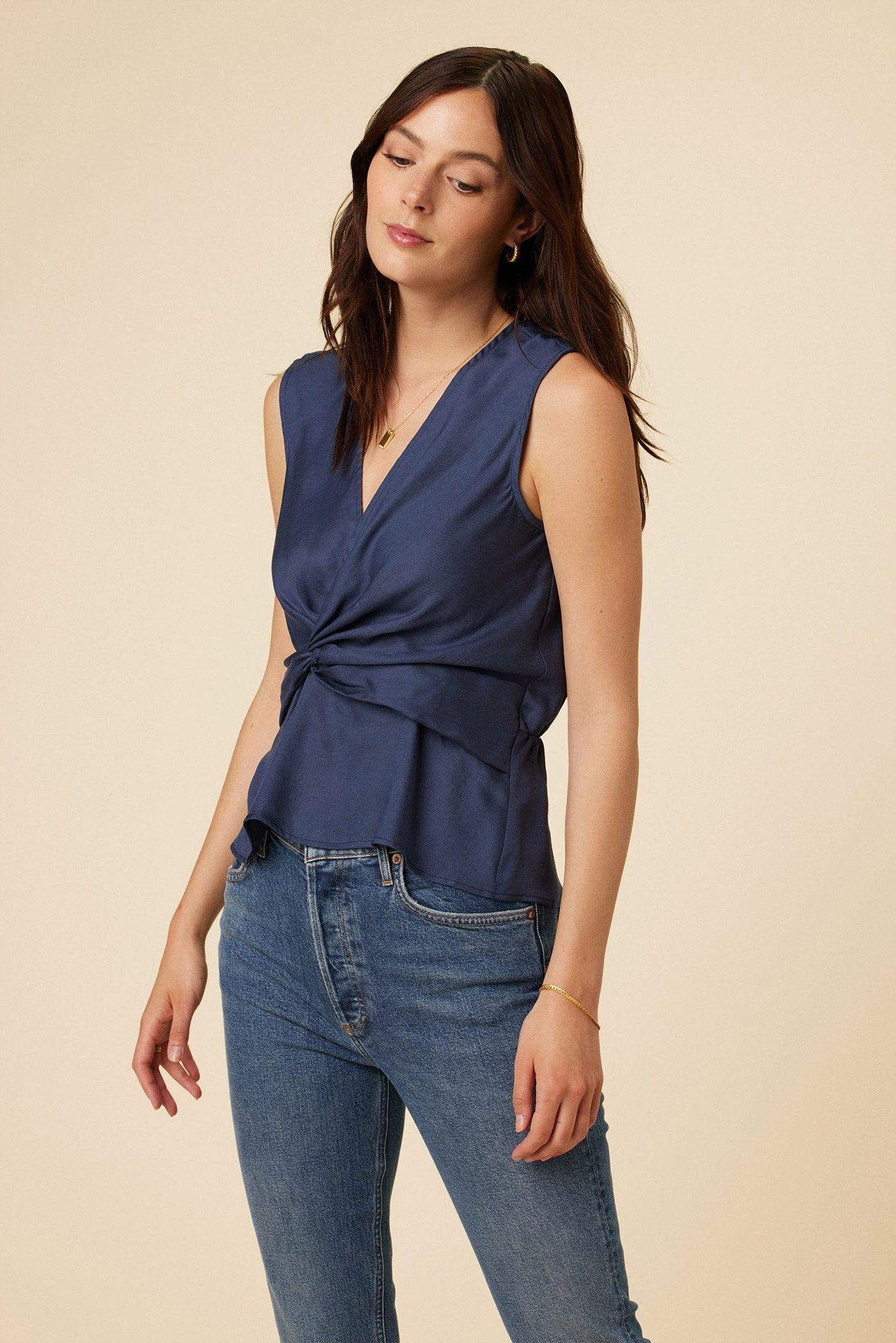 Twist front blouse with loop and button at back, we suggest pairing untucked with your favorite high rise bottom. Made from TENCELâ„¢, a fabric derived from eucalyptus trees that is softer than silk and cooler than linen. TENCELâ„¢ gauze is very delicate, please handle with care.