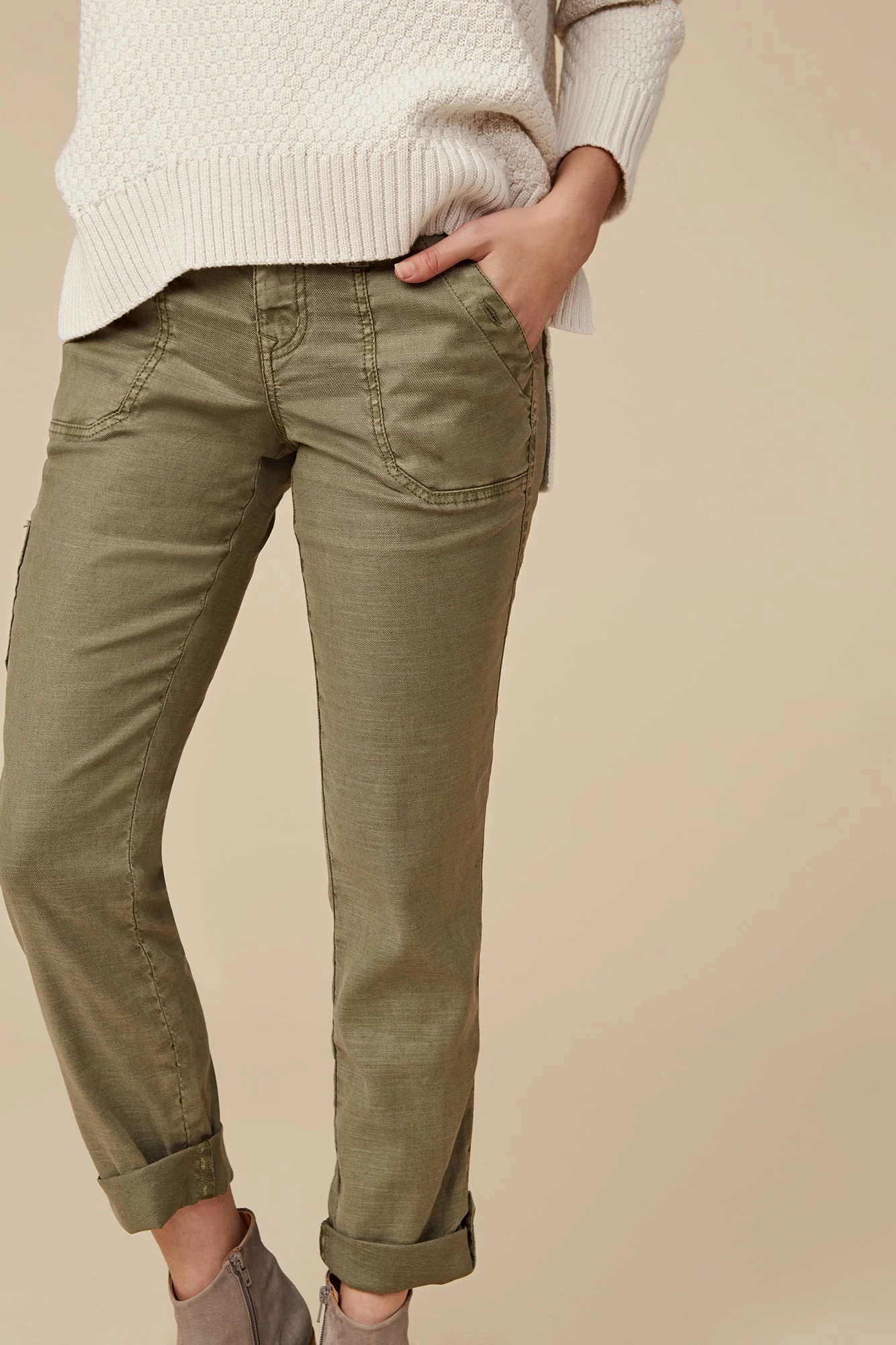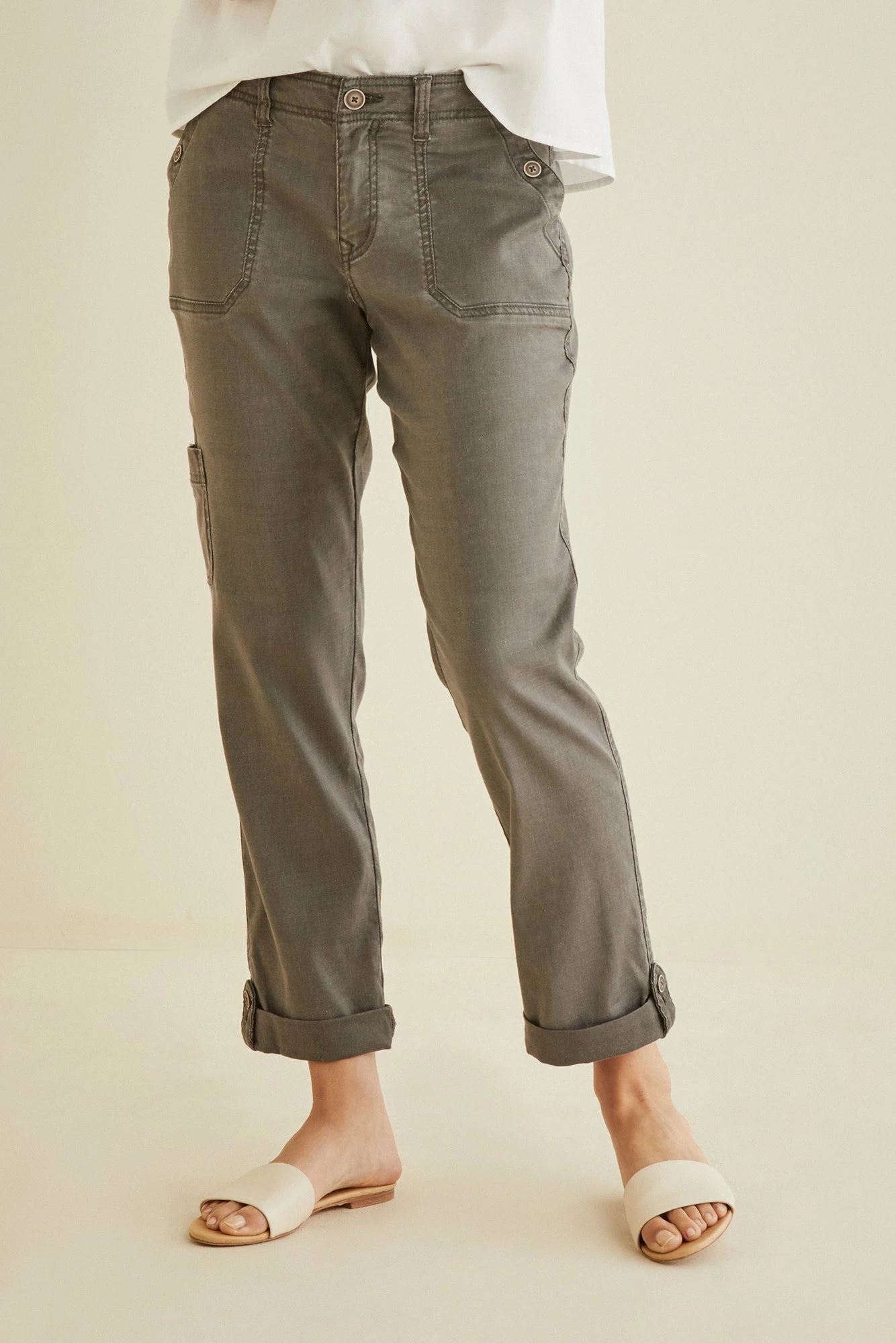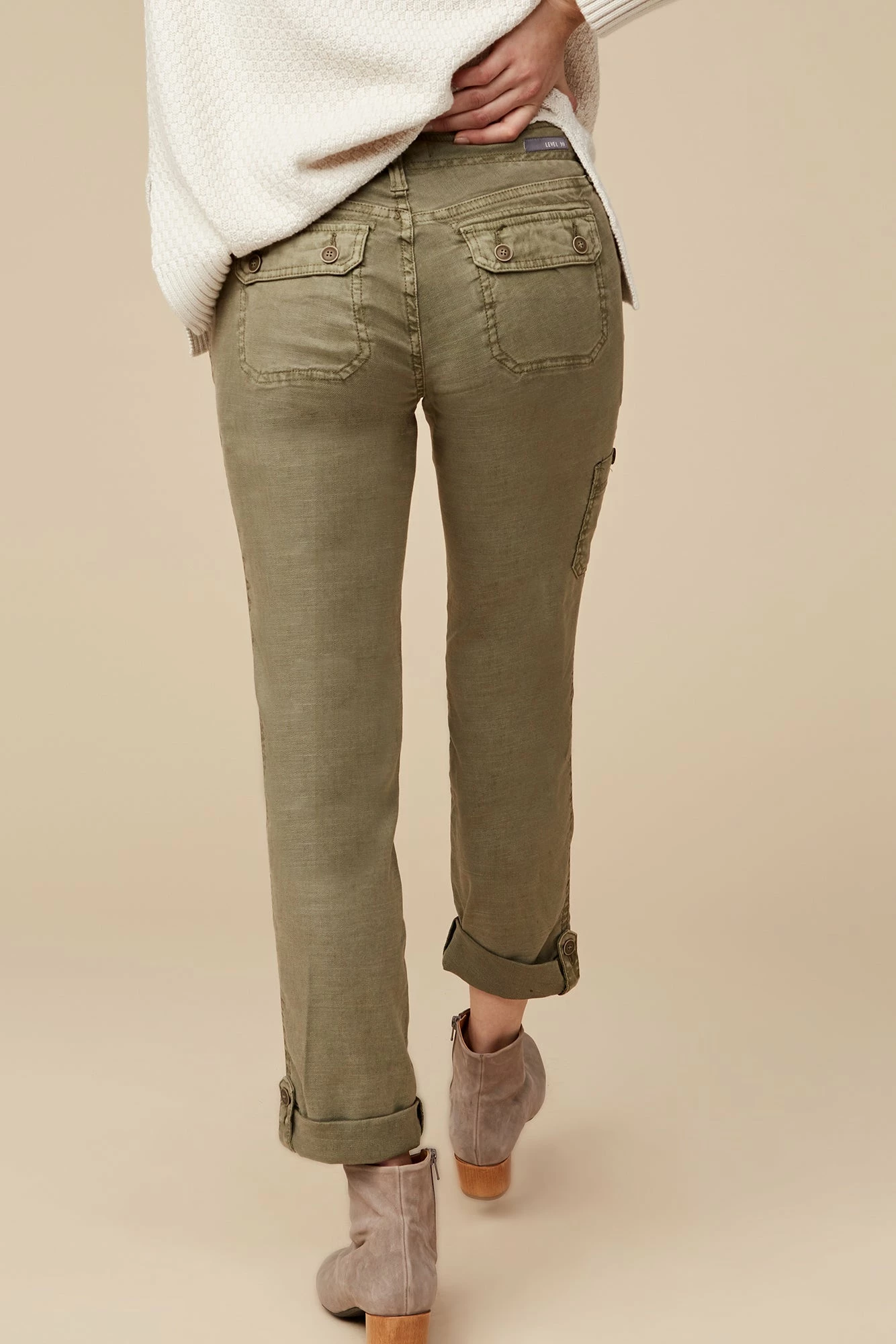 A sleek and flattering take on the classic cargo pants. Features back flap pockets, side cargo pockets, and a relaxed silhouette with a rolled cuff.