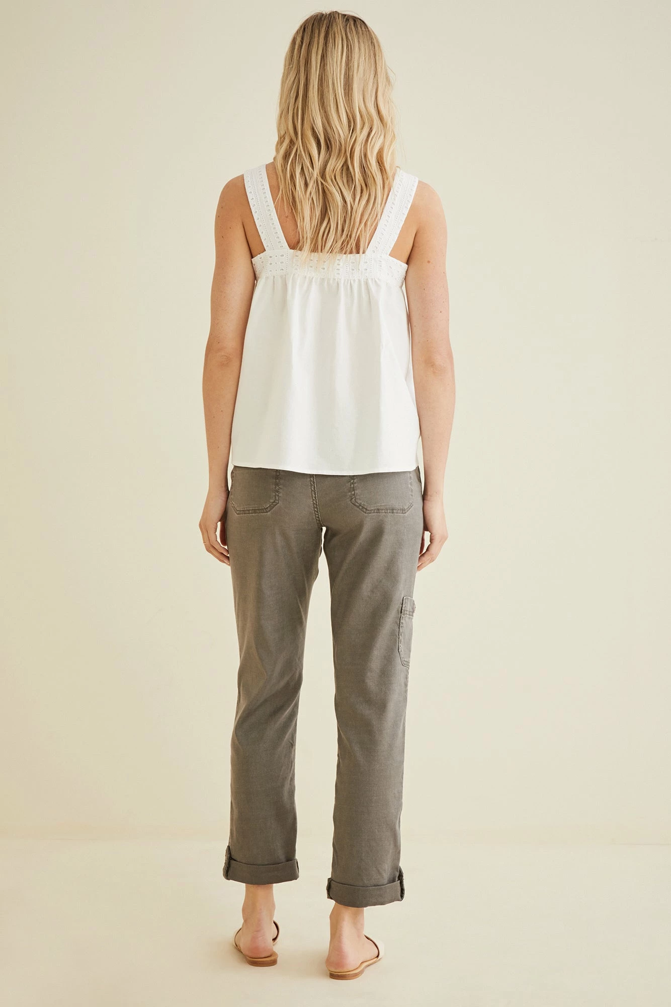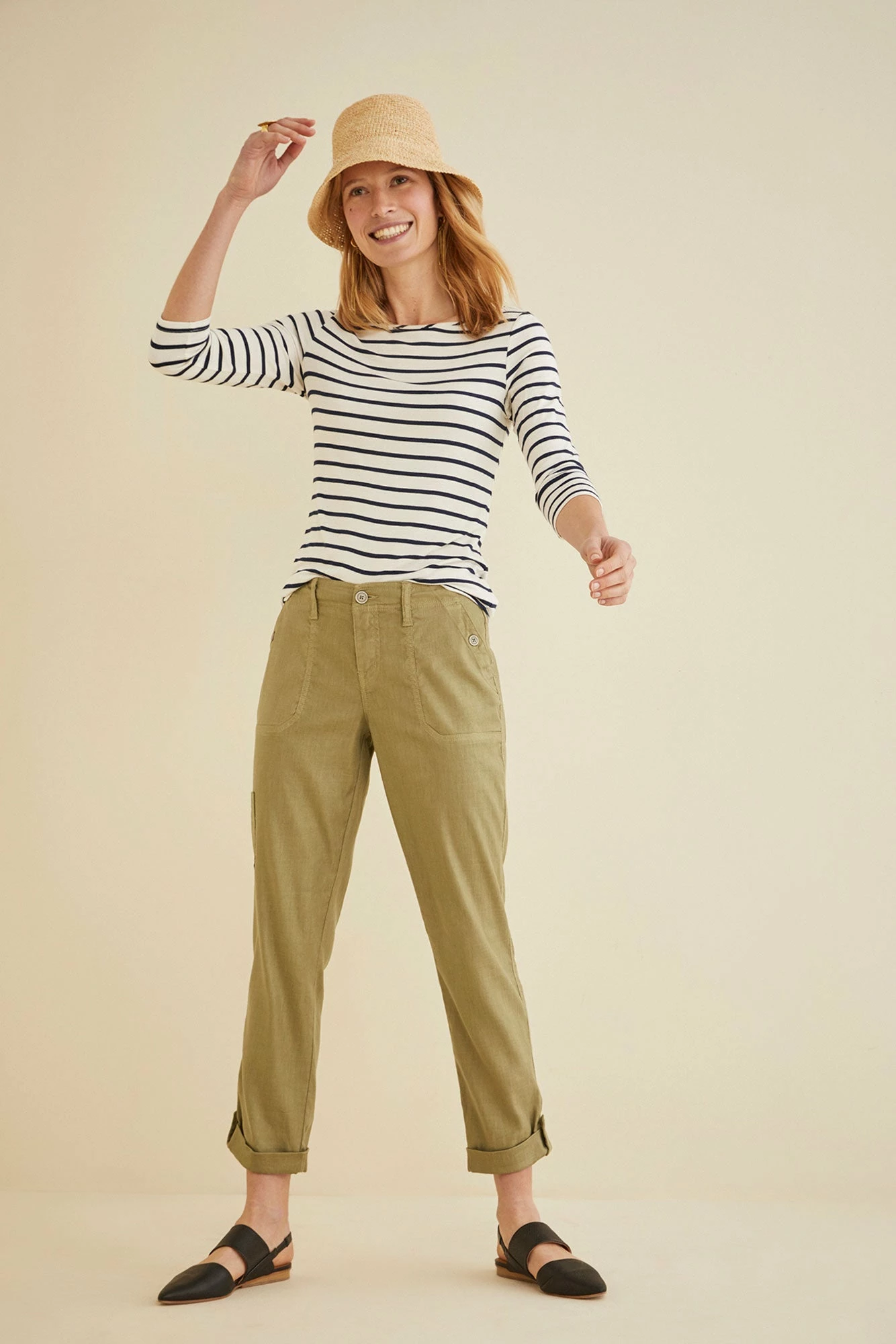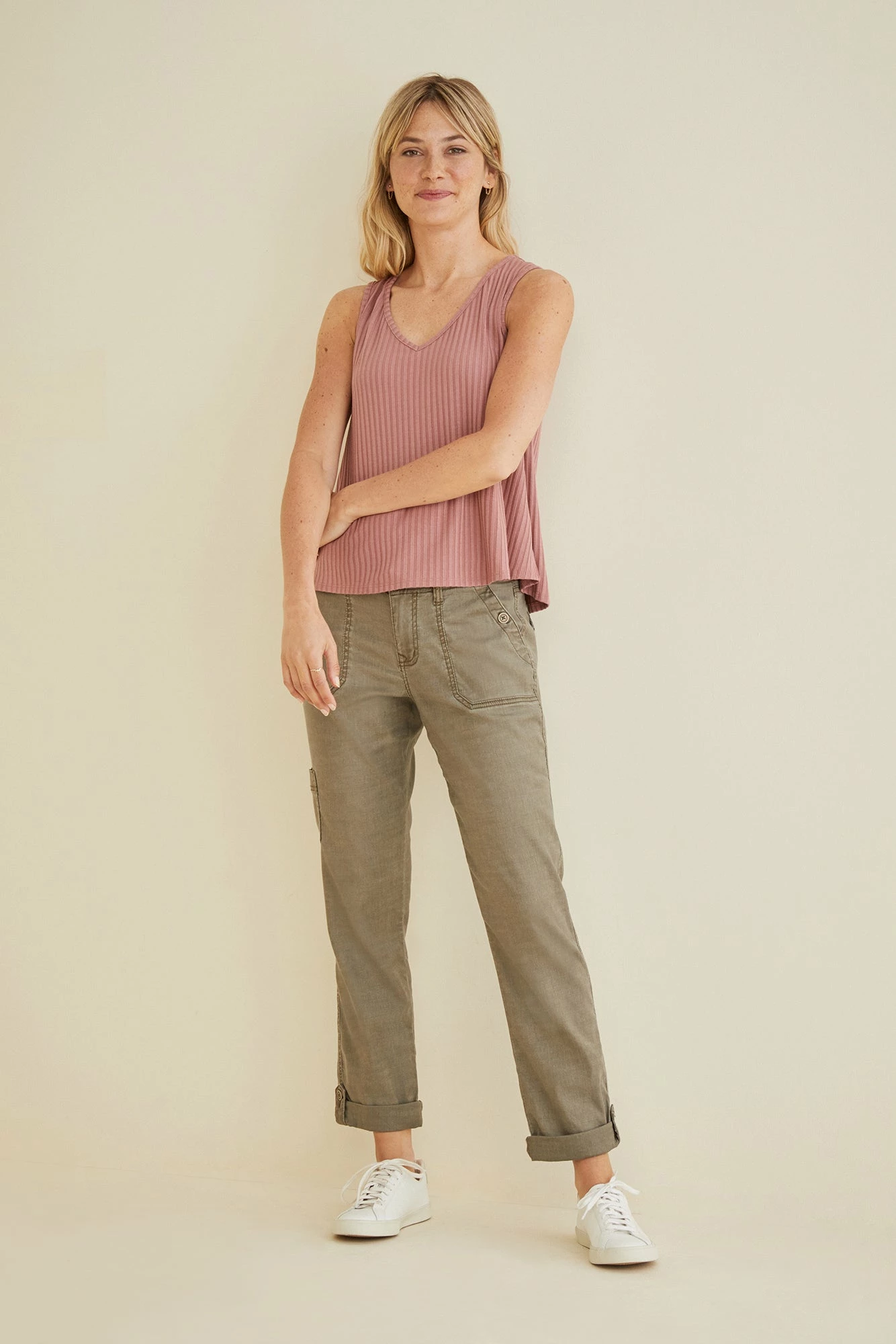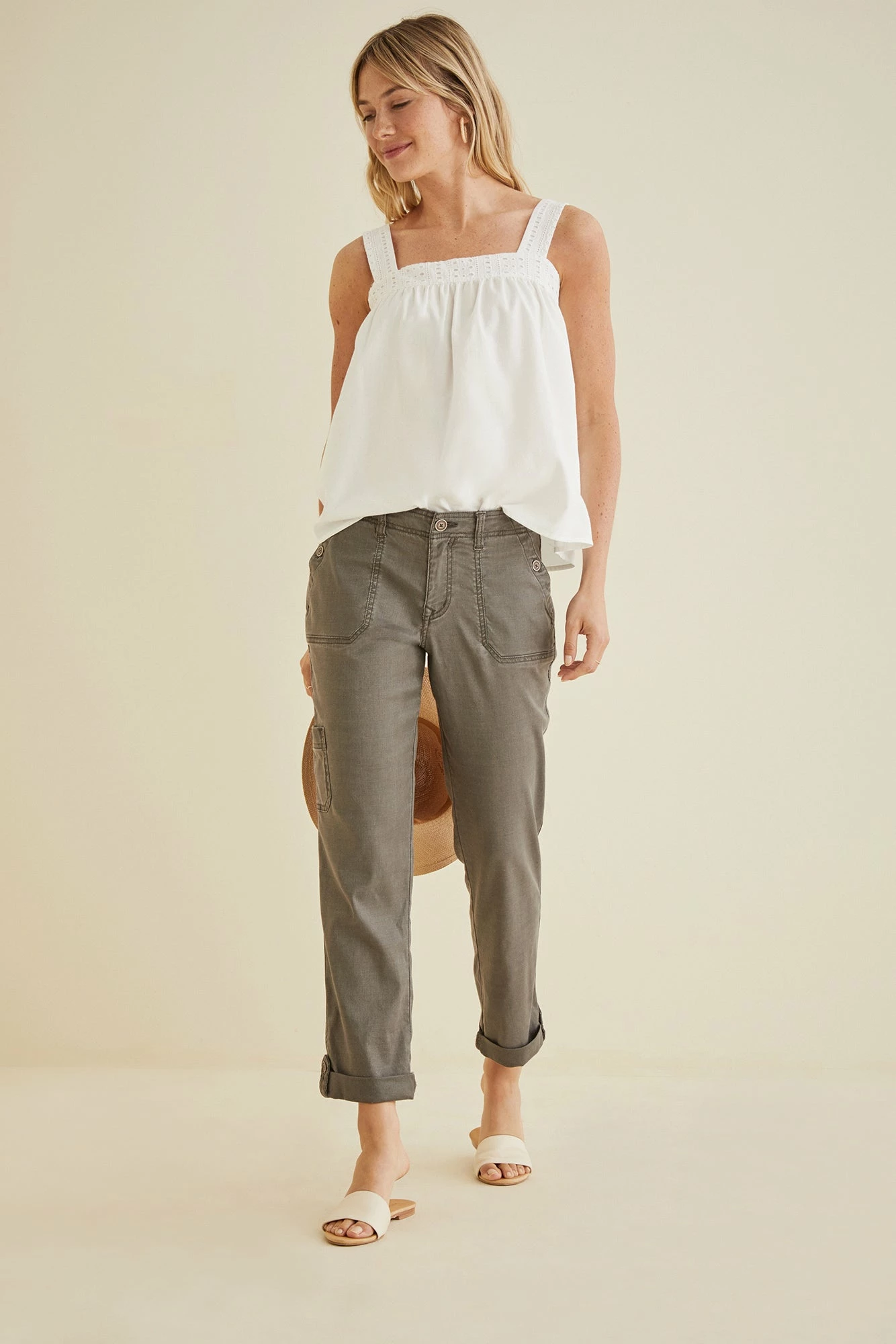 A sleek and flattering take on the classic cargo pants. Features back flap pockets, side cargo pockets, and a relaxed silhouette with a rolled cuff.