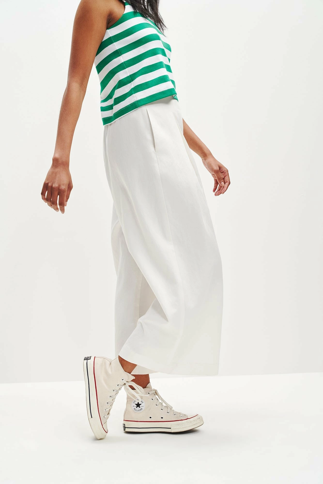 High waisted wide leg pants with side pockets, side zipper closure and pleating down the front. These versatile pants made in our luxe Femme Fête fabric are a true wardrobe staple.