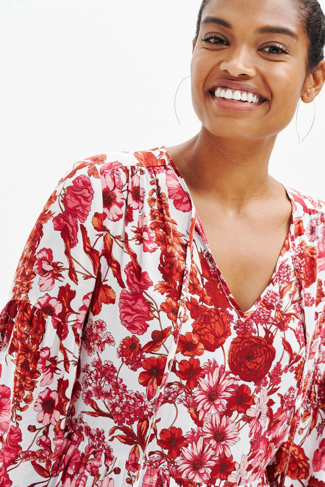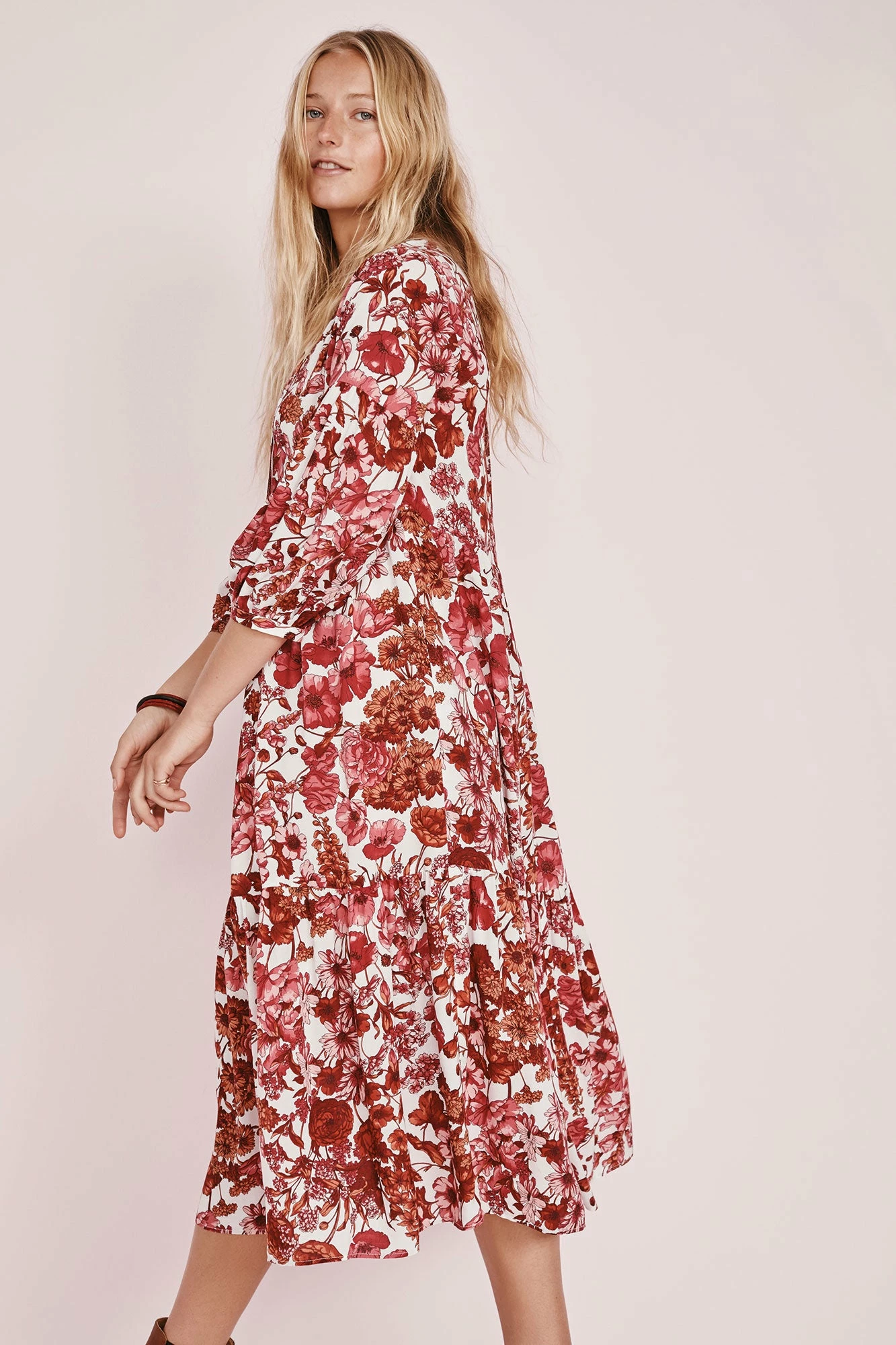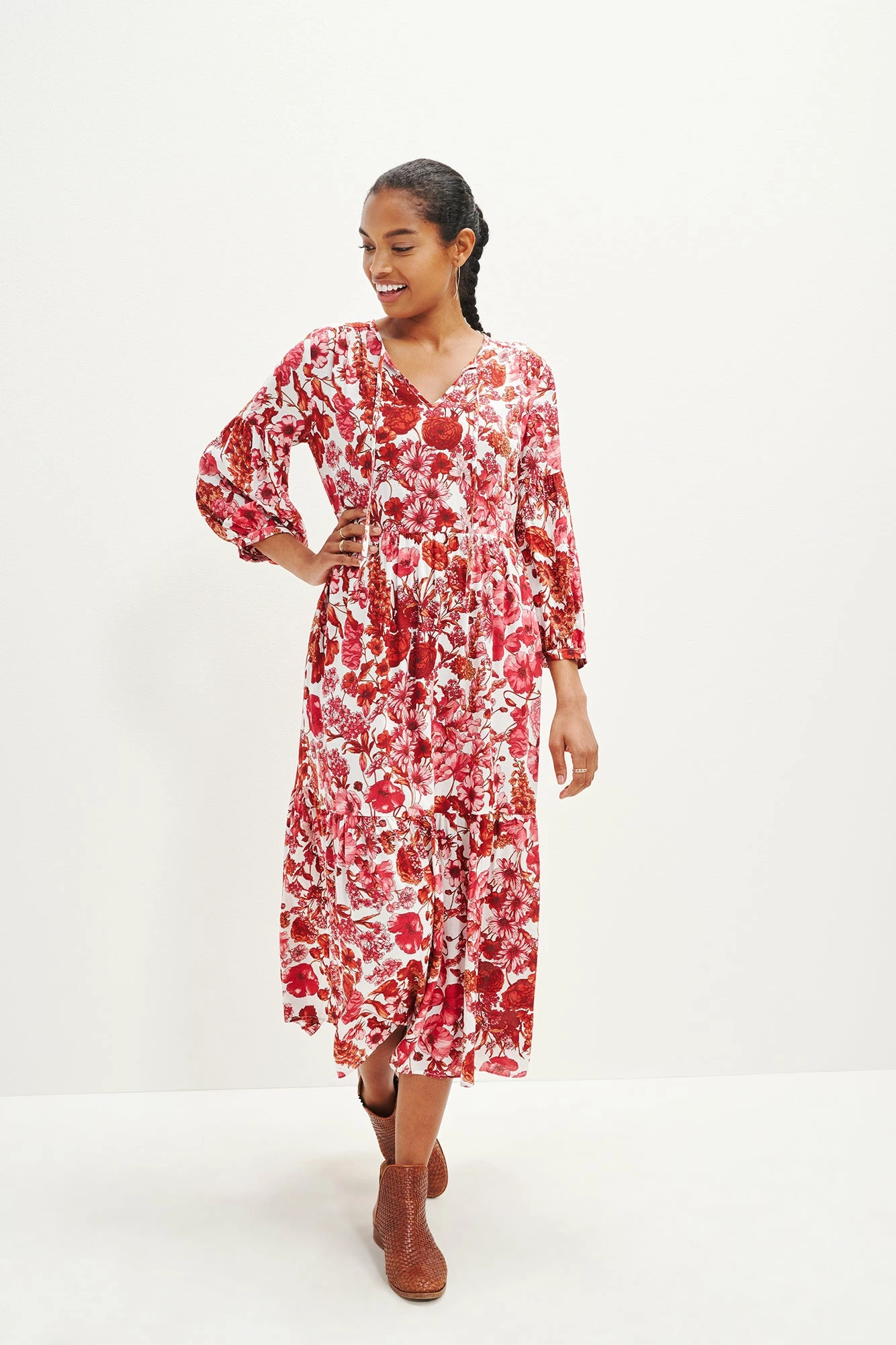 Maxi dress with 3/4 length voluminous sleeves, a v-neckline, and drop waist detail. Made in our luxurious Nouveau Silk, a plant-based fabric that looks and feels as good as silk.