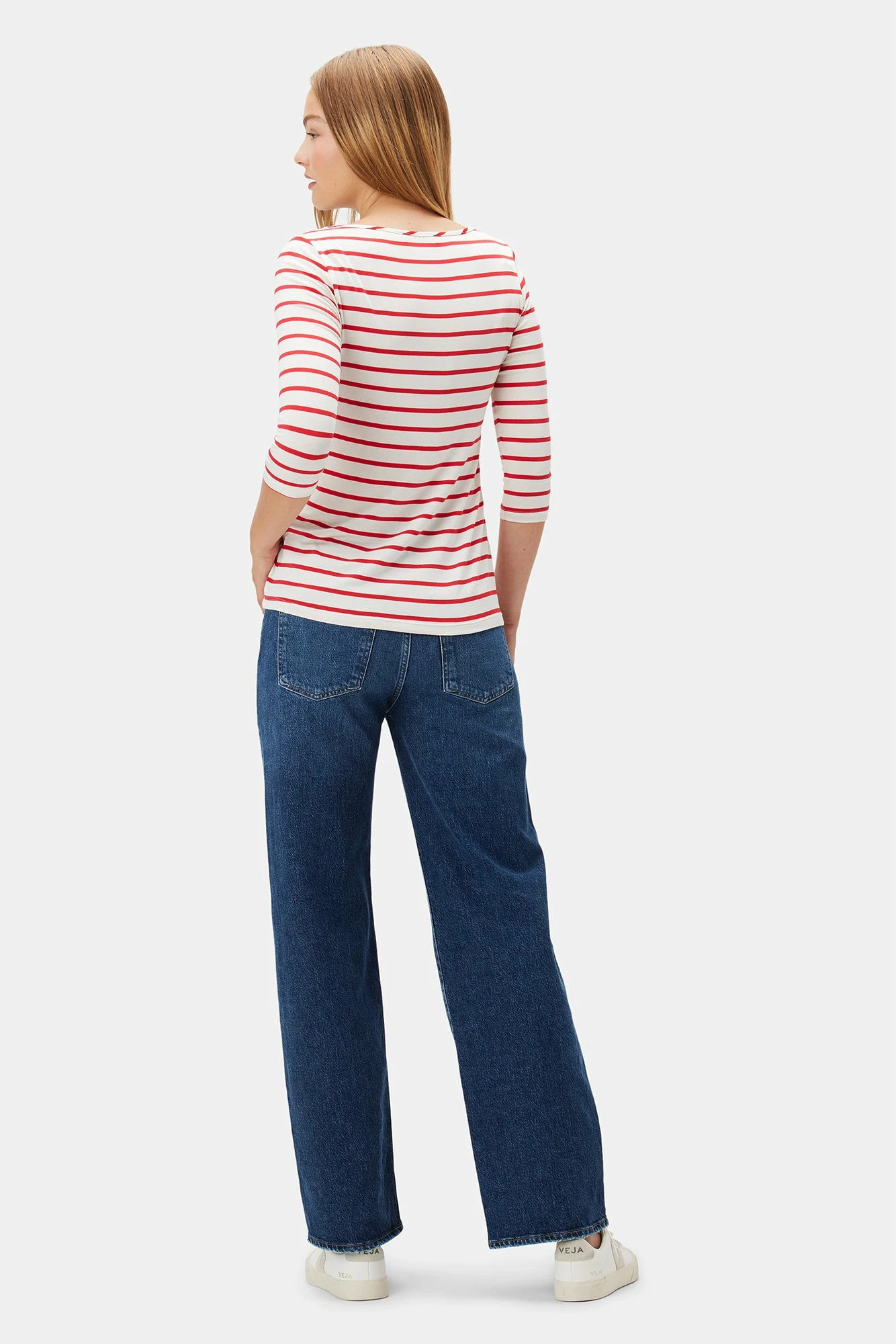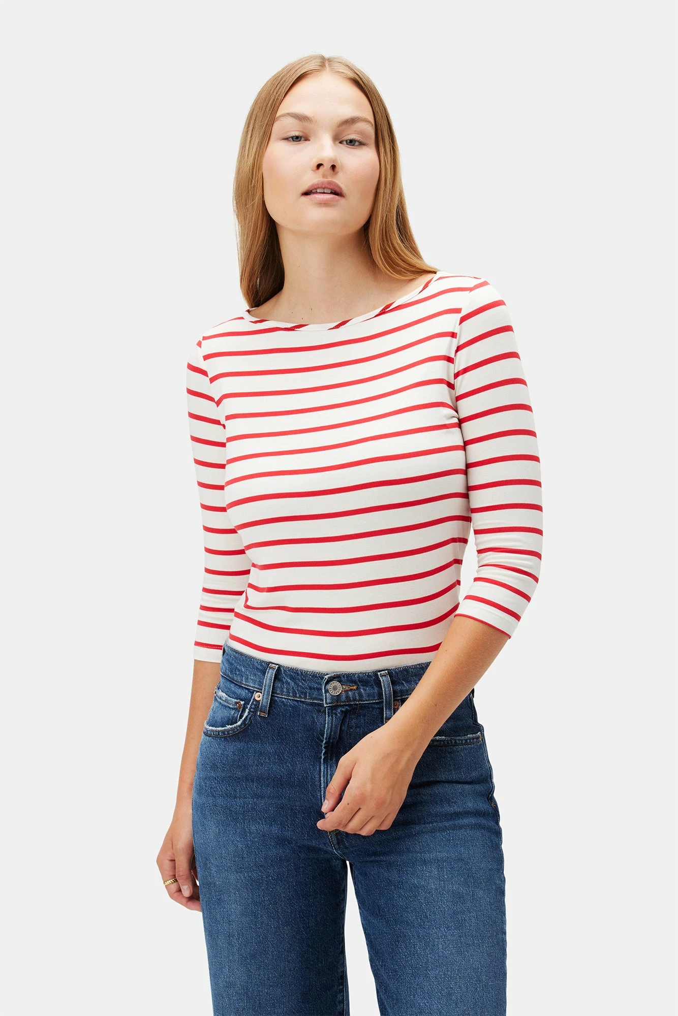 - 3/4 sleeve tee with a classic boat neckline and easy silhouette.