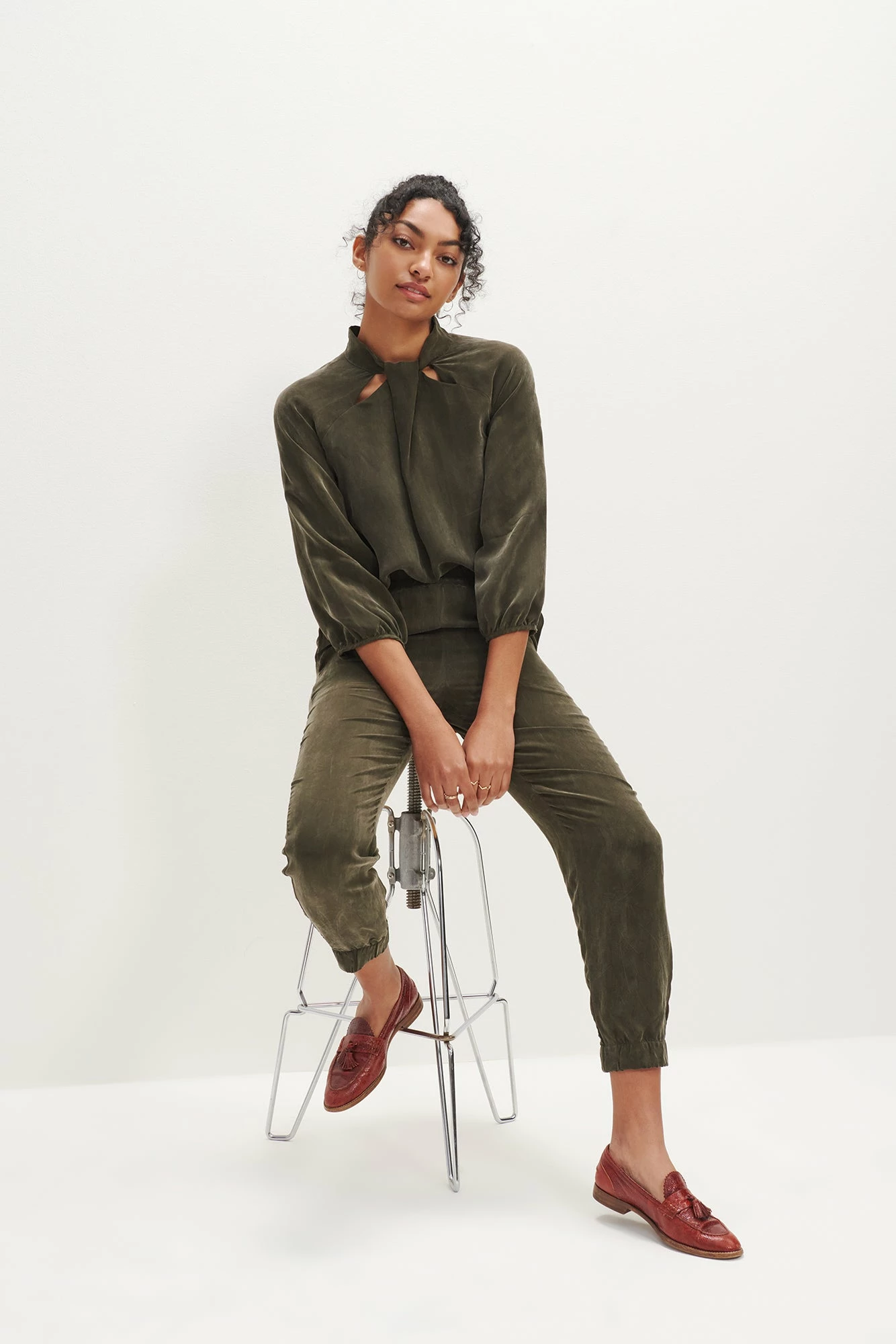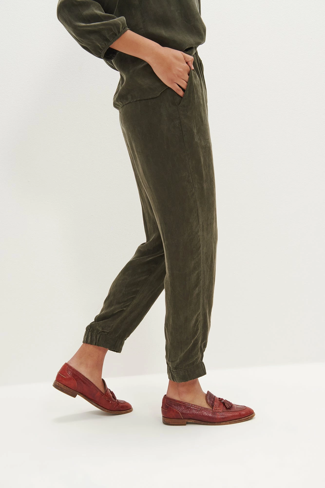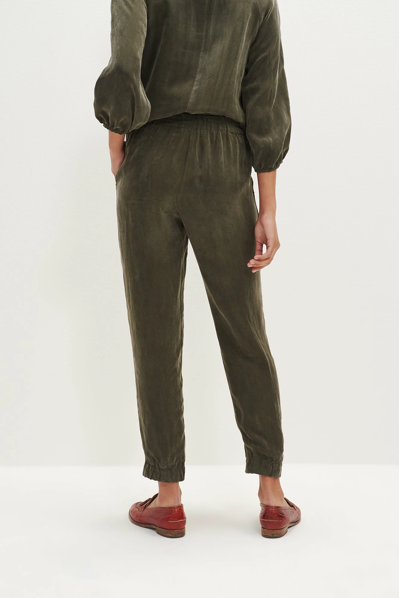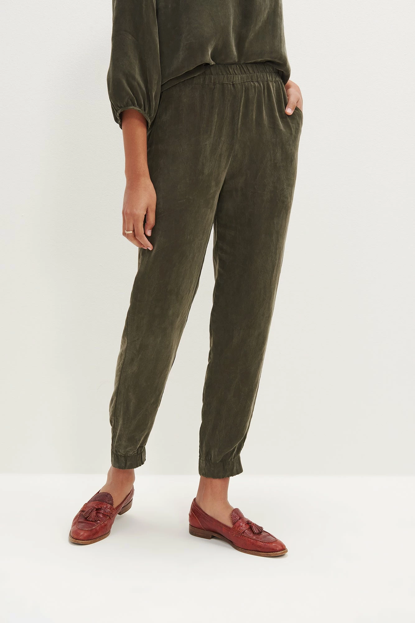 Dressy casual jogger pants with elastic at the waist and side seam pockets. These elevated joggers are made from our non-stretch Cottonseed Cupro, a vegan alternative to silk made entirely from leftover cotton waste. Fit is slim through the hip and thigh, so we recommend you size up.