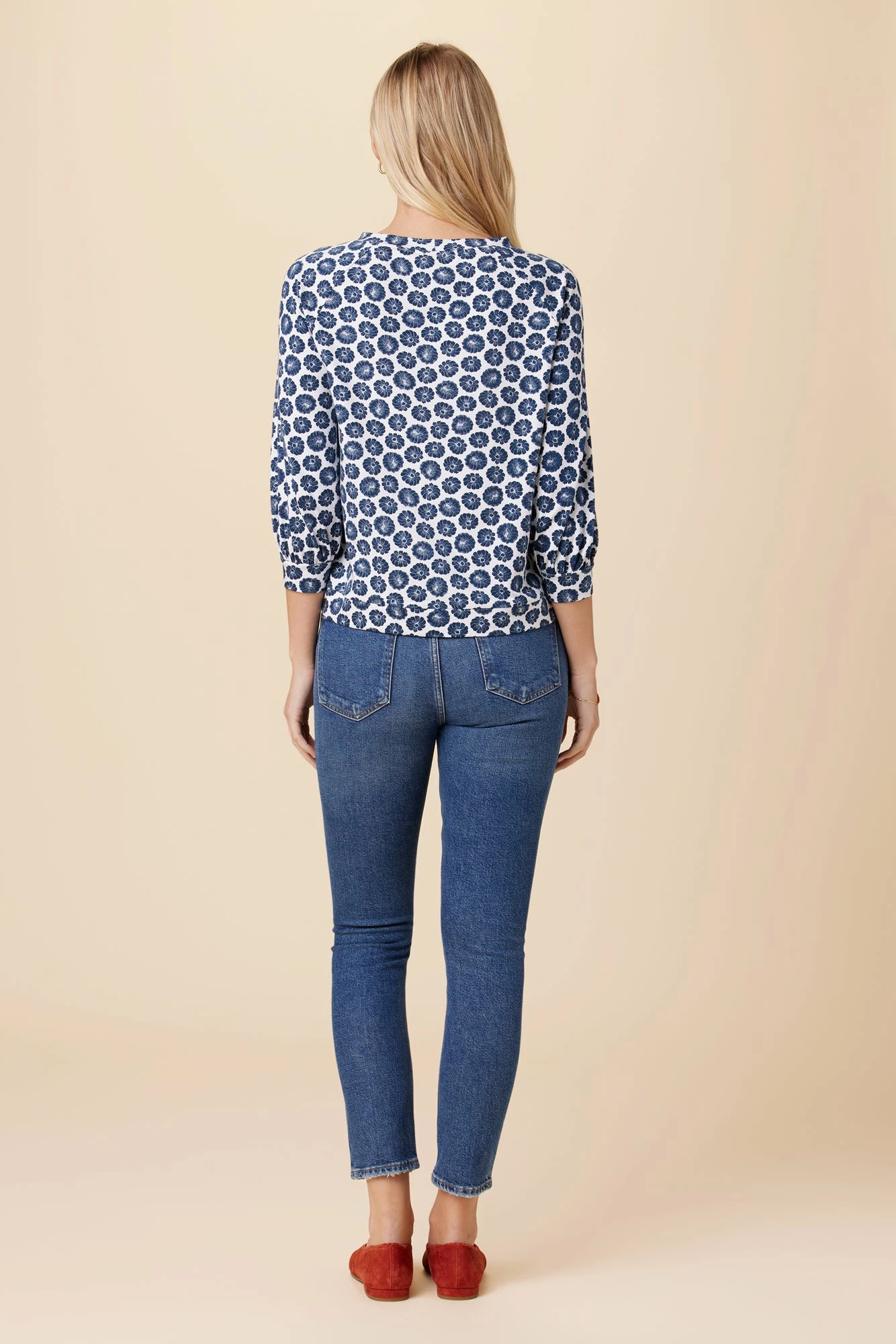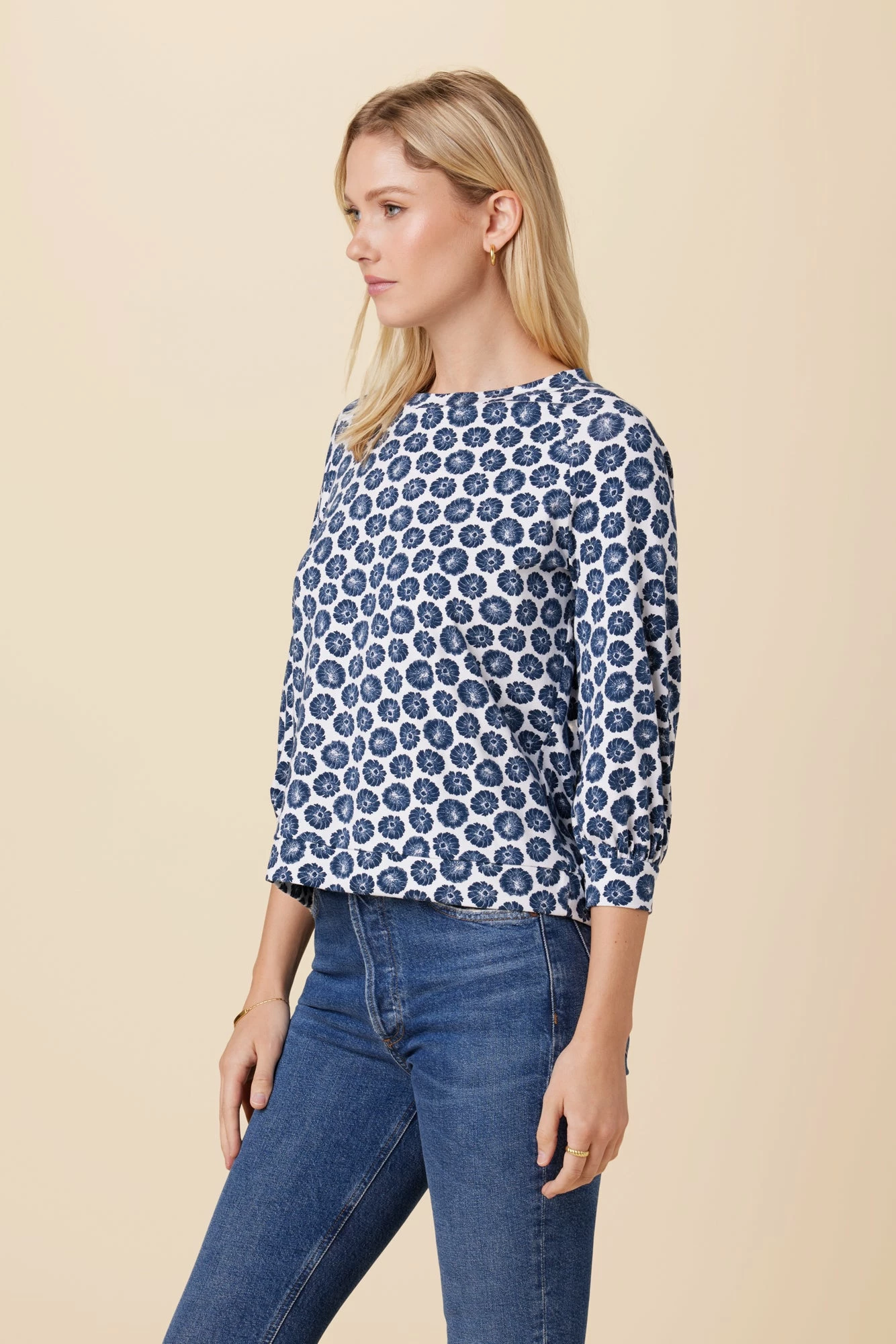 - A 3/4 sleeve tee with gathering at the cuffs for a little added volume.