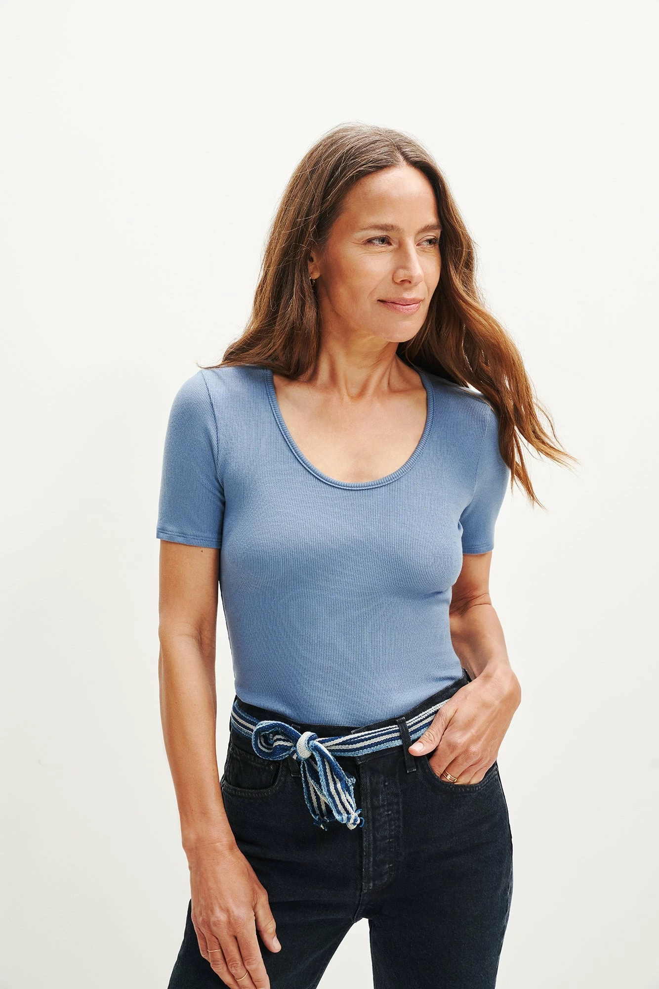 Short sleeve tee with a scoop neck and shirt-tail hem. A great layering piece made from our lightweight, super soft Dream Rib fabric.