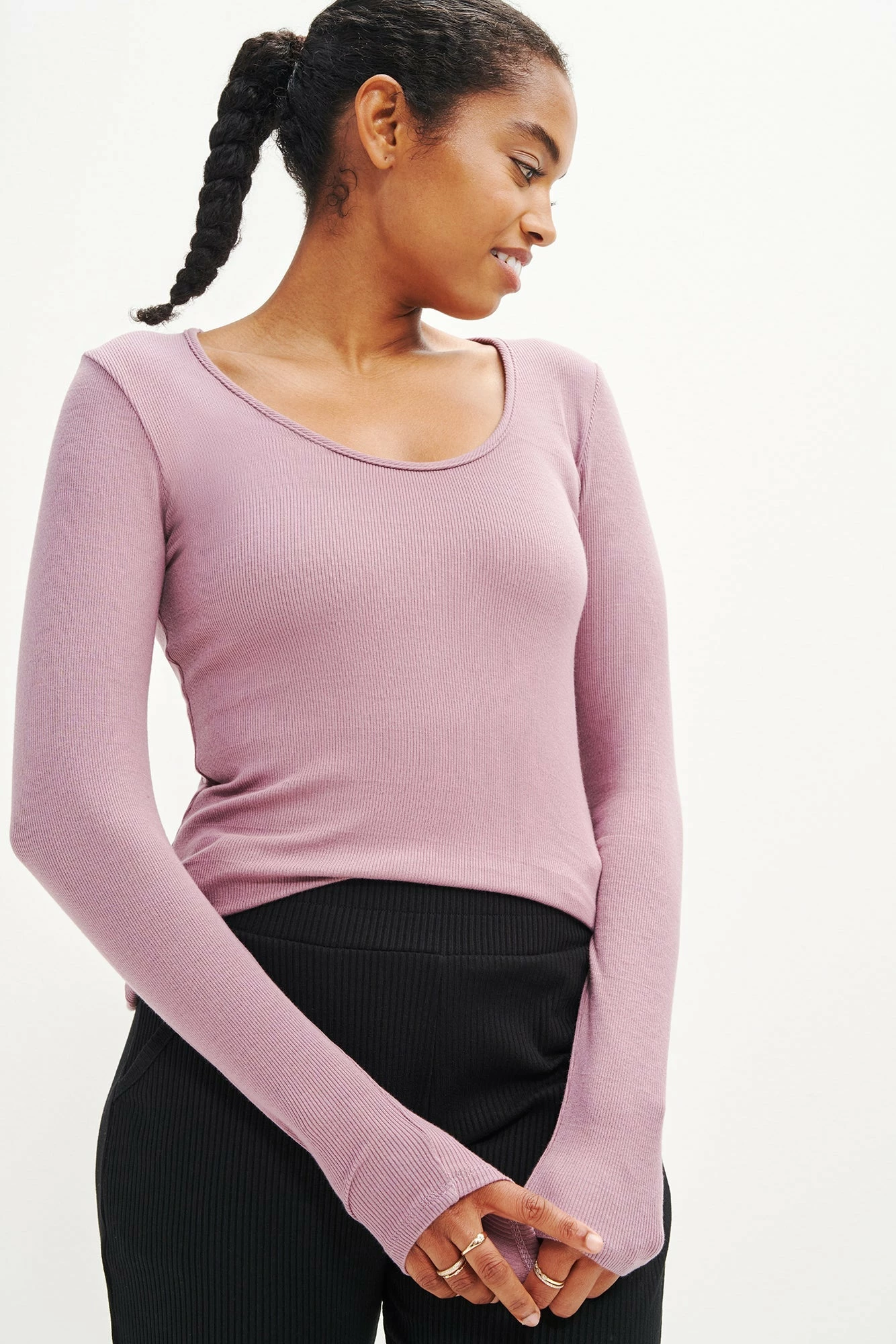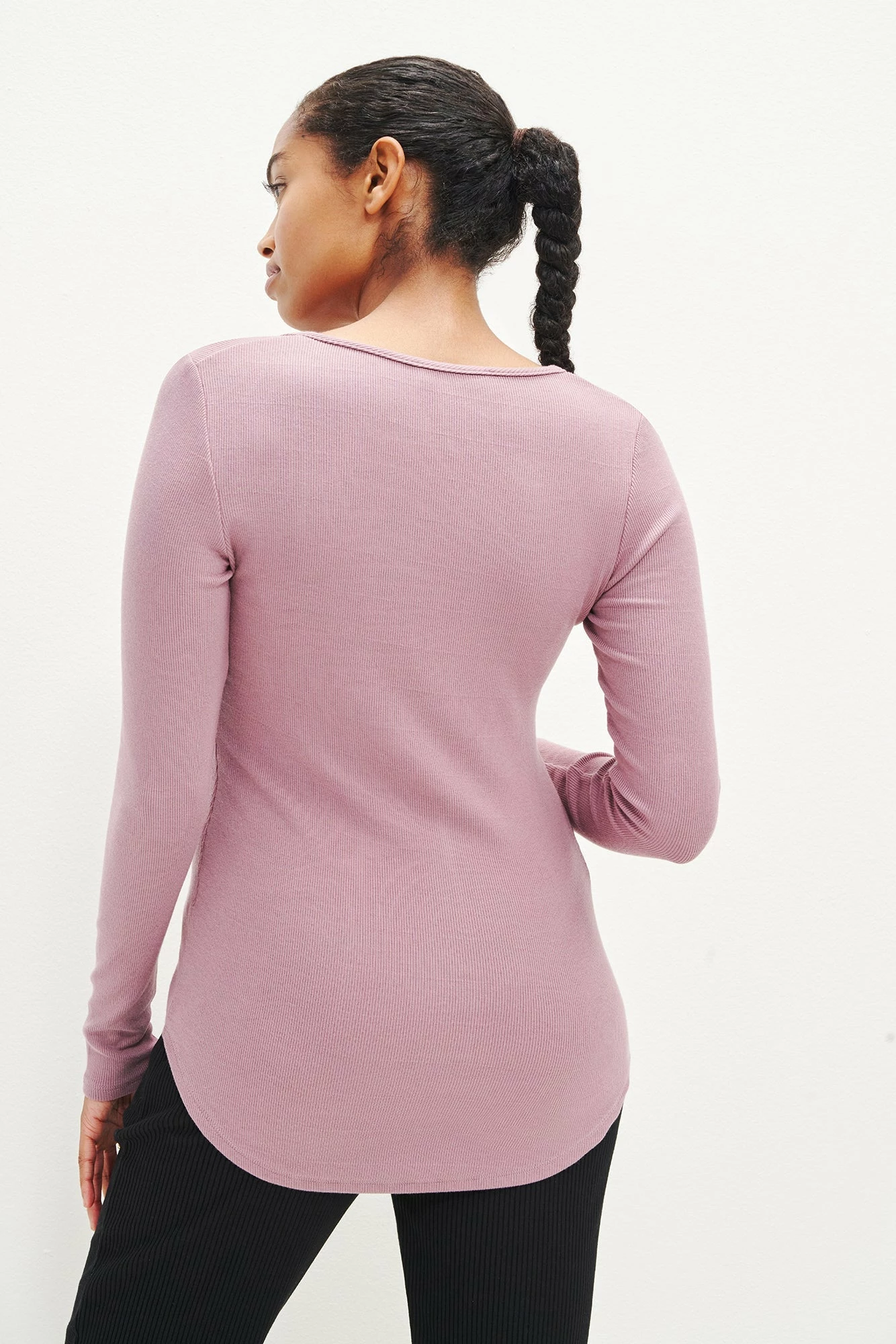 Long sleeve tee with an open neck and shirt-tail hem. A great layering piece made from our lightweight, ultra-soft Dream Rib fabric.