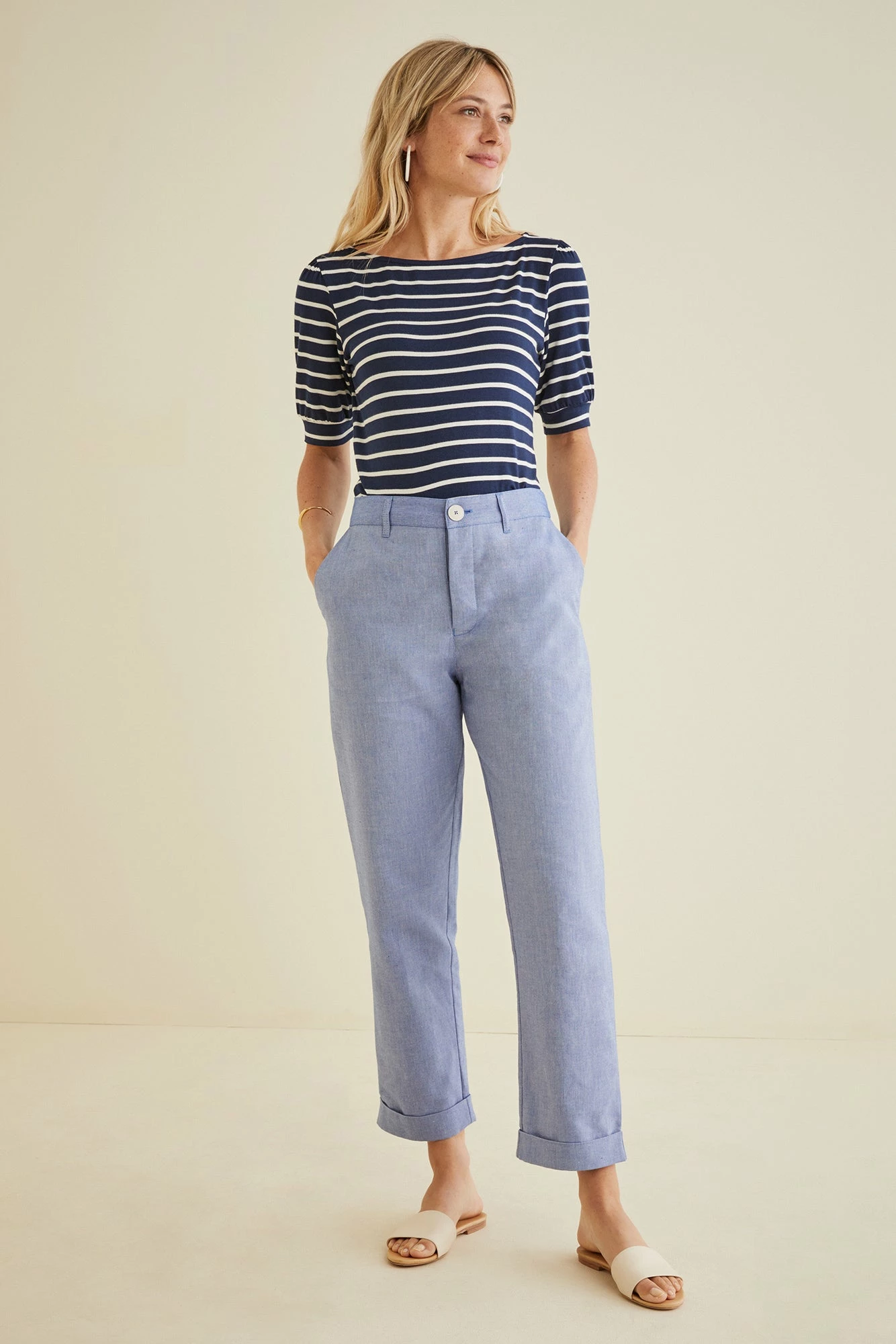 Classic fit, tapered leg pants with angled front pockets and back welt pockets. Features a concealed button fly with Italian made recycled hemp buttons.