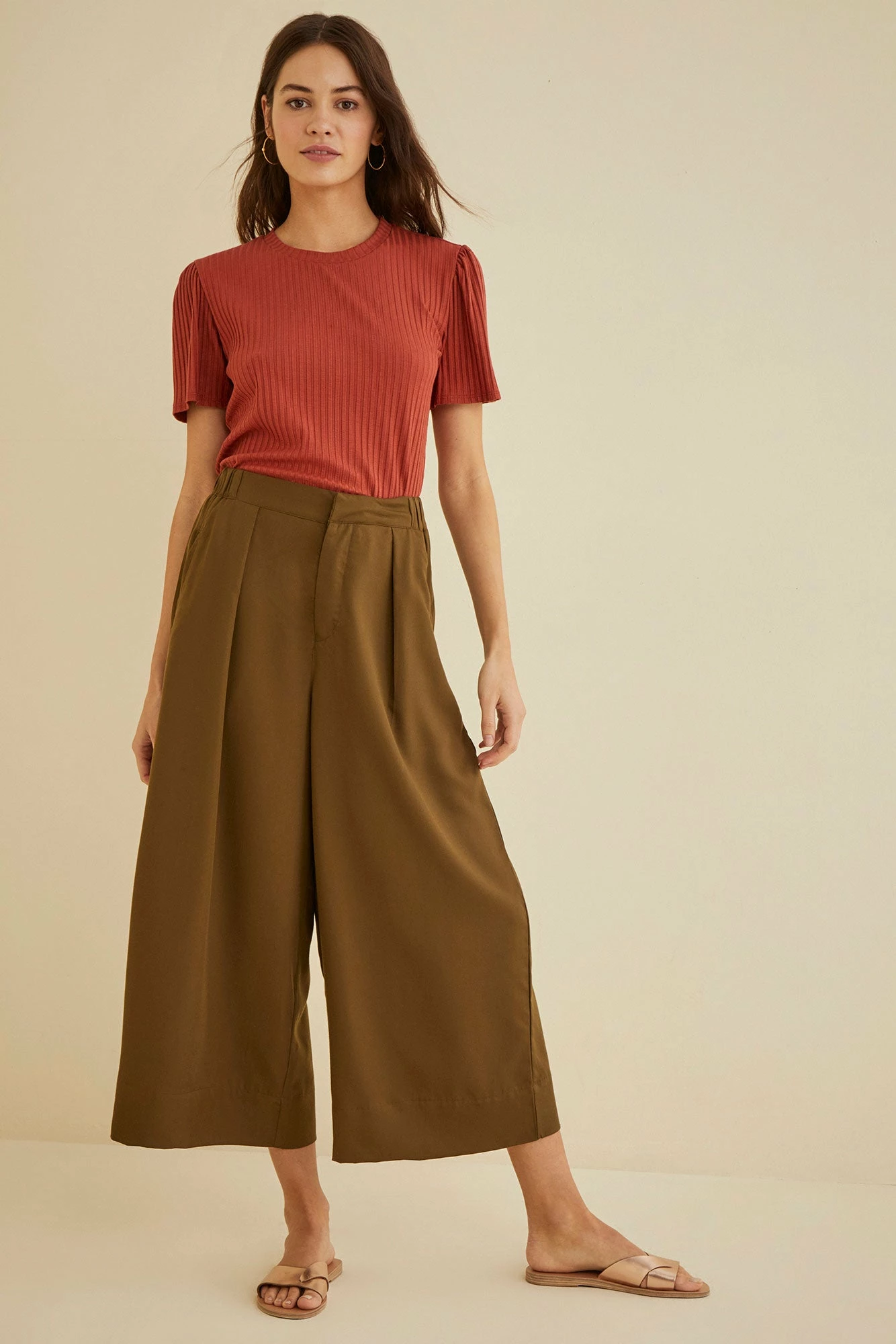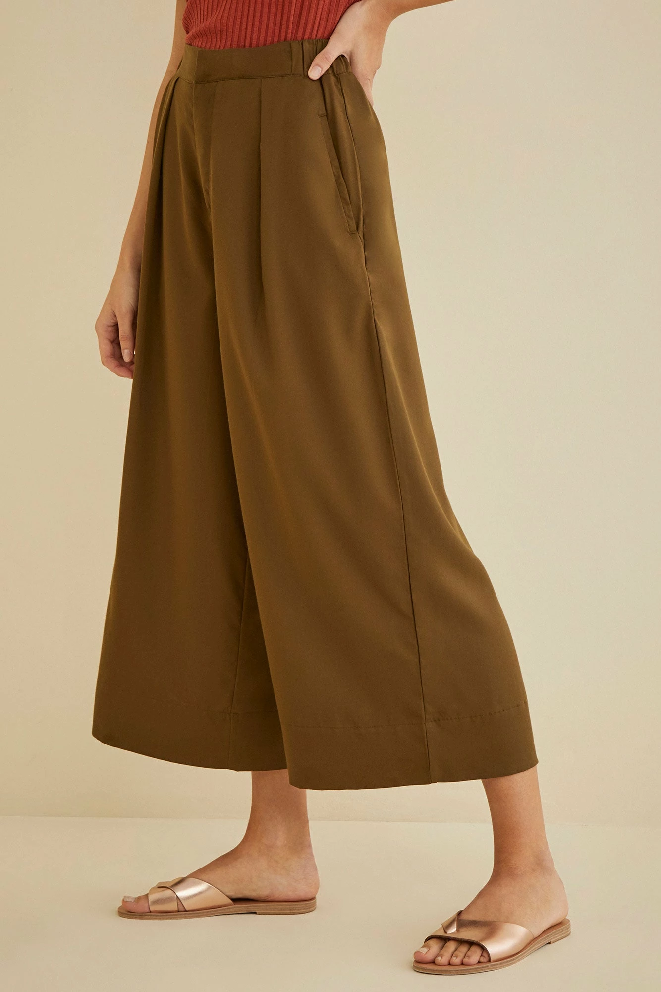 Cropped wide leg pants with front pleats, concealed button fly closure, and elastic at the side waist.