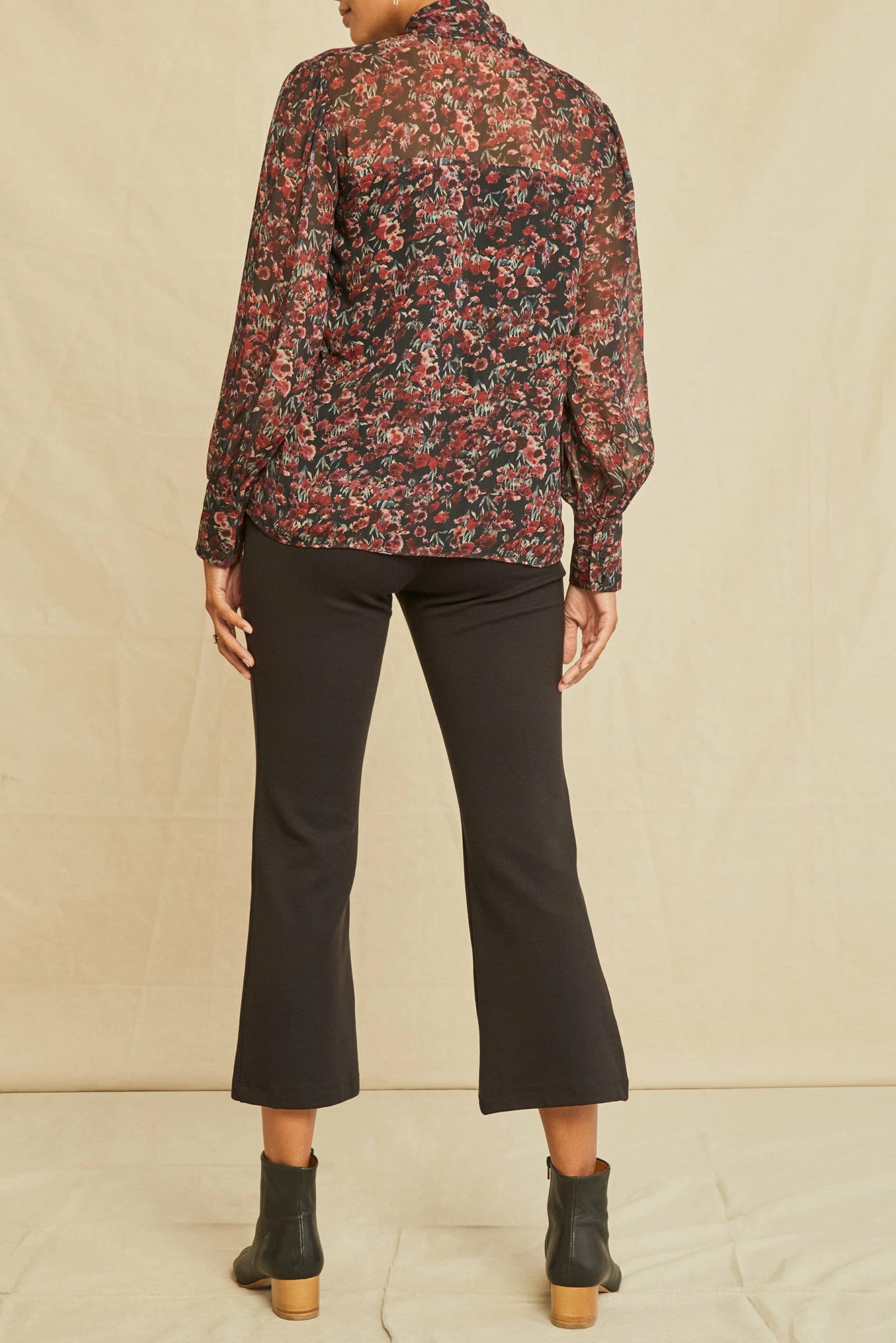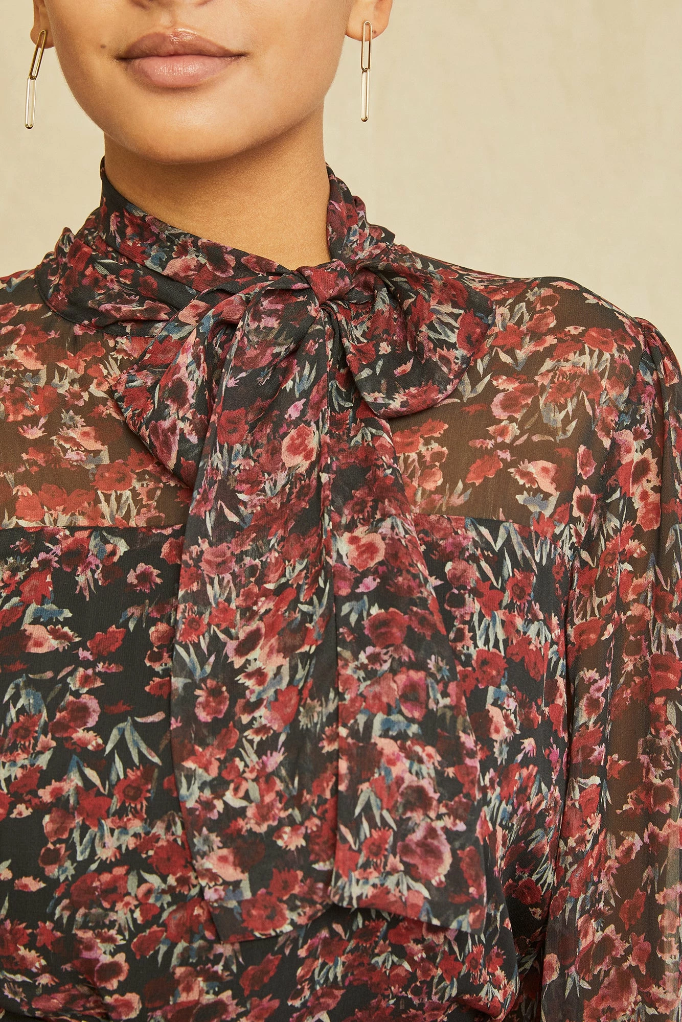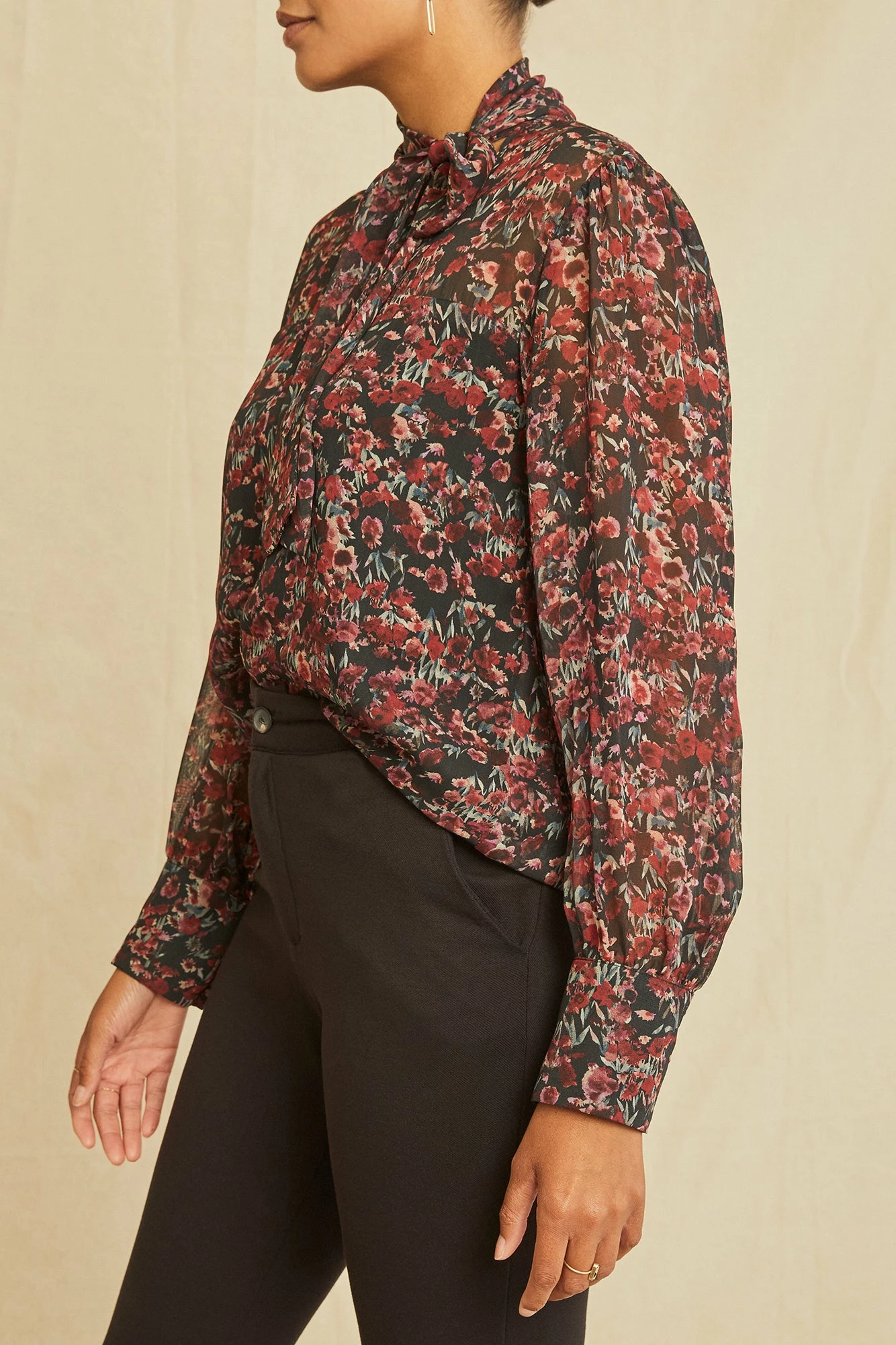 Blouse featuring adjustable neck tie and long sleeves, with buttons at the cuff. Made in our signature Nouveau Silk, a plant-based, washable fabric that feels and looks like silk chiffon.