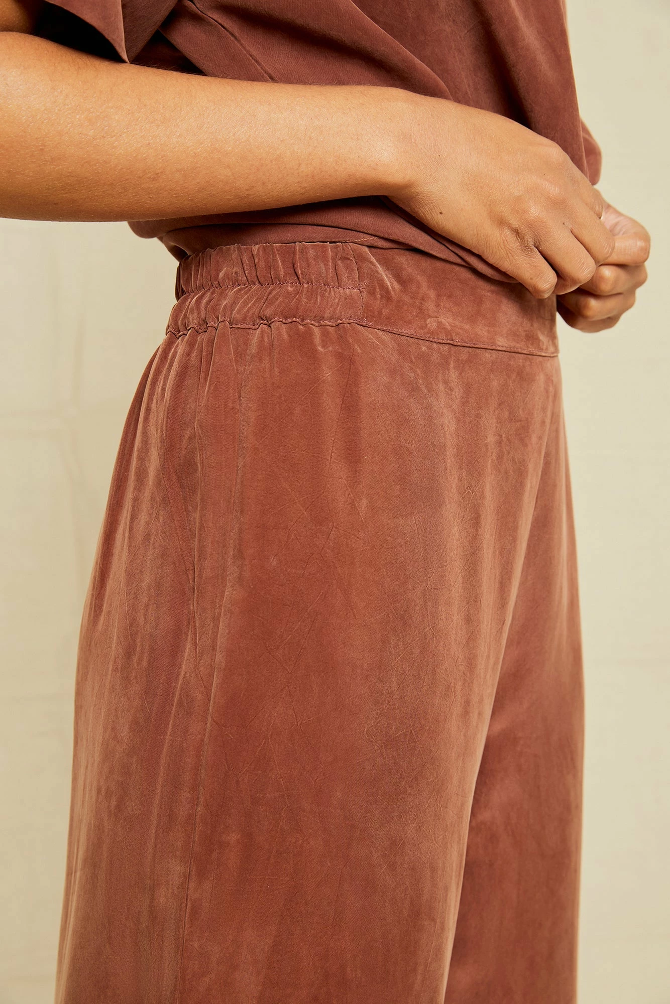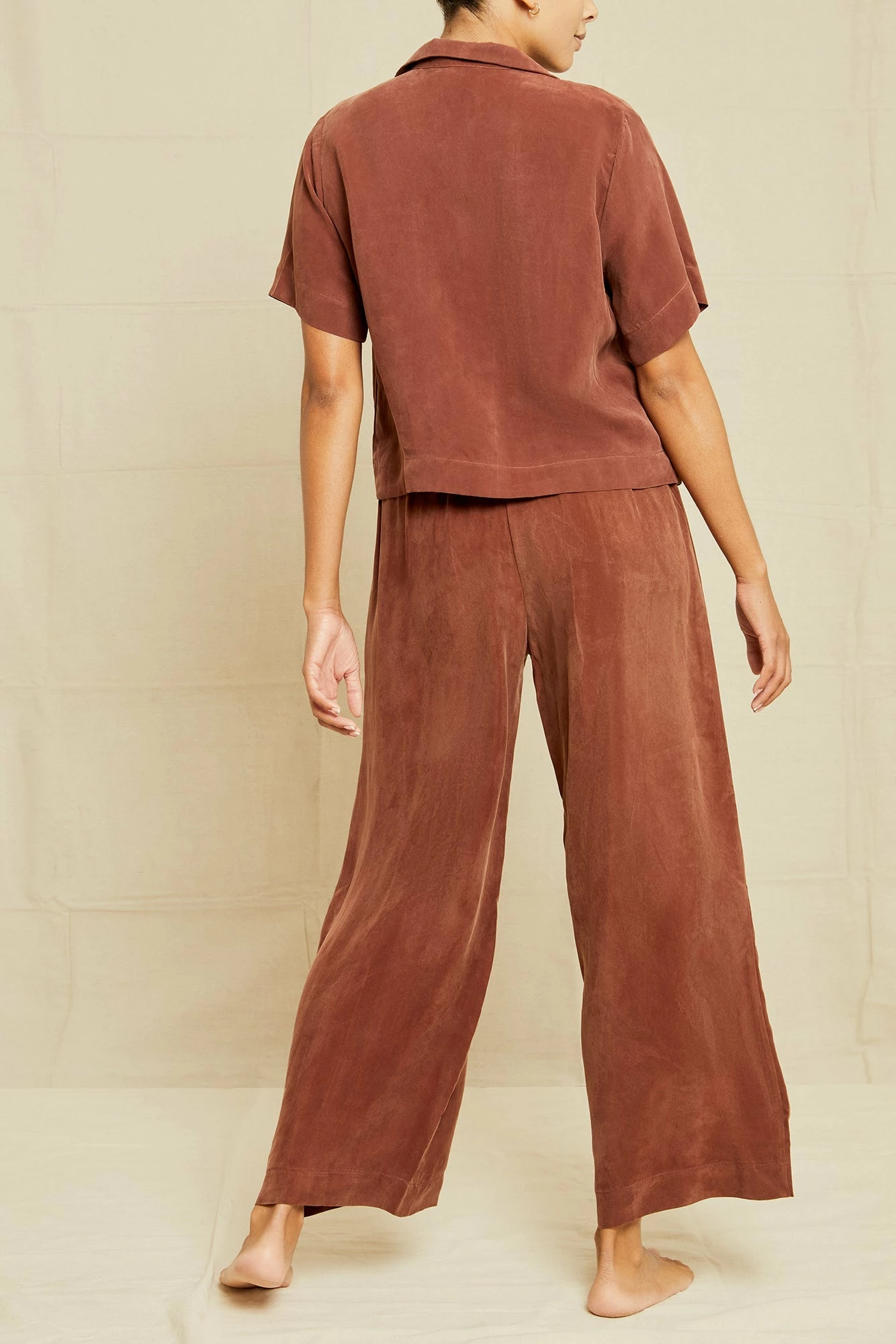Wide leg pajama pants with side seam pockets and elastic at the back waist. Made from our silky-smooth Cupro charmeuse, a vegan silk alternative made from leftover cotton waste.