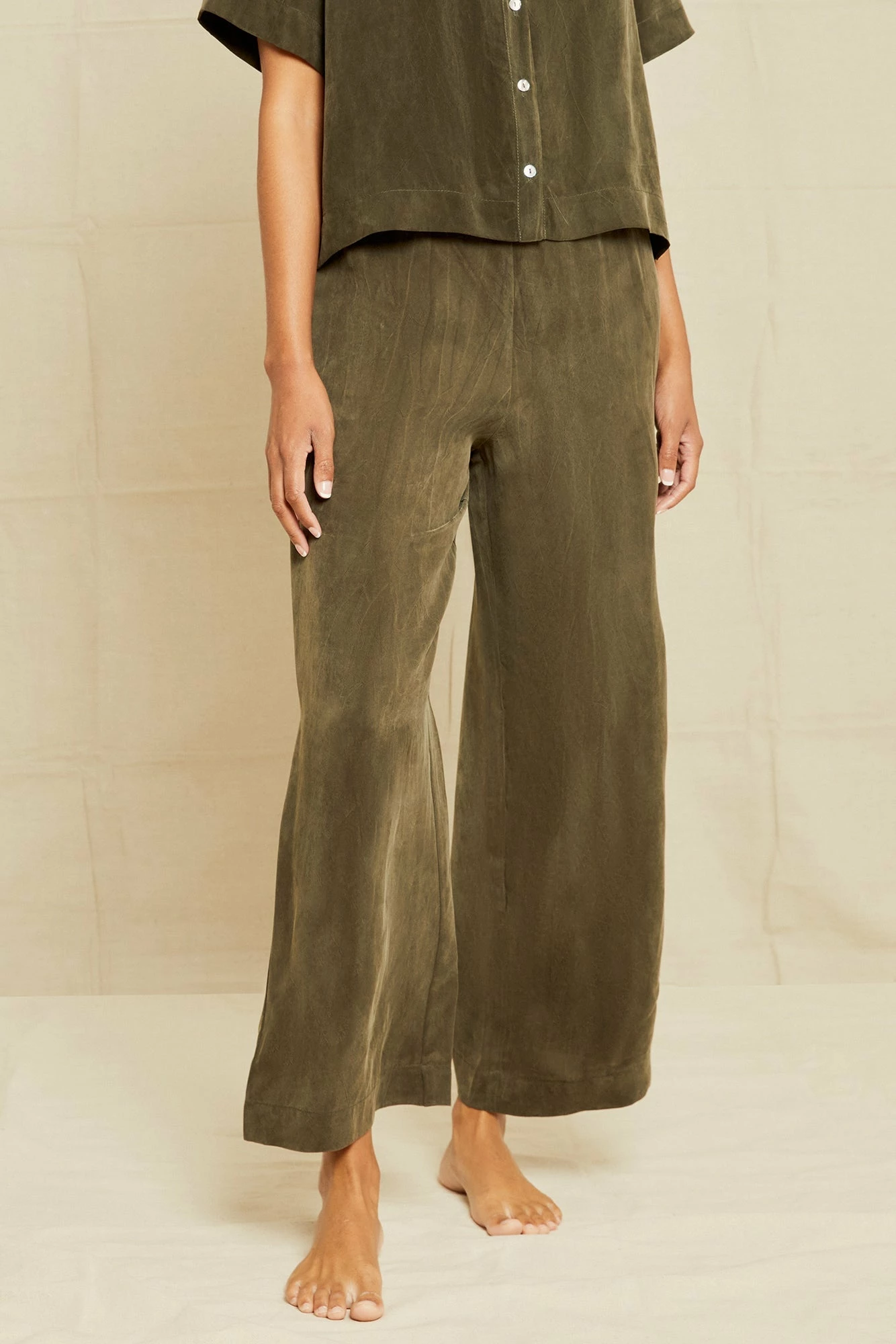 Wide leg pajama pants with side seam pockets and elastic at the back waist. Made from our silky-smooth Cupro charmeuse, a vegan silk alternative made from leftover cotton waste.