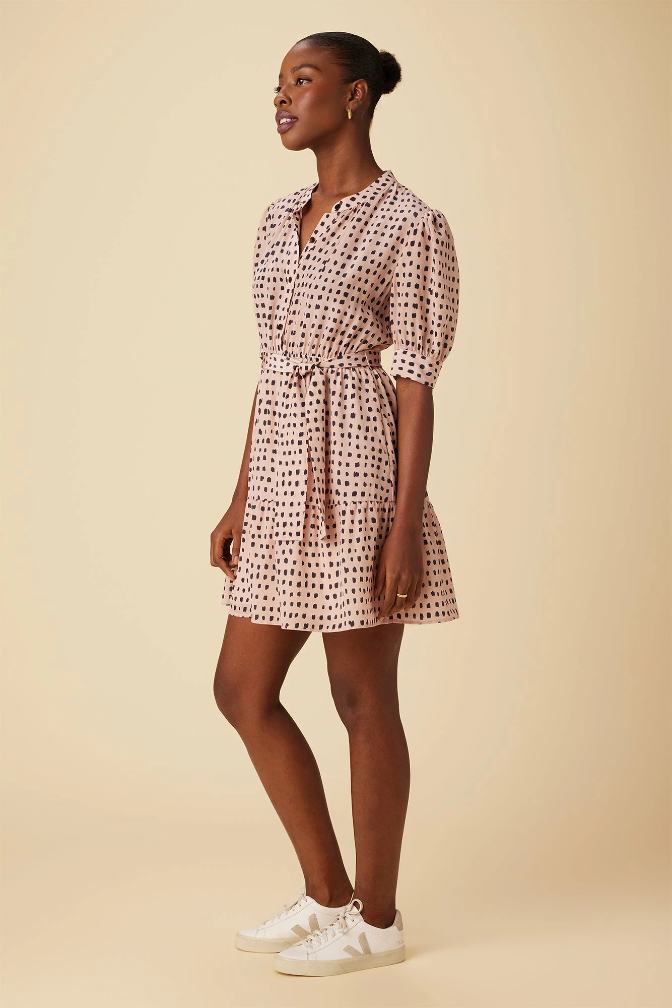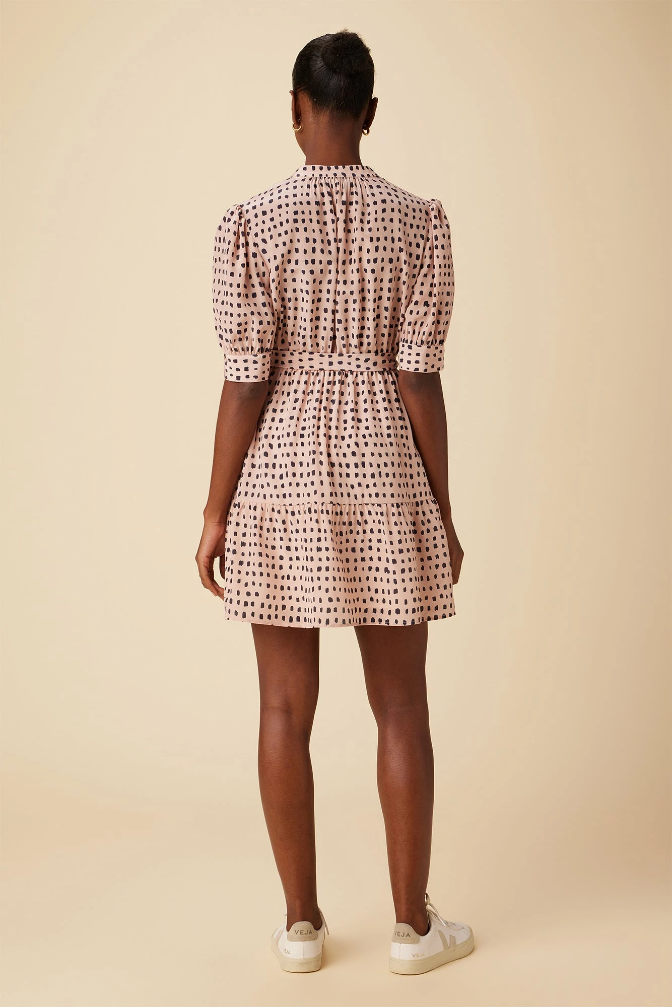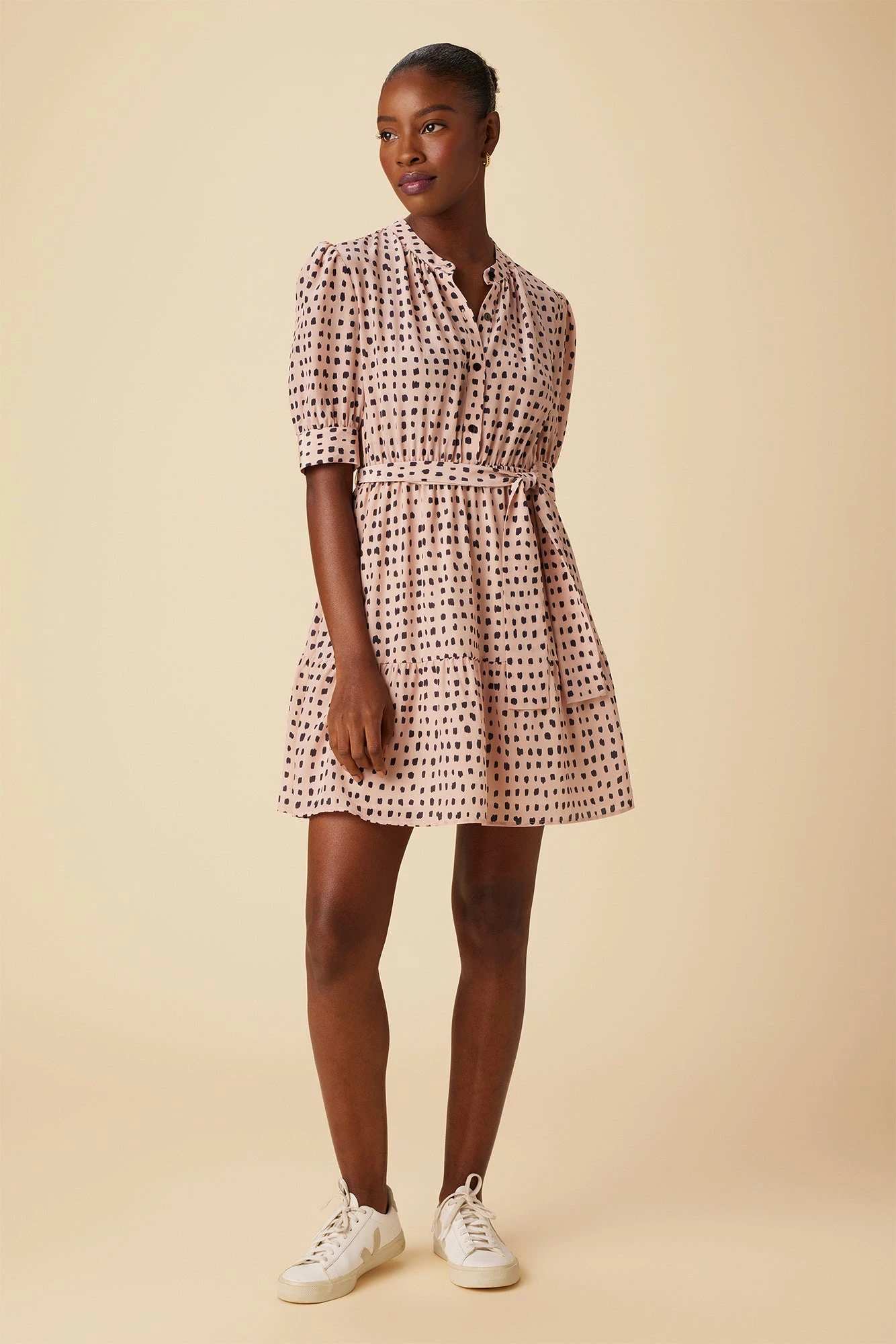 - Short puff sleeve with cuff detail, button front placket on bodice, elastic at waist, detachable tie, flounce on skirt and A -line silhouette