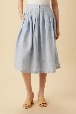 - Midi-length linen skirt featuring pleat details at waist, center-front placket, and mother of pearl buttons.