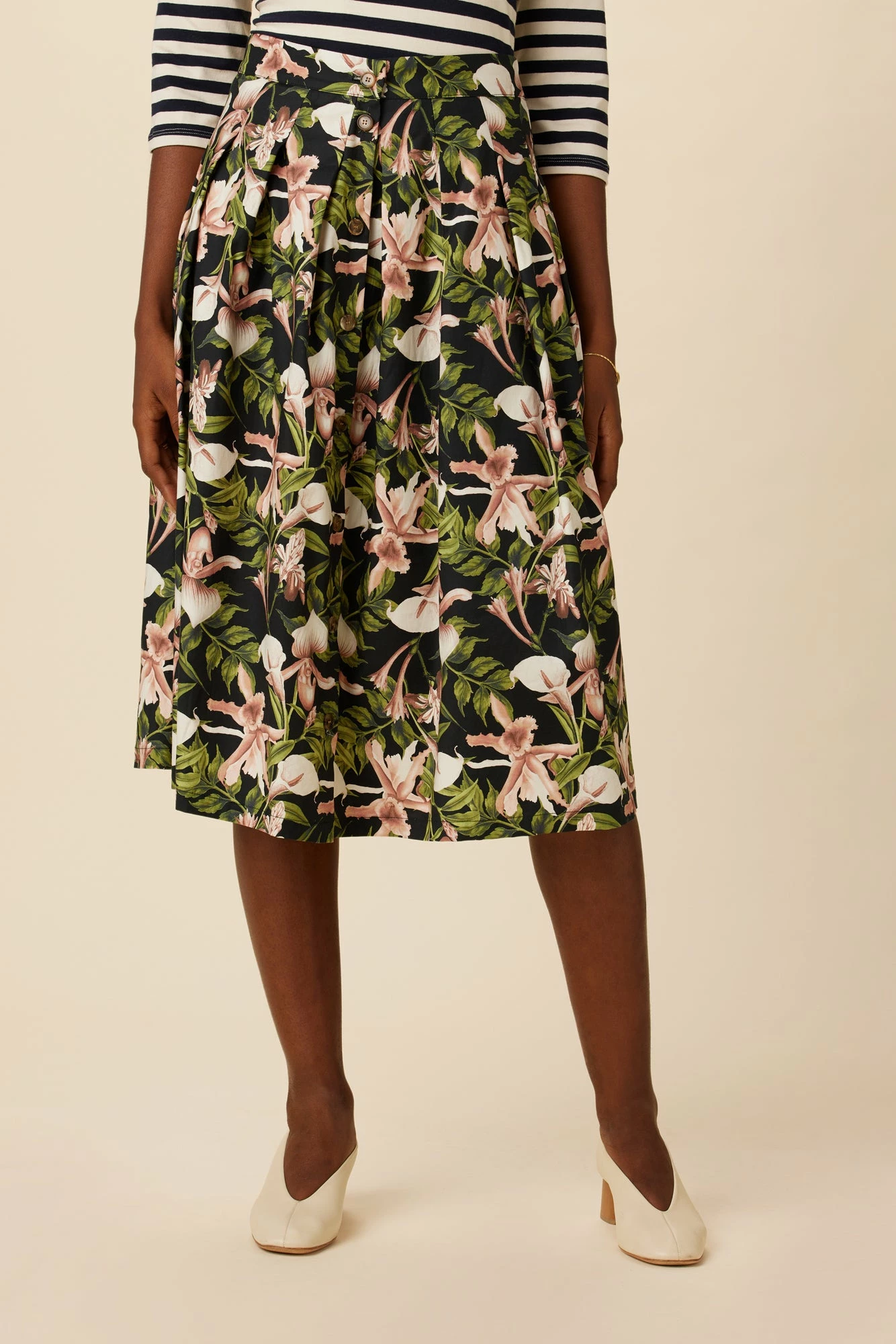 - Relaxed fit, below the knee midi skirt featuring pockets, pleat waist detailing, fixed waist and button front placket, made from our Organic Cotton fabric.