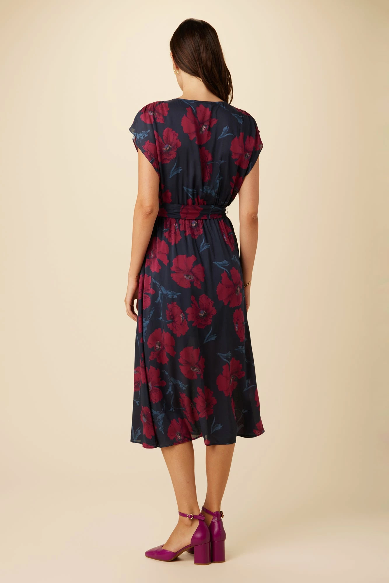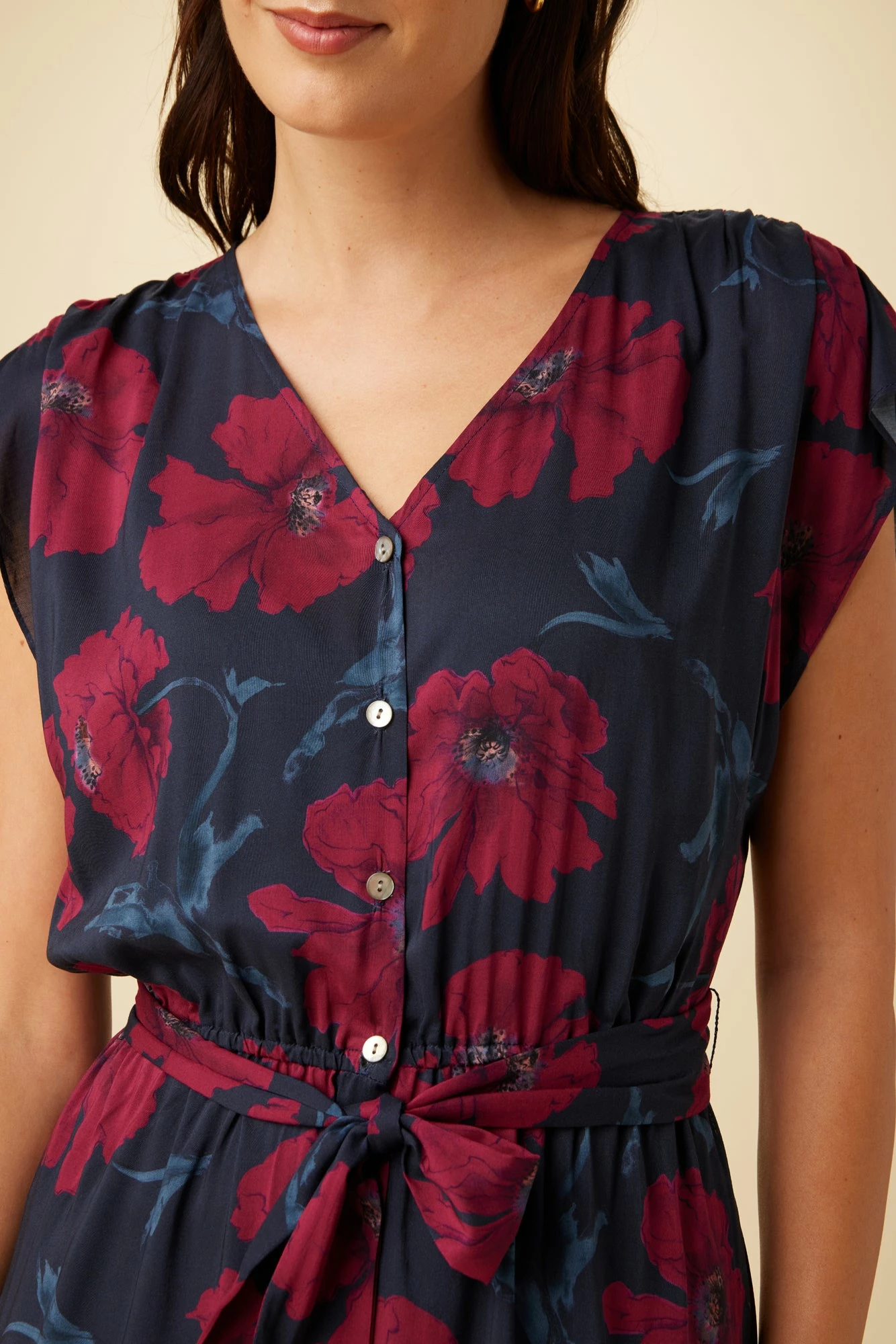 Button front, short sleeve dress featuring a v-neckline, tie waist detail and slip lining. This breezy dress is made from sustainable ECOVERO™ Viscose fabric, with an upcycled lining.