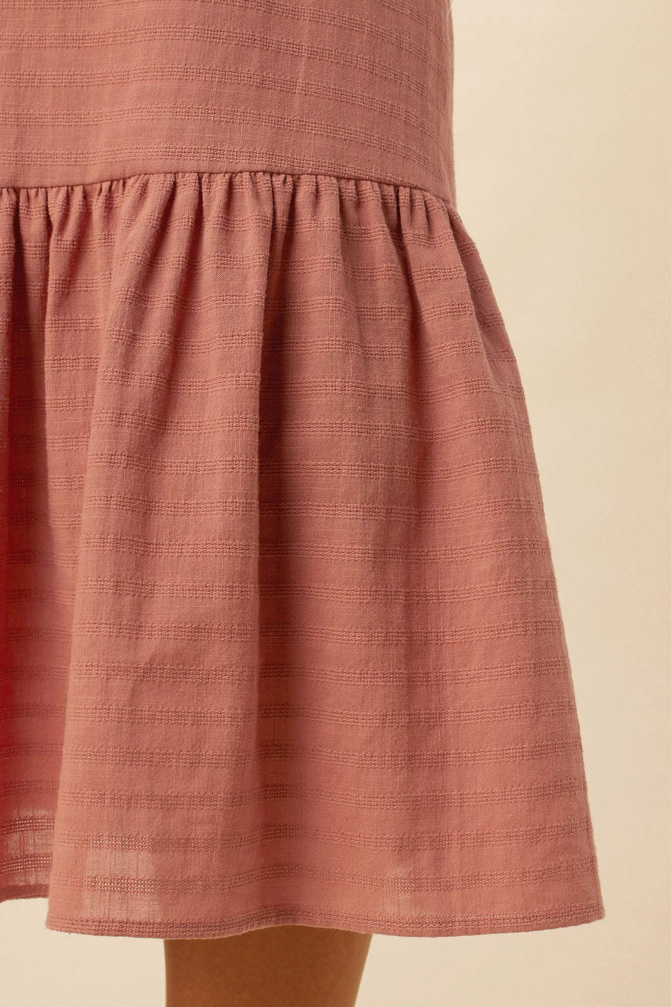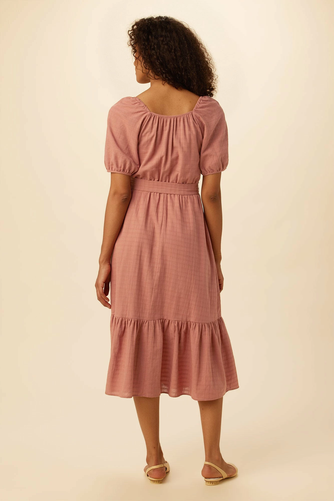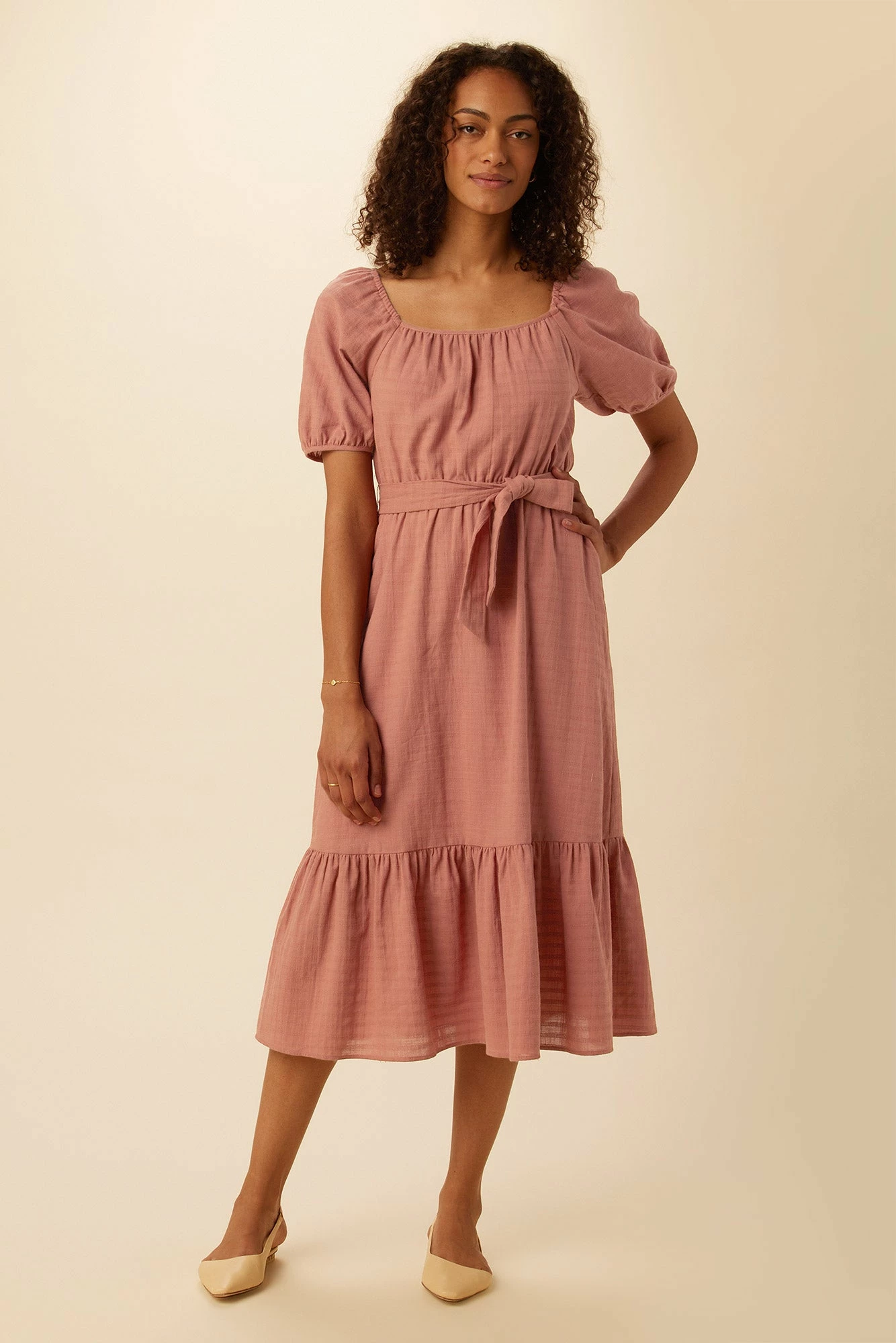 Short sleeve midi dress with a square neckline, ruffle hem and tie waist detail, made from 100% Organic Cotton.