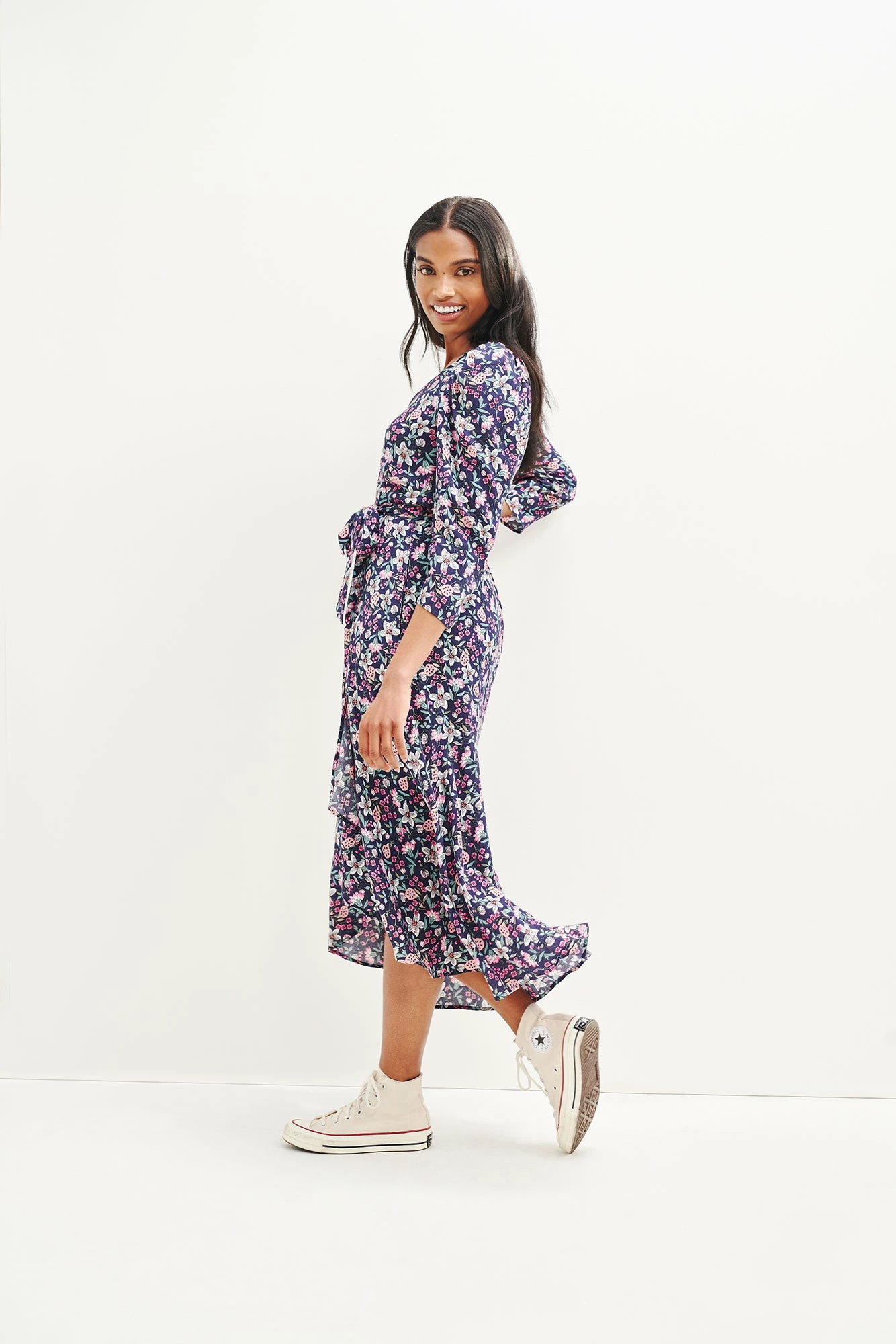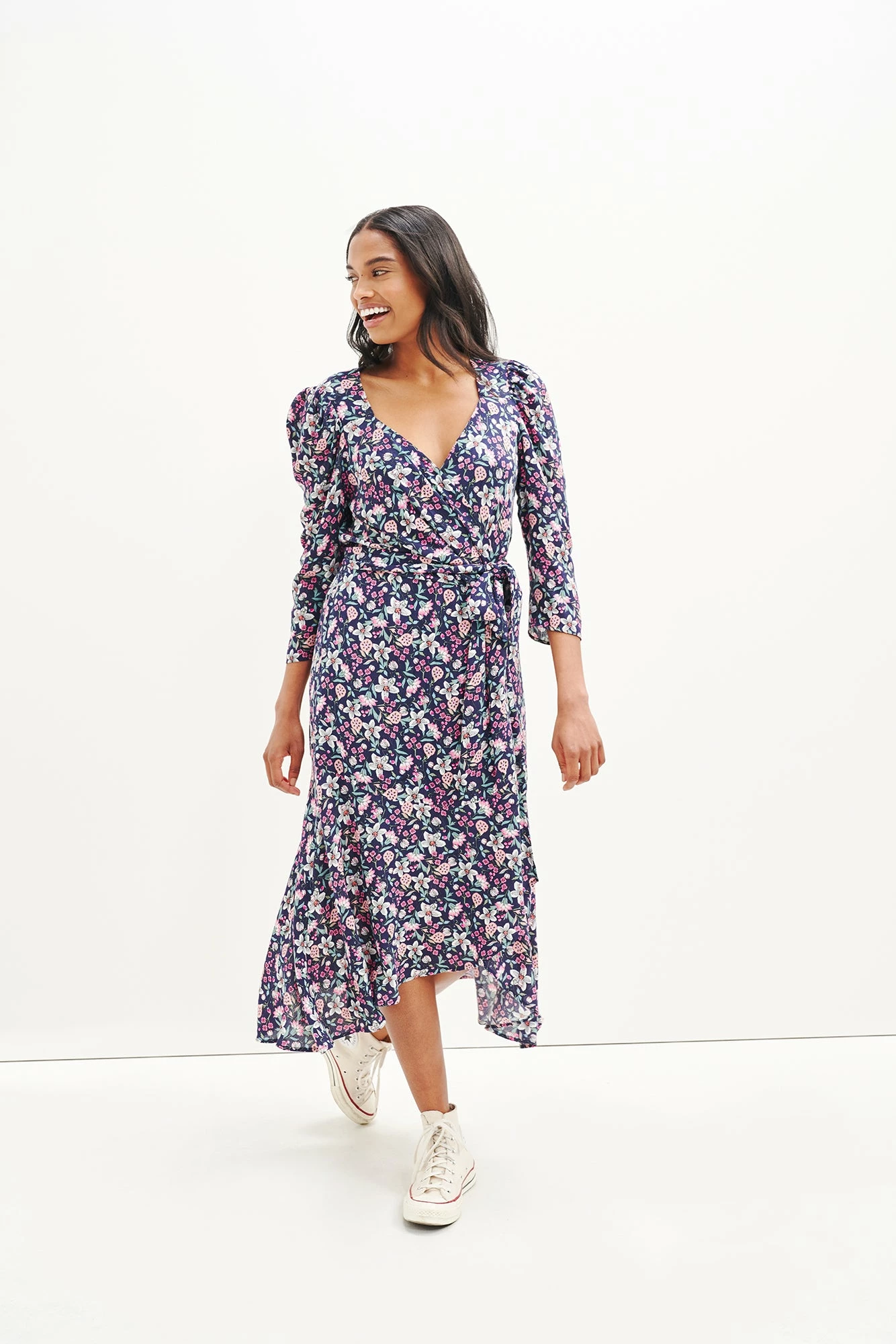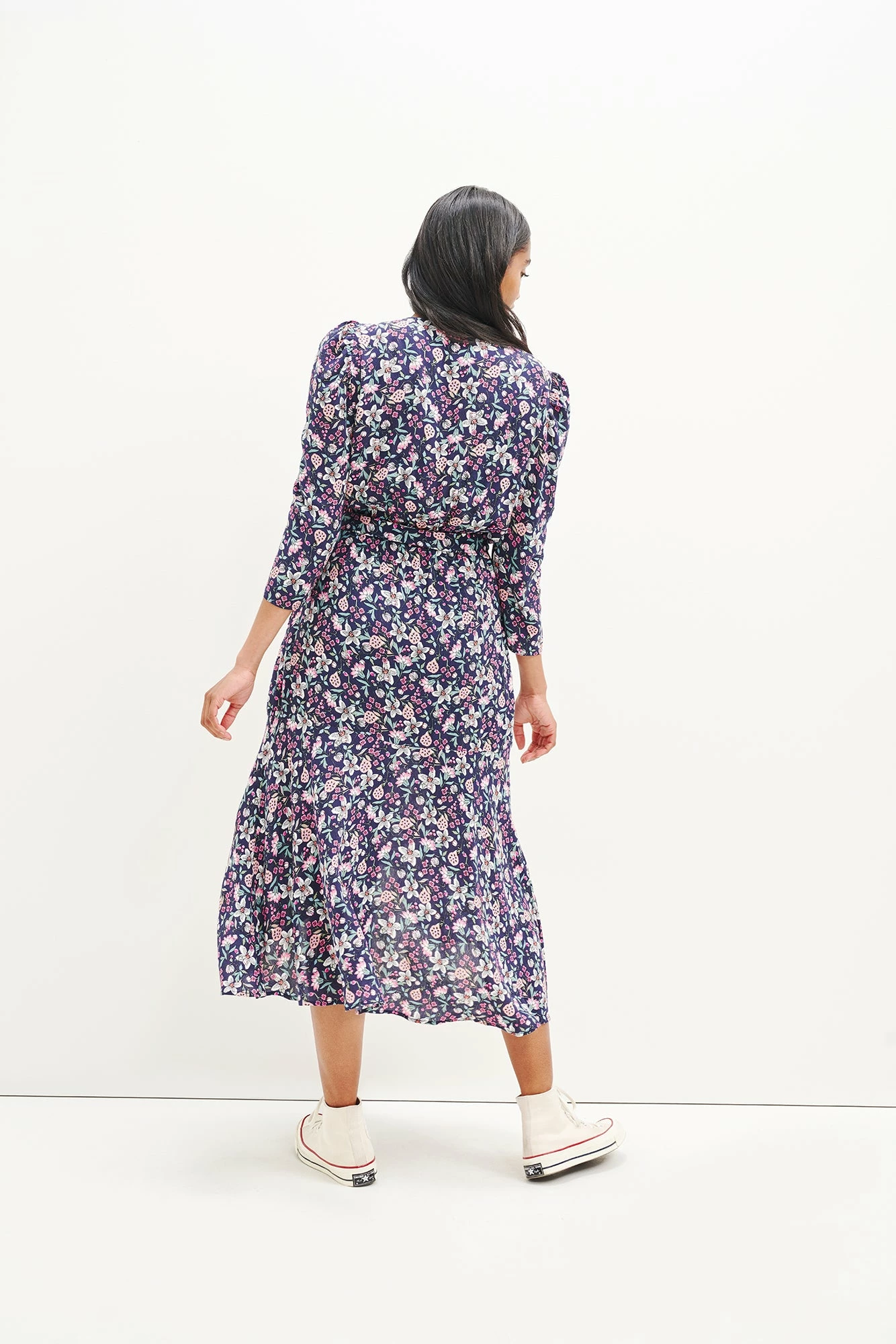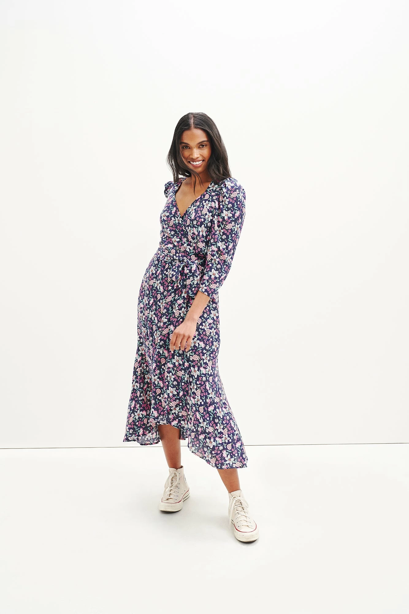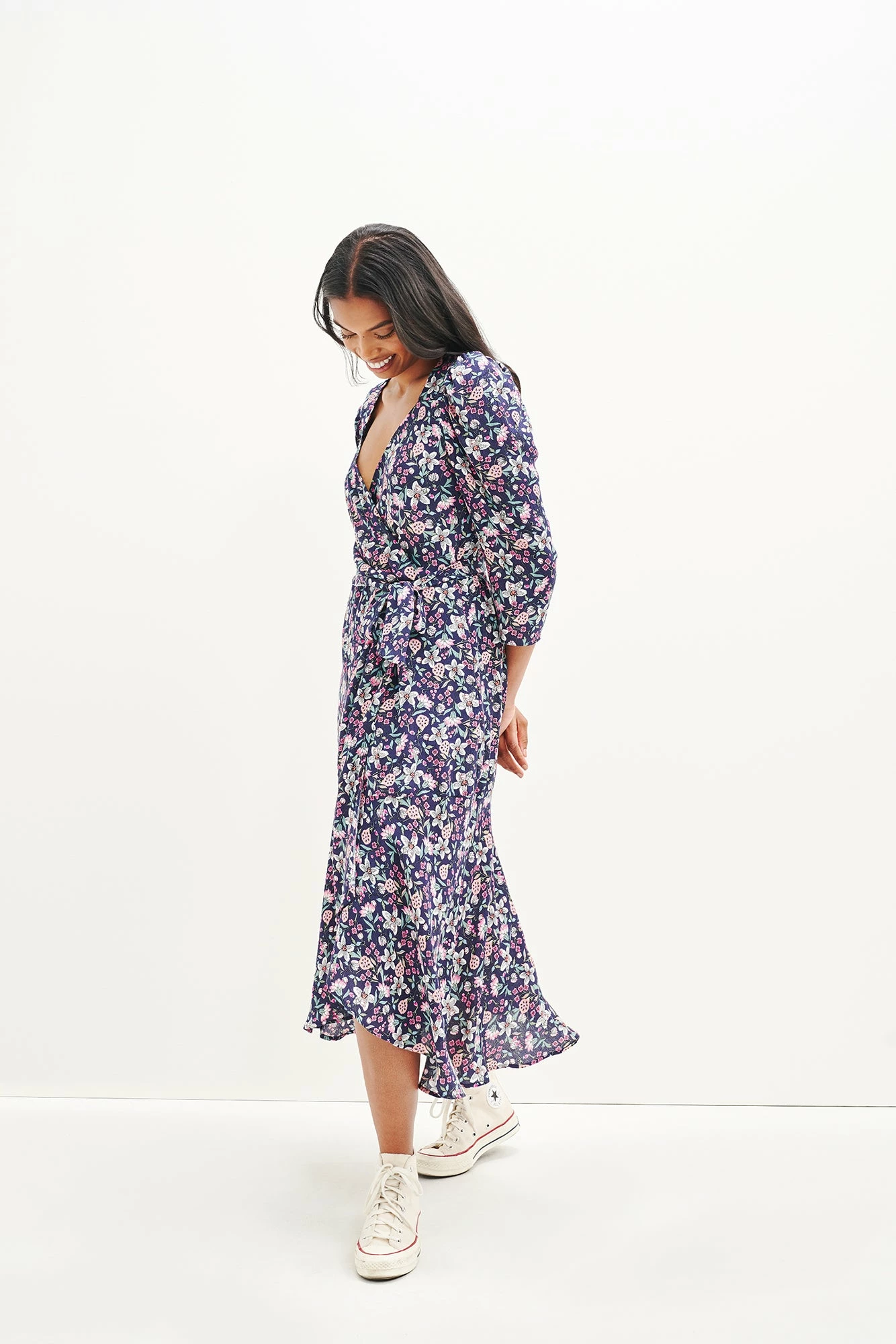 Midi length wrap dress with an adjustable waist tie and volume at the shoulders. Made from upcycled rayon as part of our commitment to repurpose old materials and reduce waste.