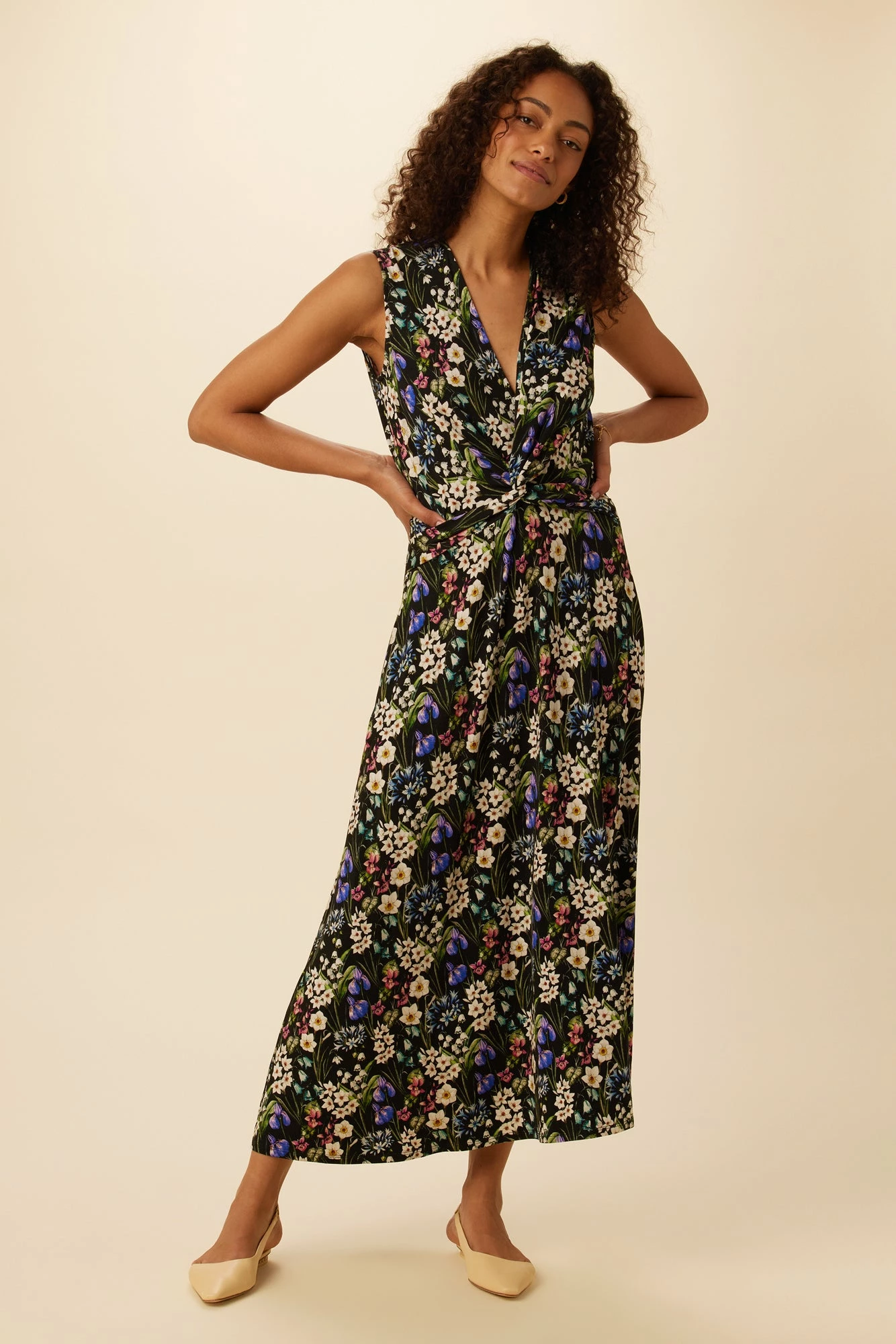 V-neck midi dress featuring side pockets and twist front detailing at the waist, comes with a slip lining. Made from a mix of Viscose & Spandex for stretch, this easy silhouette is as comfortable as it is flattering.