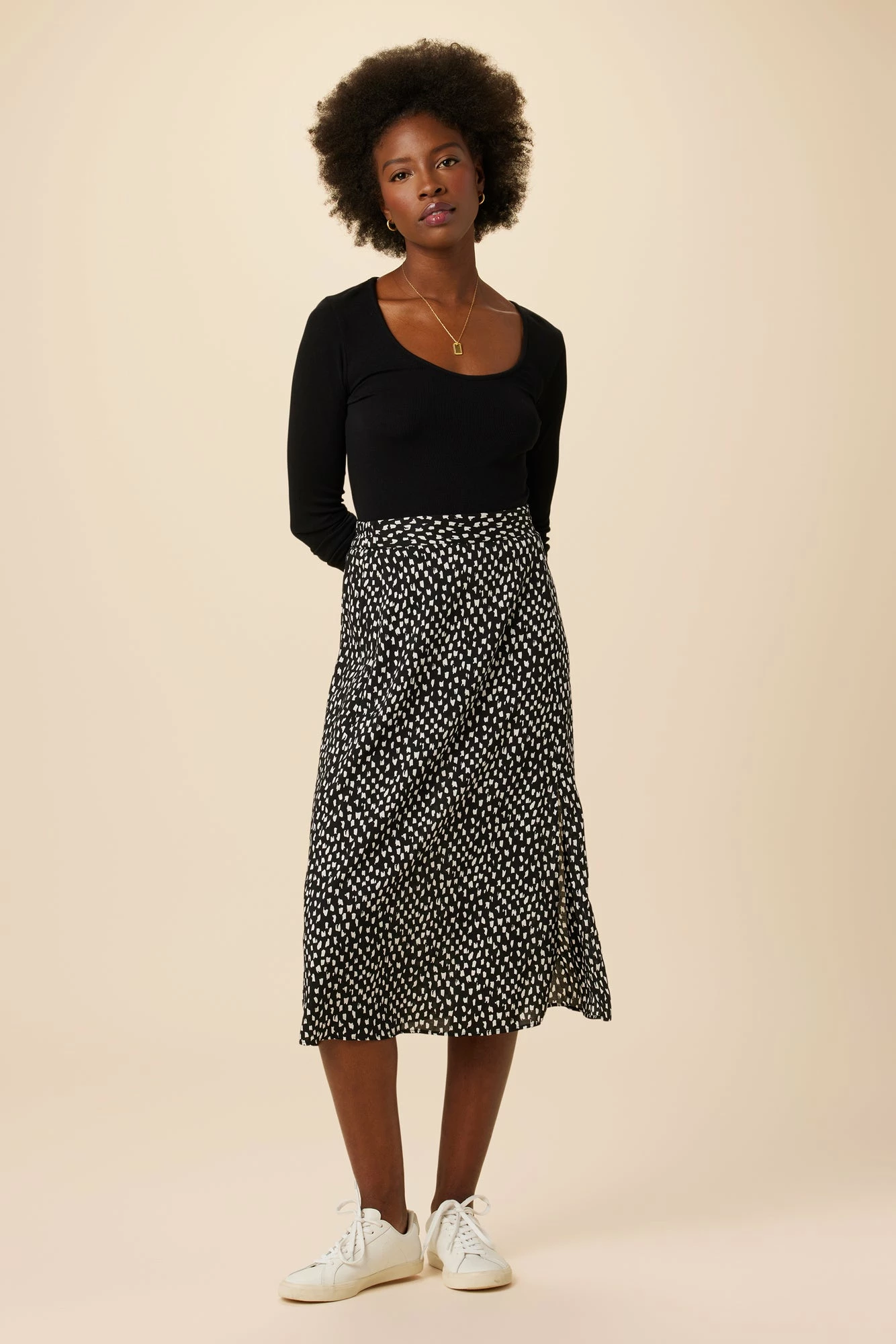 - A-line skirt featuring side slit and elastic waist in back.Â