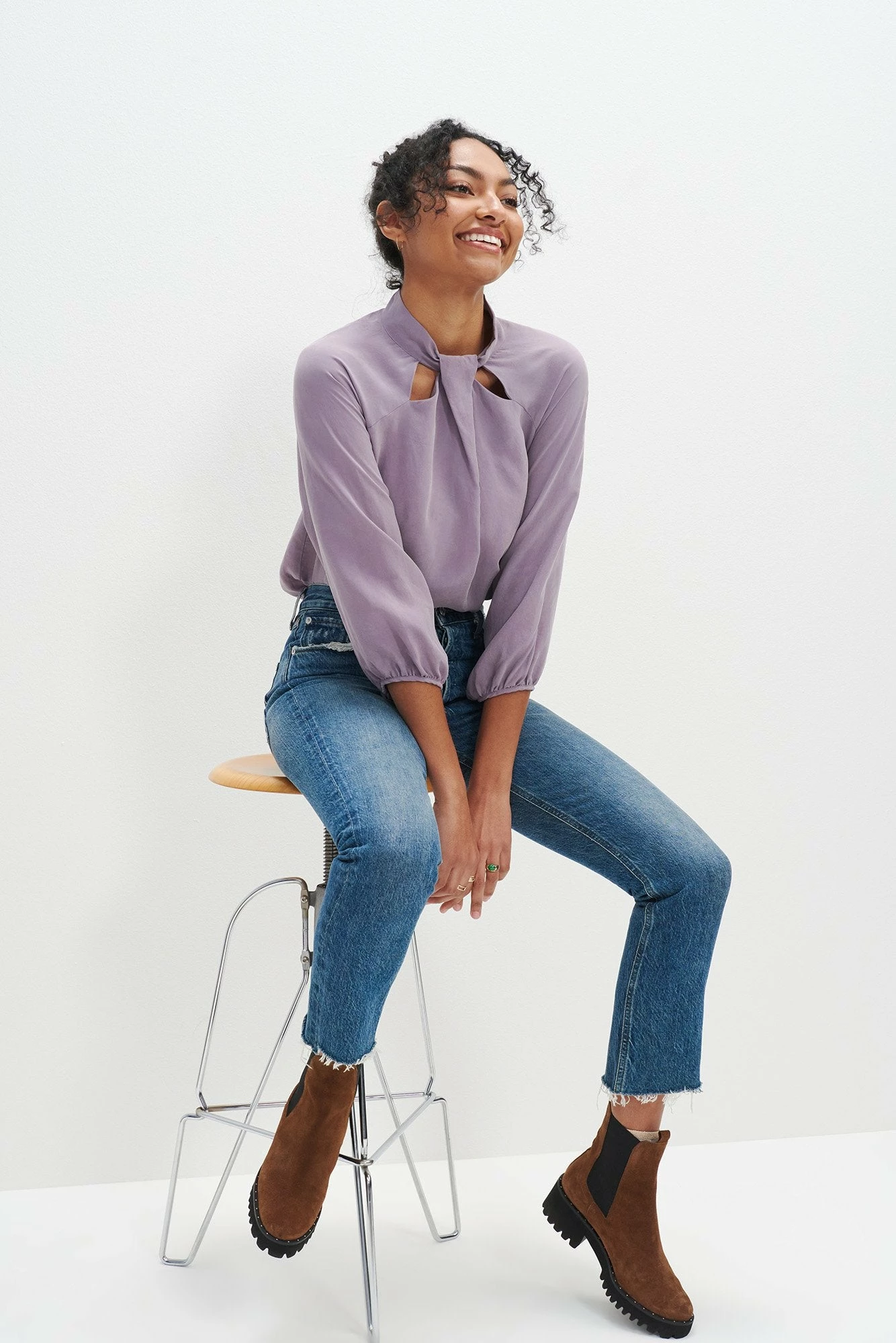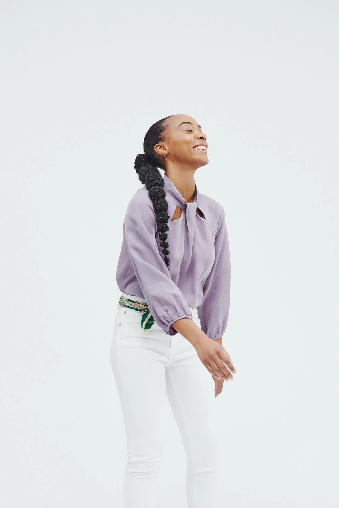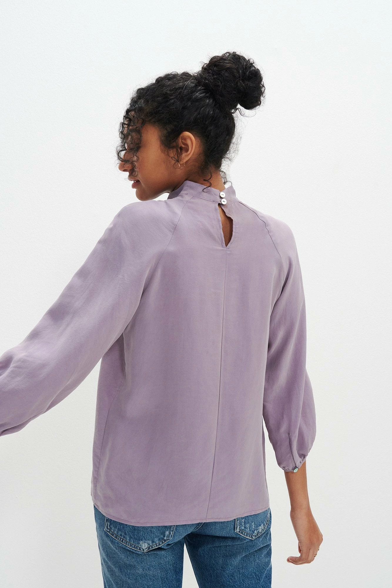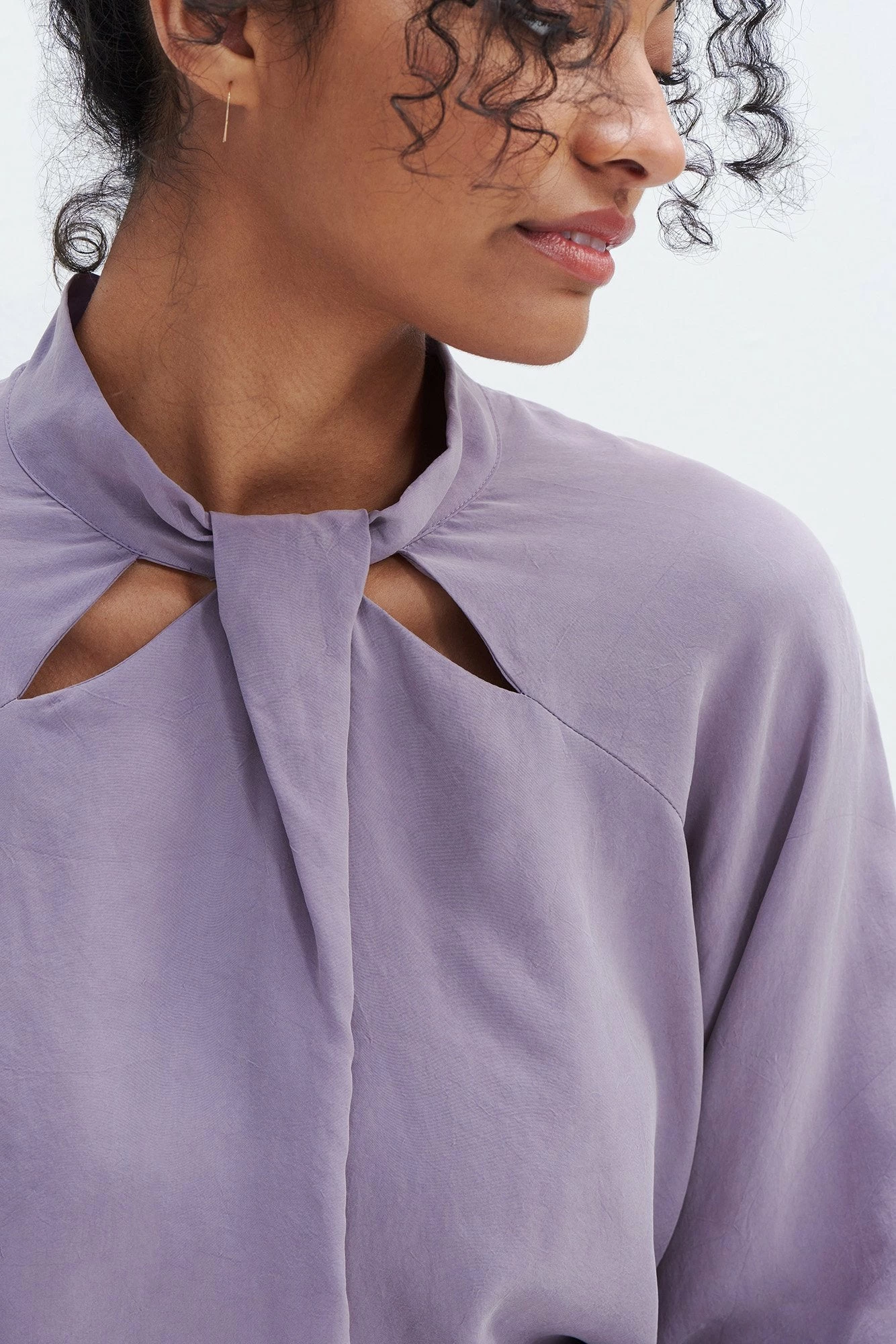 3/4 sleeve blouse with a fixed twist at the neck and a double button keyhole opening at the back neck. Made in our softest Cottonseed Cupro, a zero-waste fabric made entirely from discarded cotton waste.