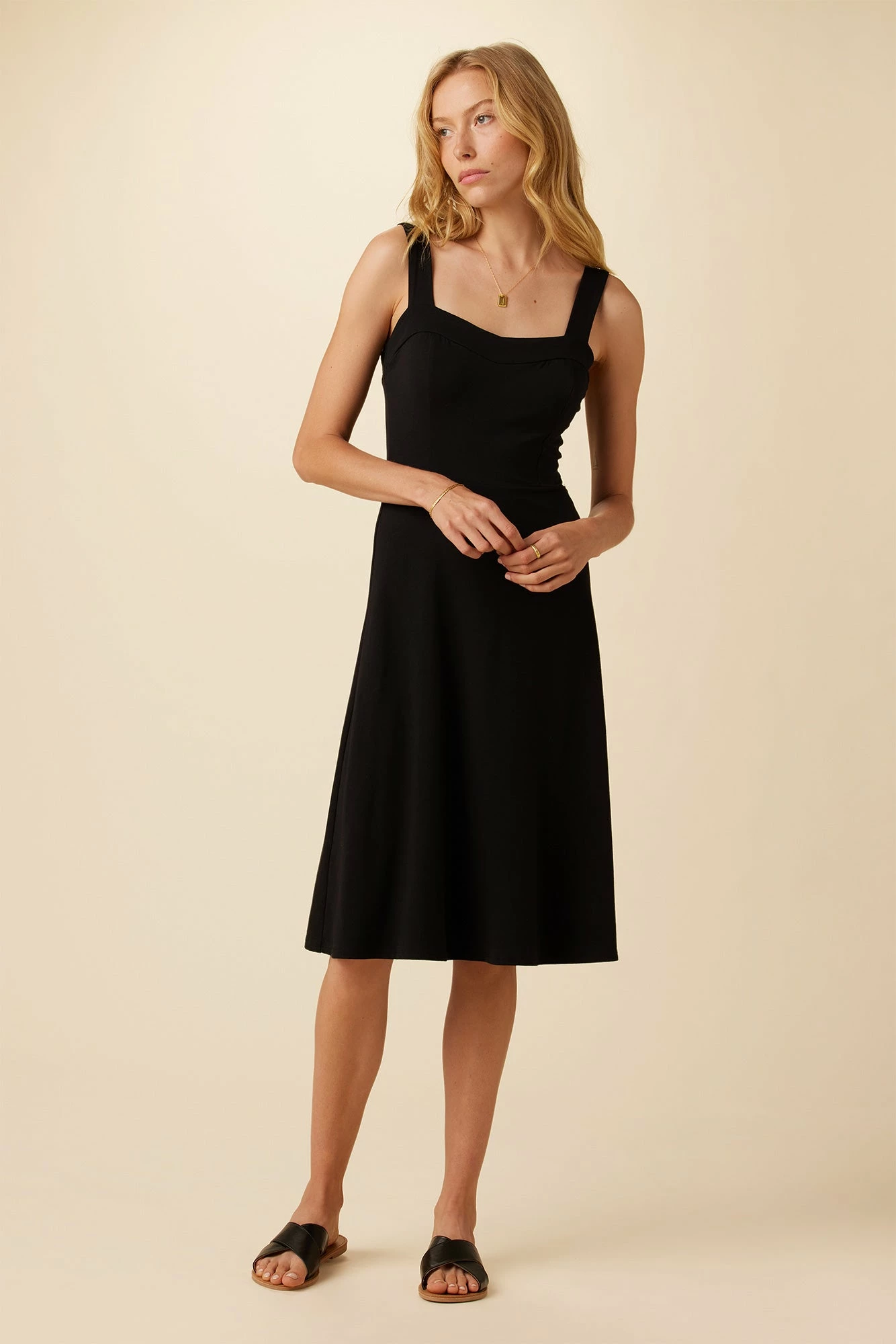 Midi length dress featuring slim fitting bodice with seam details and an a-line skirt. Made in our luxe Reverie Knit fabric, this easy dress is as comfortable as it is flattering.