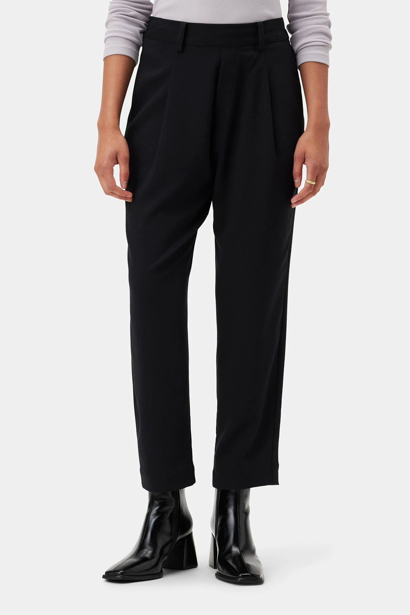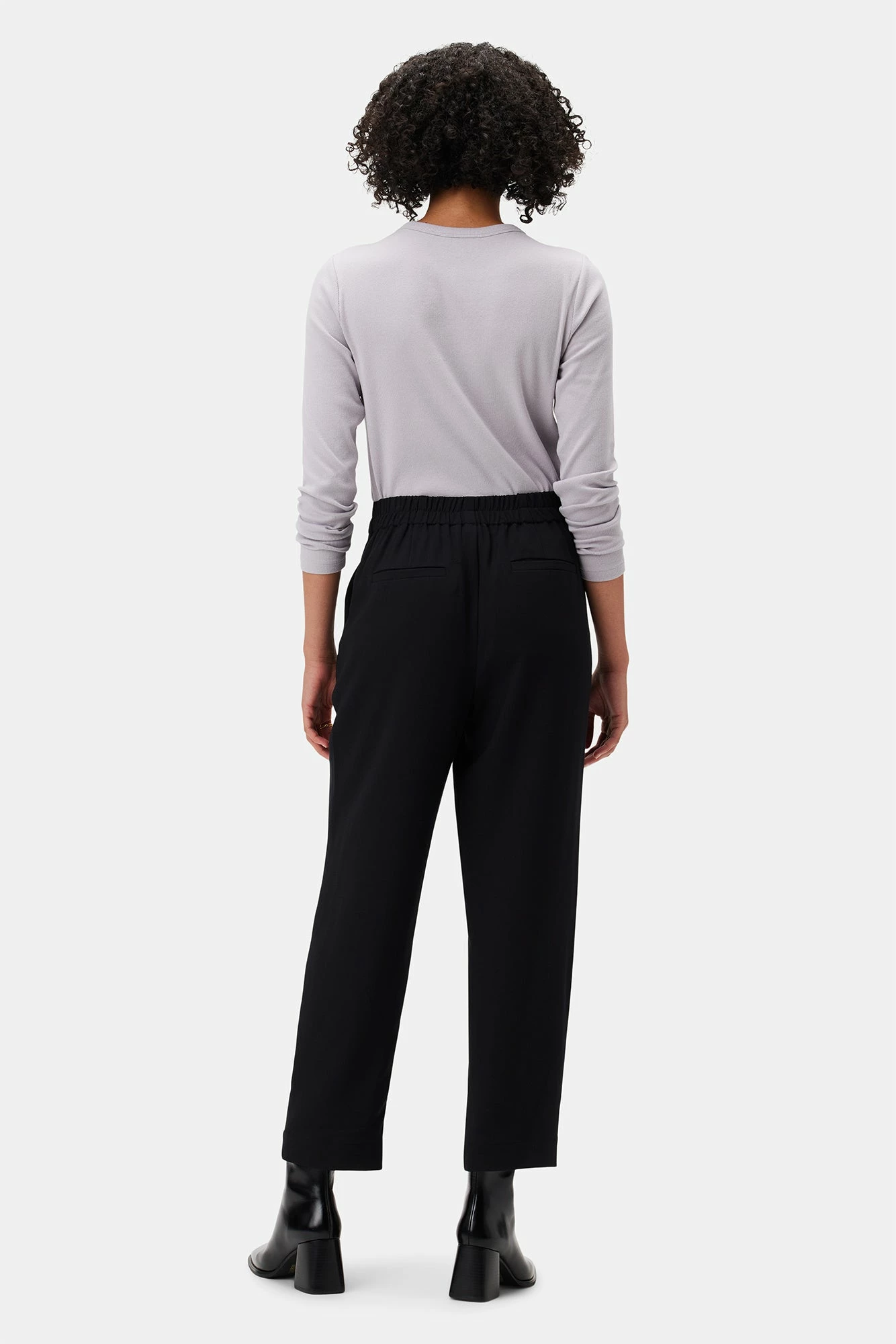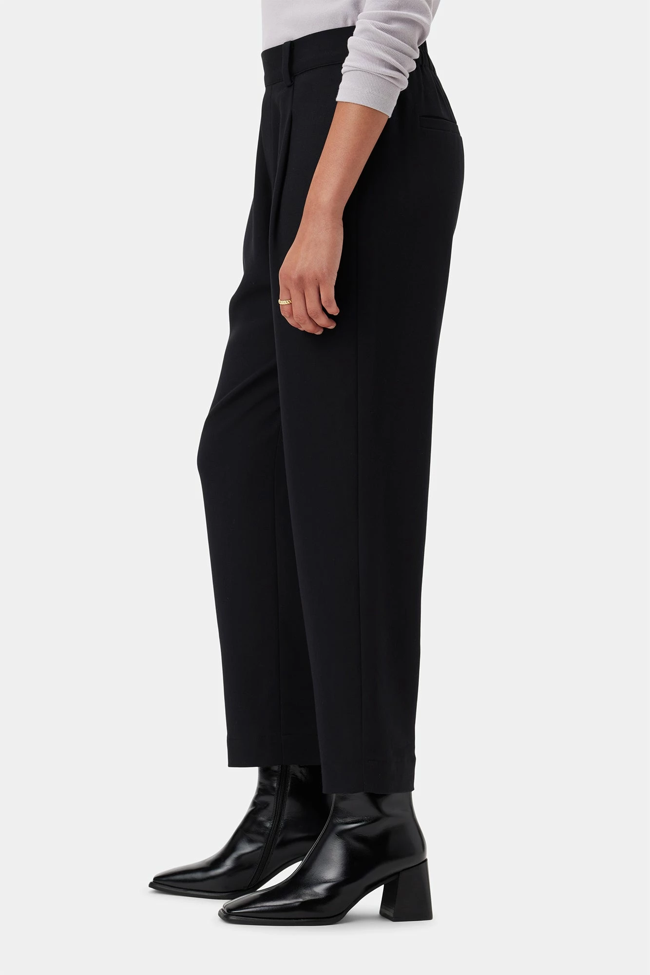 - Crop length trouser features flat front with faux fly, elastic at back waist, inseam side pockets, welt pockets at back and pleat detail at front.
