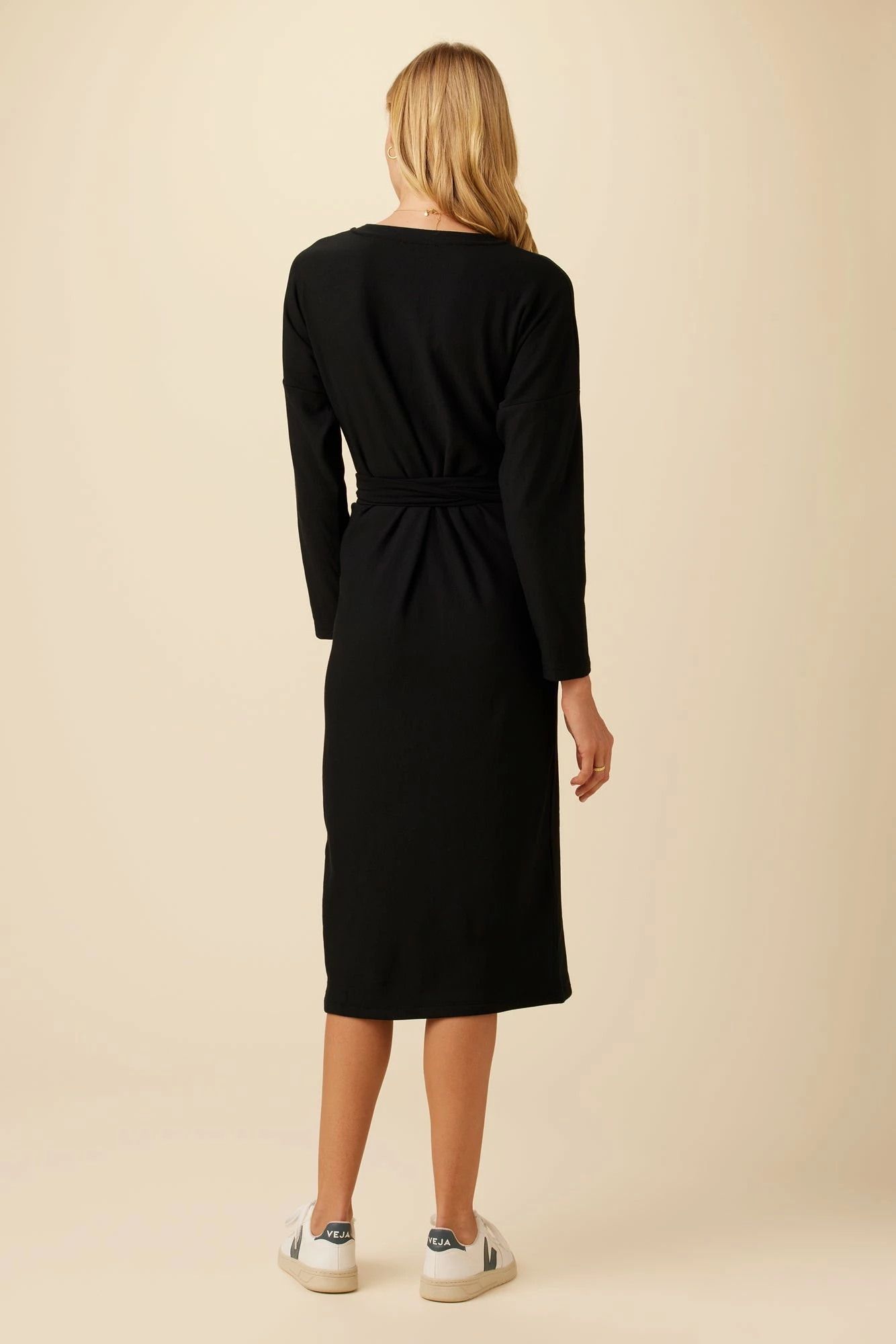 Long sleeve midi dress with an adjustable wrap tie and easy, straight silhouette. Made from our cozy fleece fabrics, this dress is as comfortable as it is flattering.