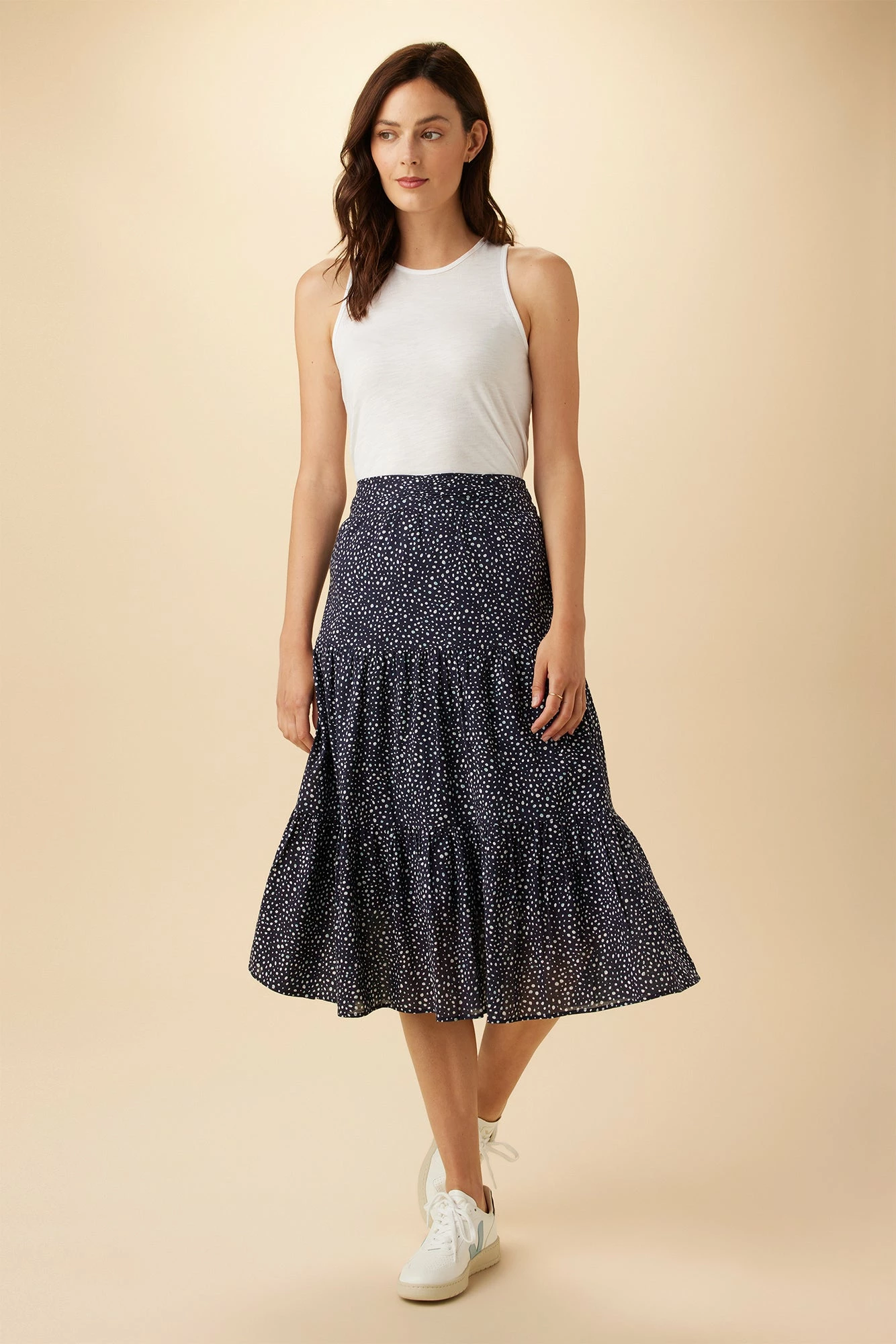 - Midi-length tiered skirt featuring cotton lining, gather on front waist, smocking at back waist.Â
