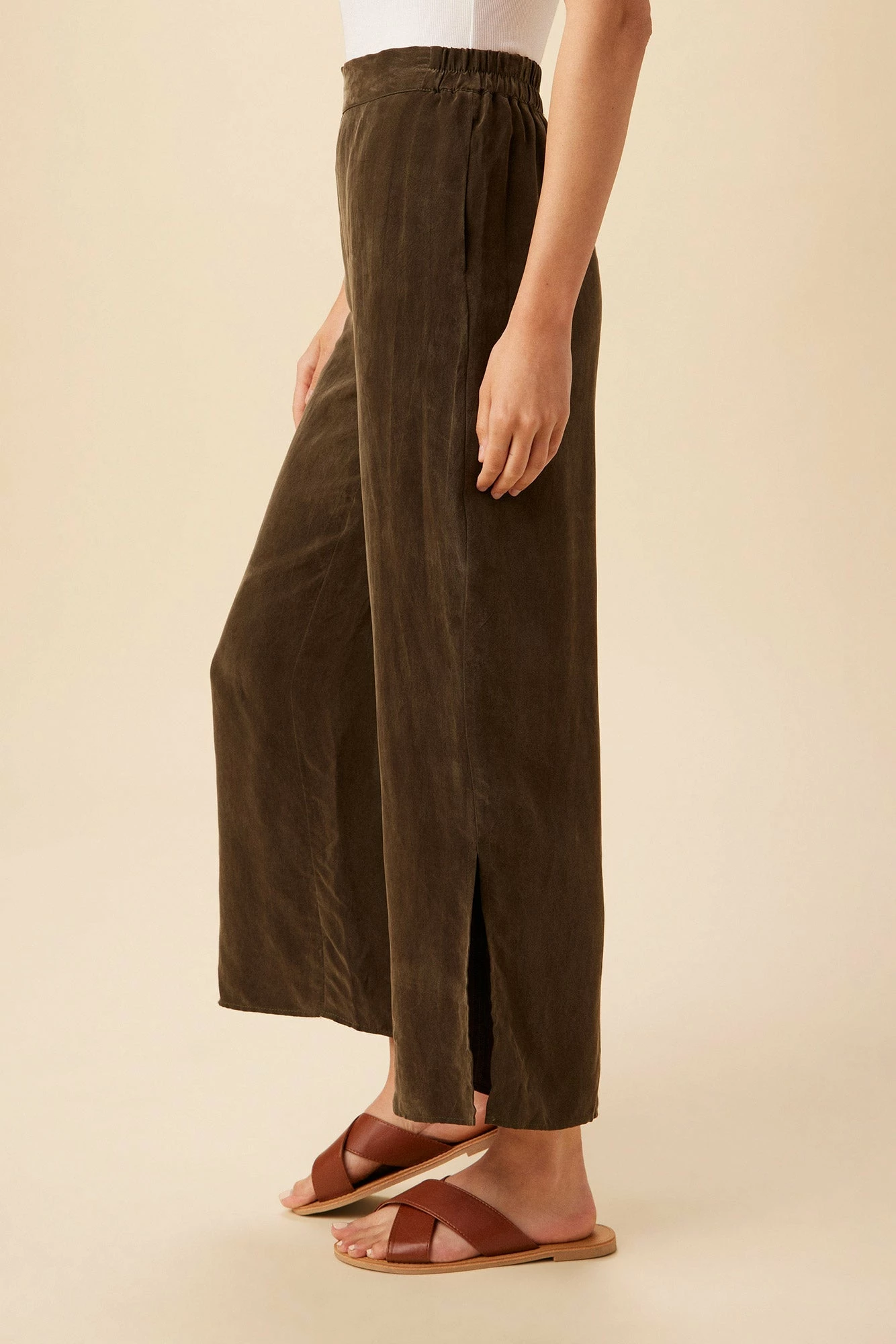 High waisted pants featuring a wide leg with side slits, pockets, and elastic at the back waist. Made in our softest Cottonseed Cupro, a plant-based fabric made entirely from cotton waste.