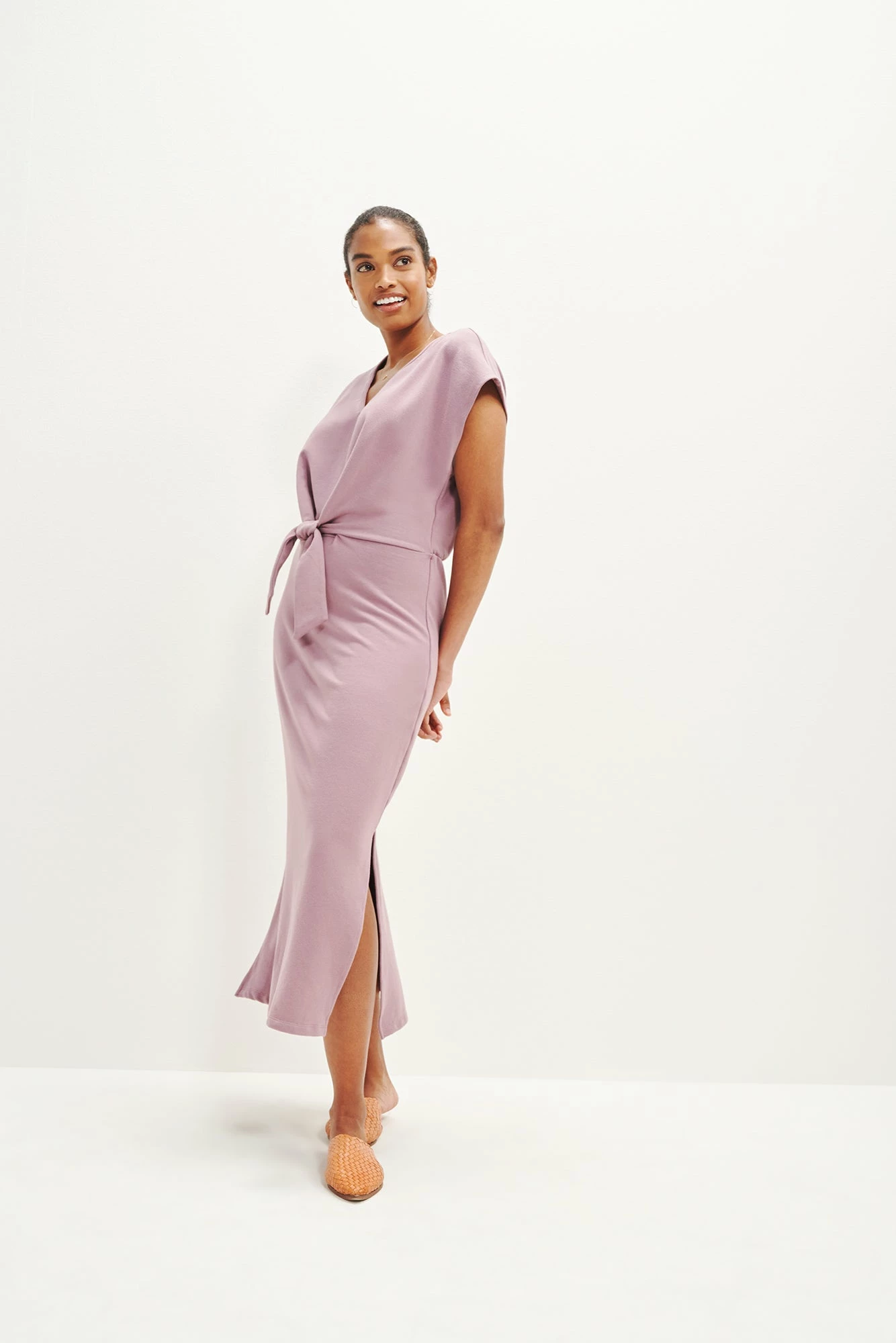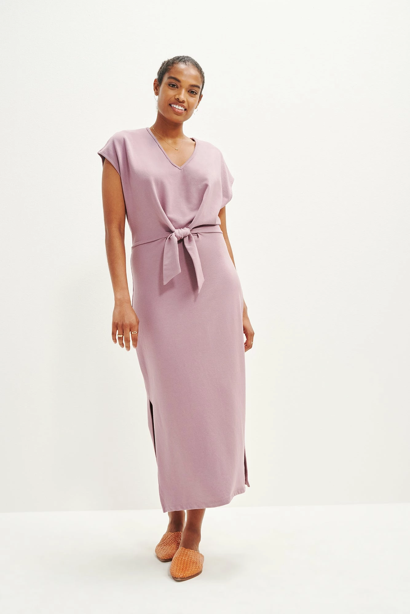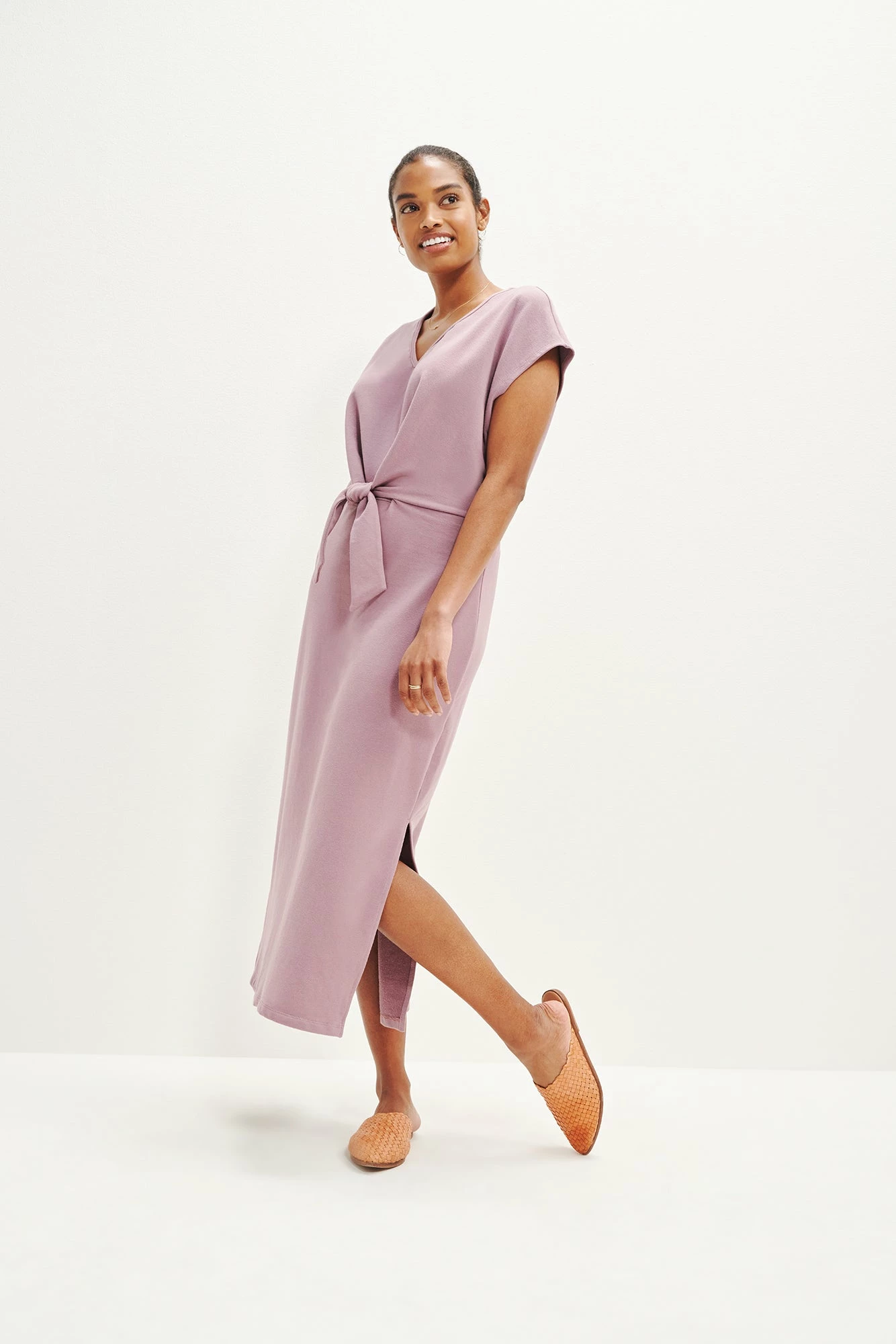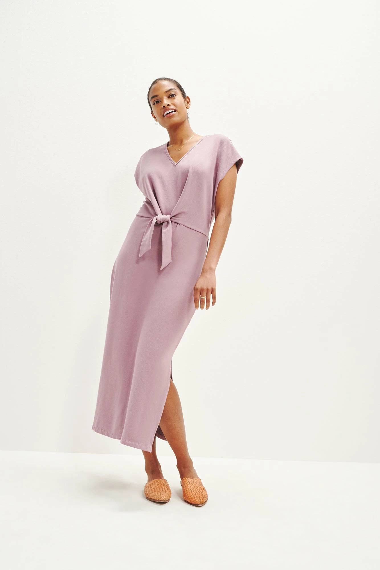 Short sleeve midi dress with a v-neckline, fixed waist tie, and elastic at the back for comfort and adjustability. Made in Reverie Terry, our luxe blend of Organic Cotton and Modal that’s perfect for everyday wear.
