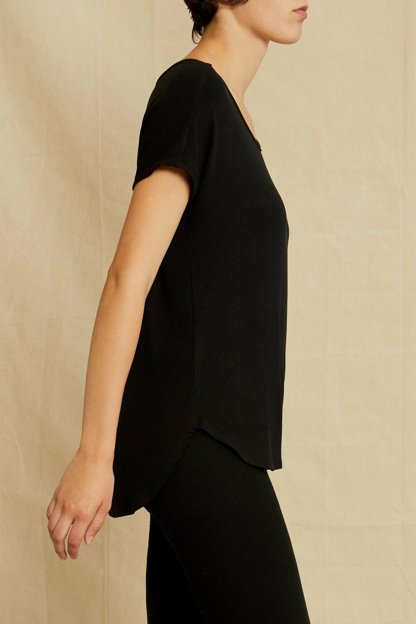 Relaxed fit v-neck tee with short sleeves and a shirttail hemline. Made in our silky-smooth Dream Rib, a sustainable blend of beechwood tree fibers.