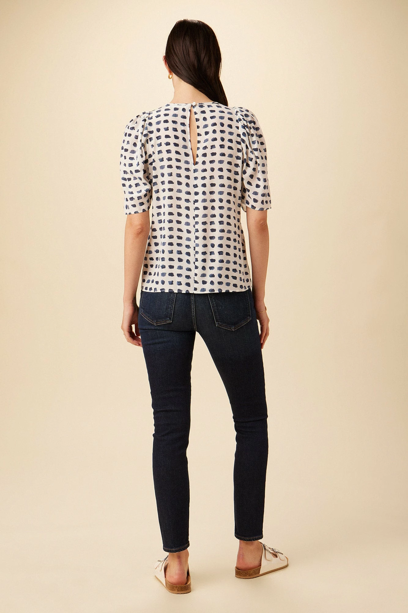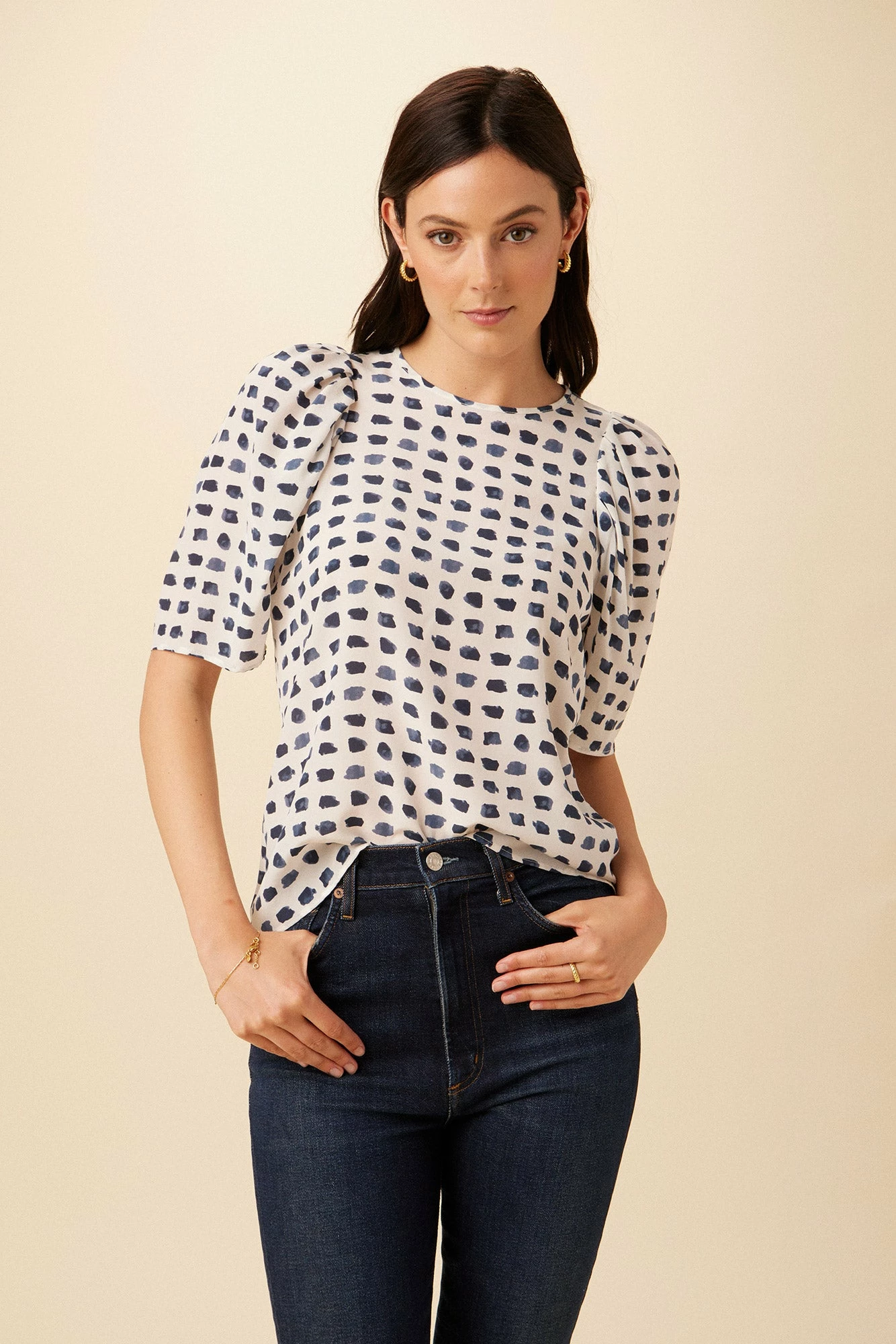 Relaxed fit, crewneck blouse featuring loop and button closure and puff sleeves with box pleats, made in our luxe Washable Silk. We suggest pairing with your favorite high-rise or mid-rise bottoms.
