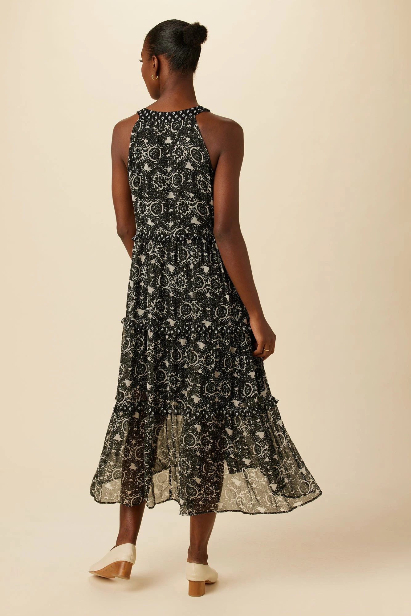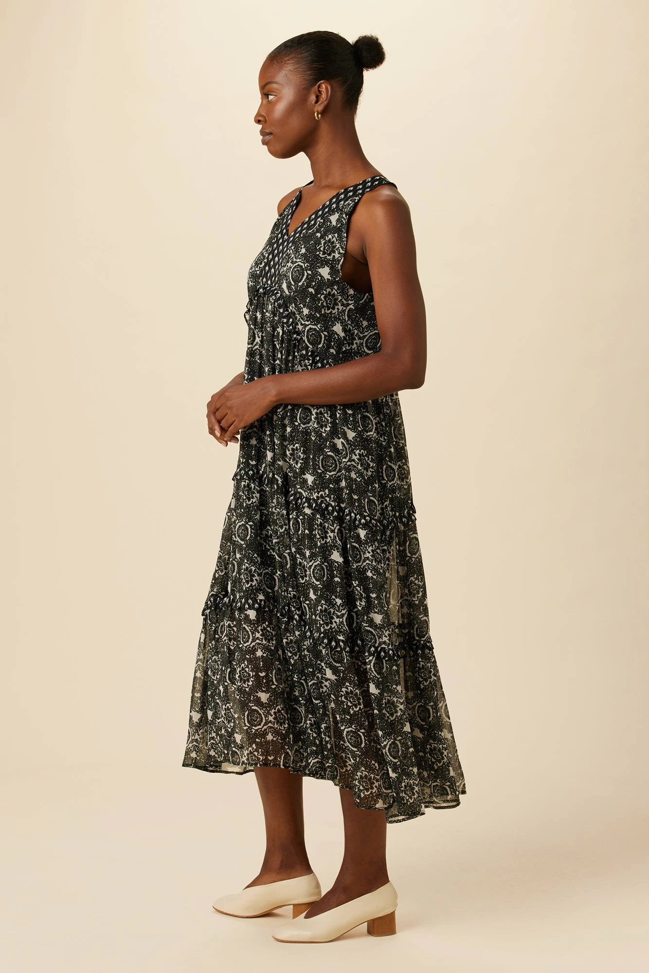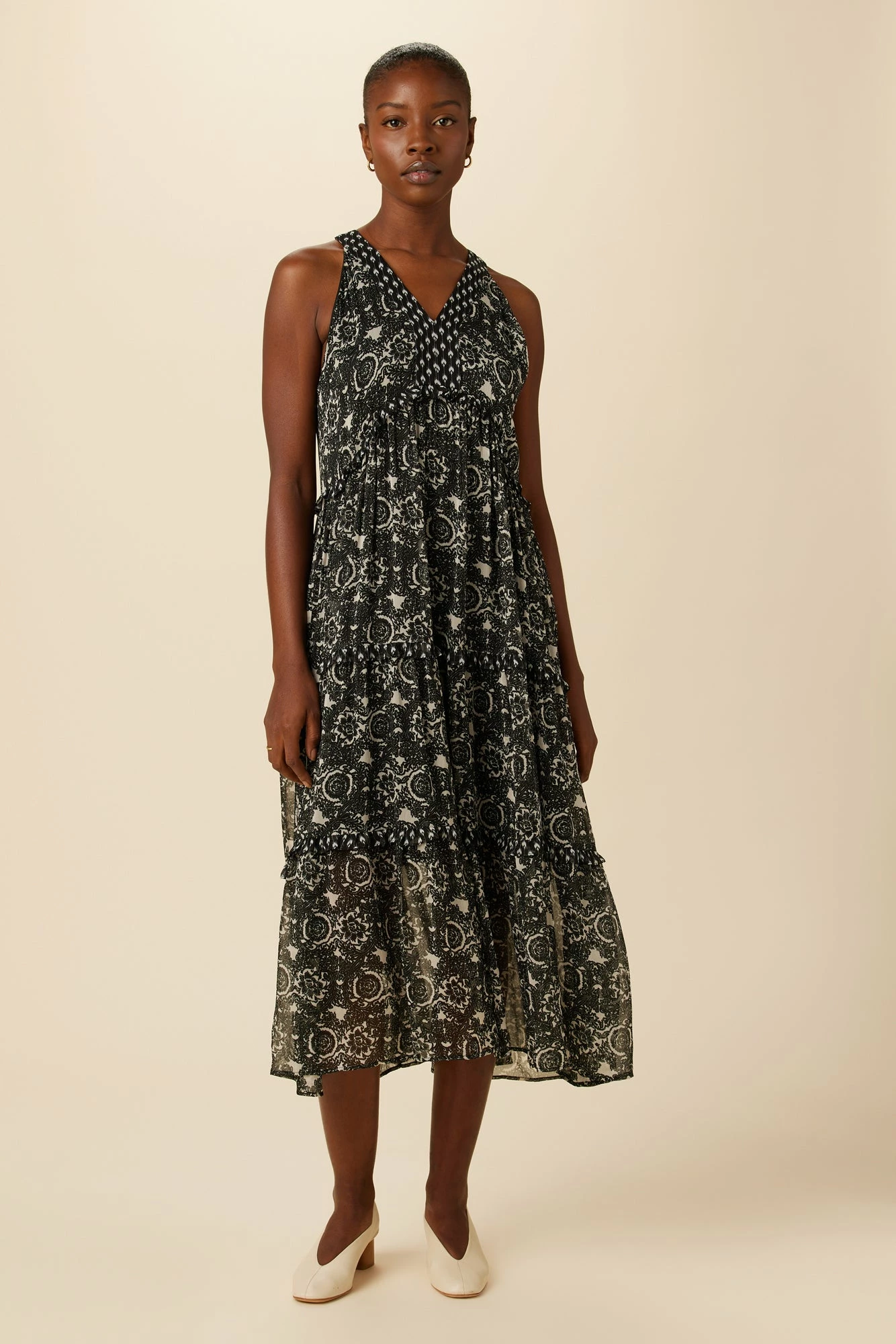 Sleeveless, relaxed fit maxi dress featuring tiered skirt with contrast print ruffle details. This breezy dress is made from our Viscose Chiffon fabric, with an upcycled polyester lining that extends to the knee.