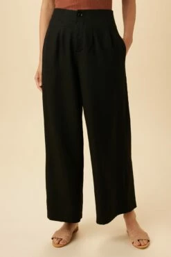 - High-rise pant featuring a full length silhouette, button front closure and pleated waist detail.