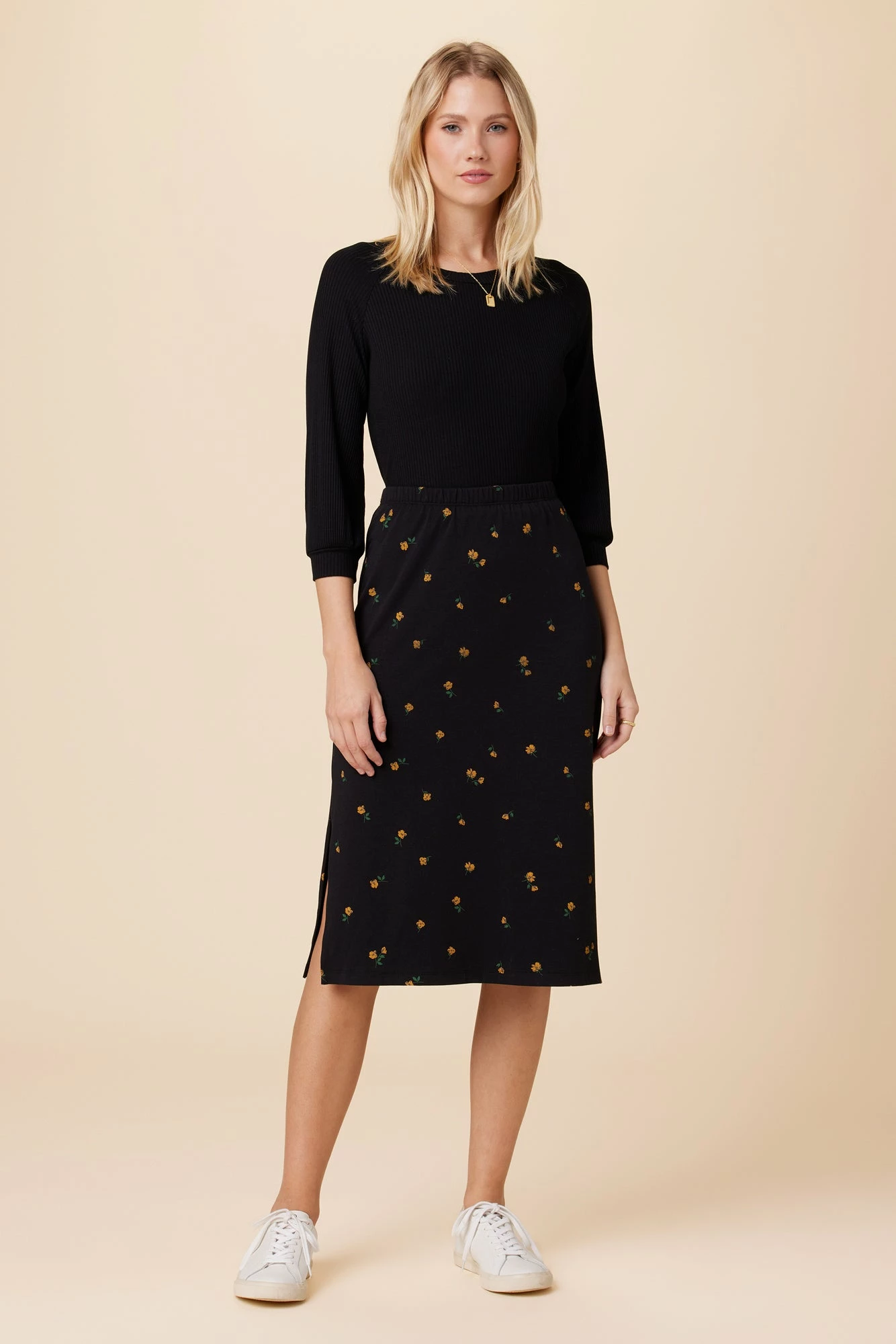 - Midi skirt with a straight silhouette and side slits that falls below the knee.