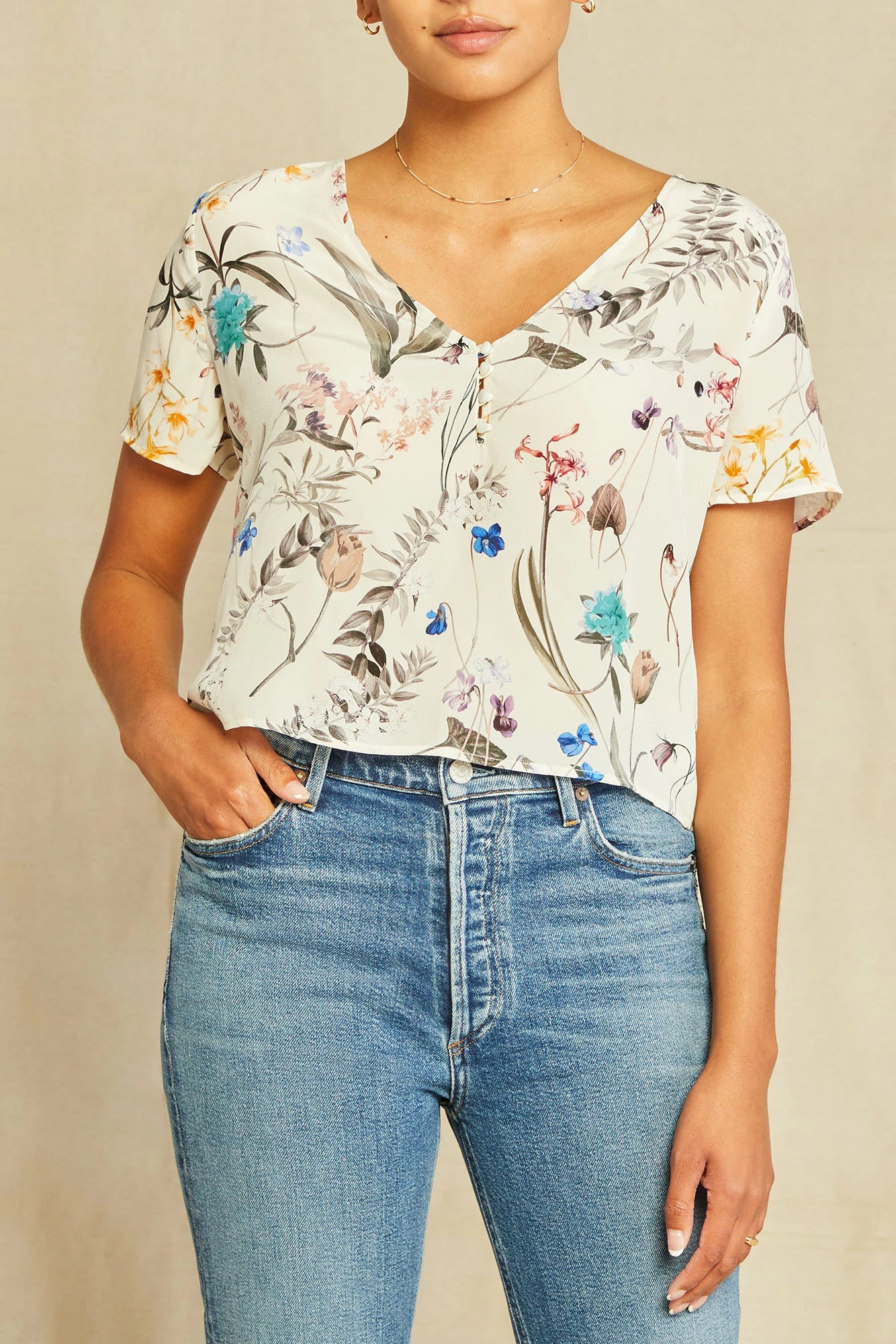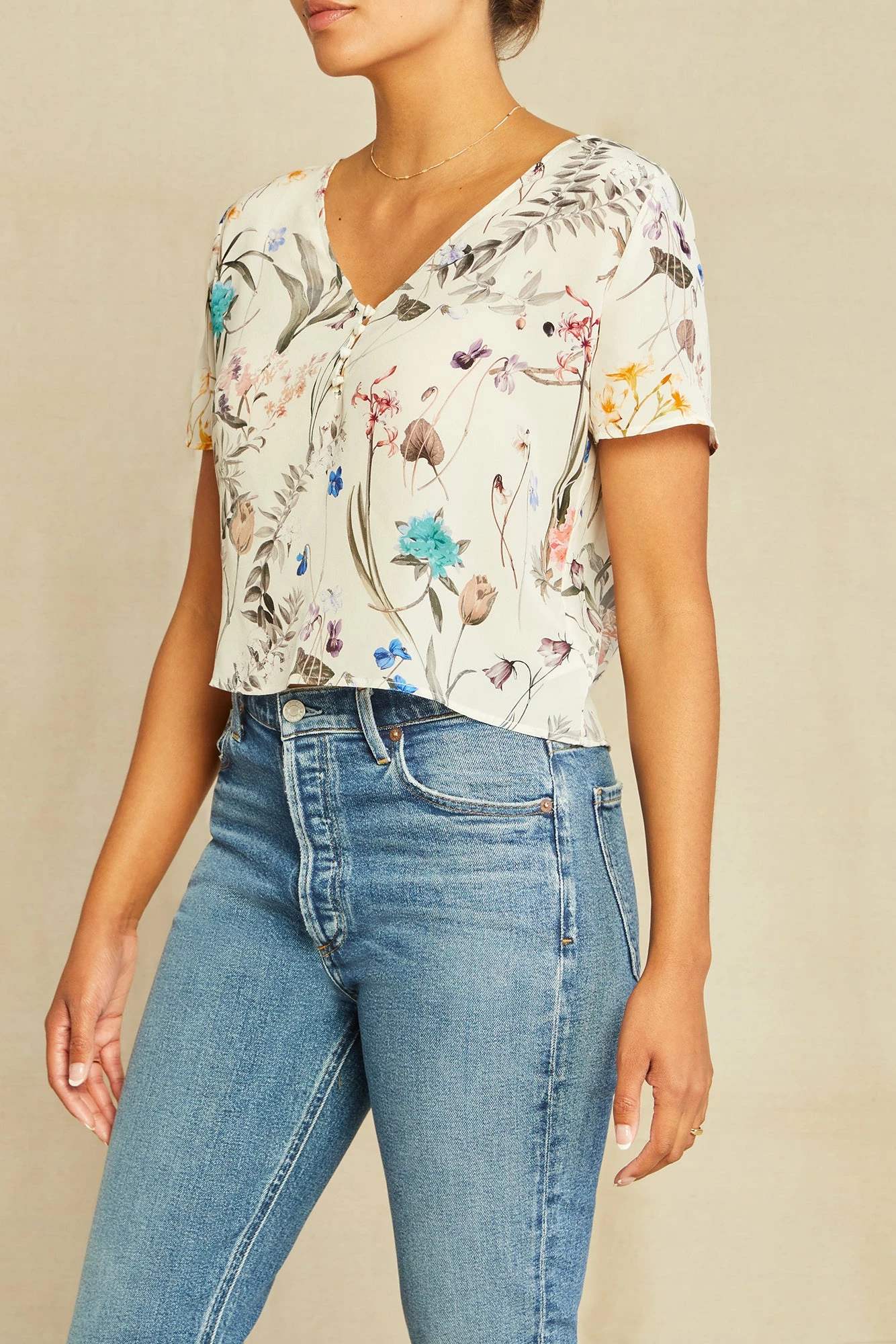 Short sleeve top with a v-neck and relaxed, cropped fit. Made from our luxurious Mulberry silk, this elevated basic is a must have for any wardrobe.