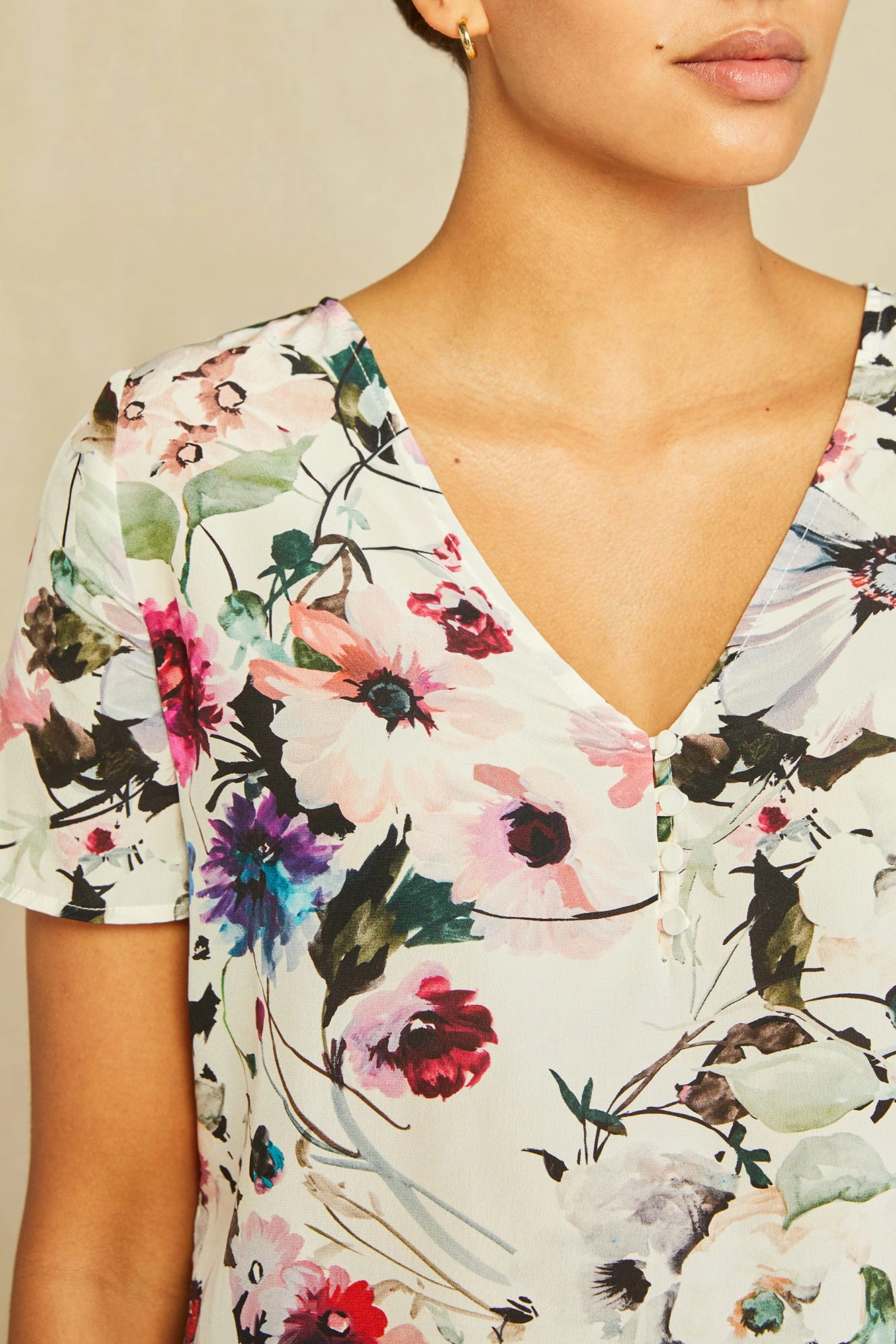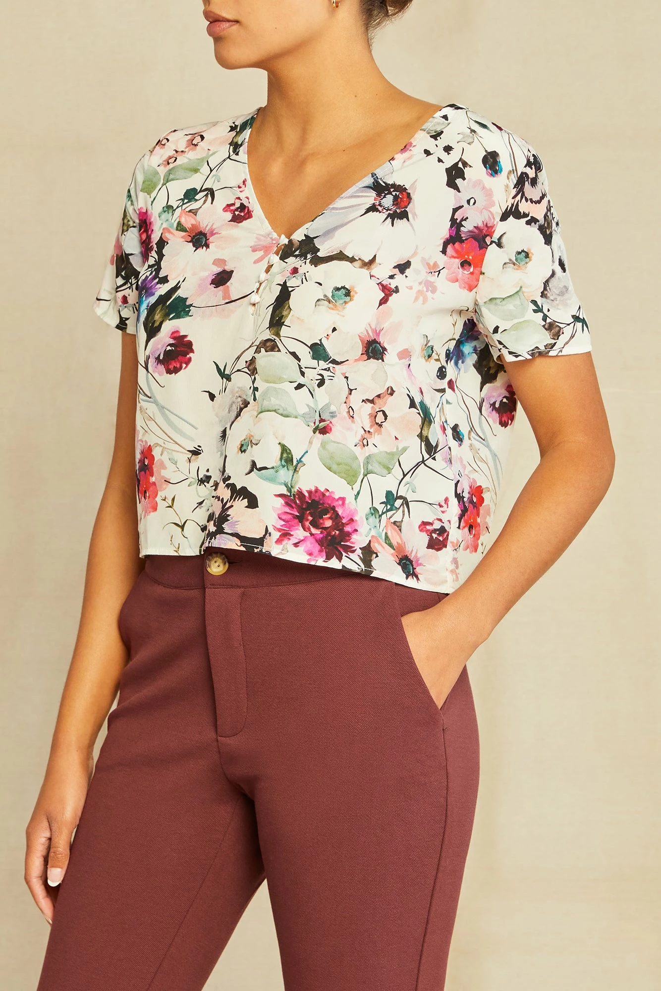 Short sleeve top with a v-neck and relaxed, cropped fit. Made from our luxurious Mulberry silk, this elevated basic is a must have for any wardrobe.